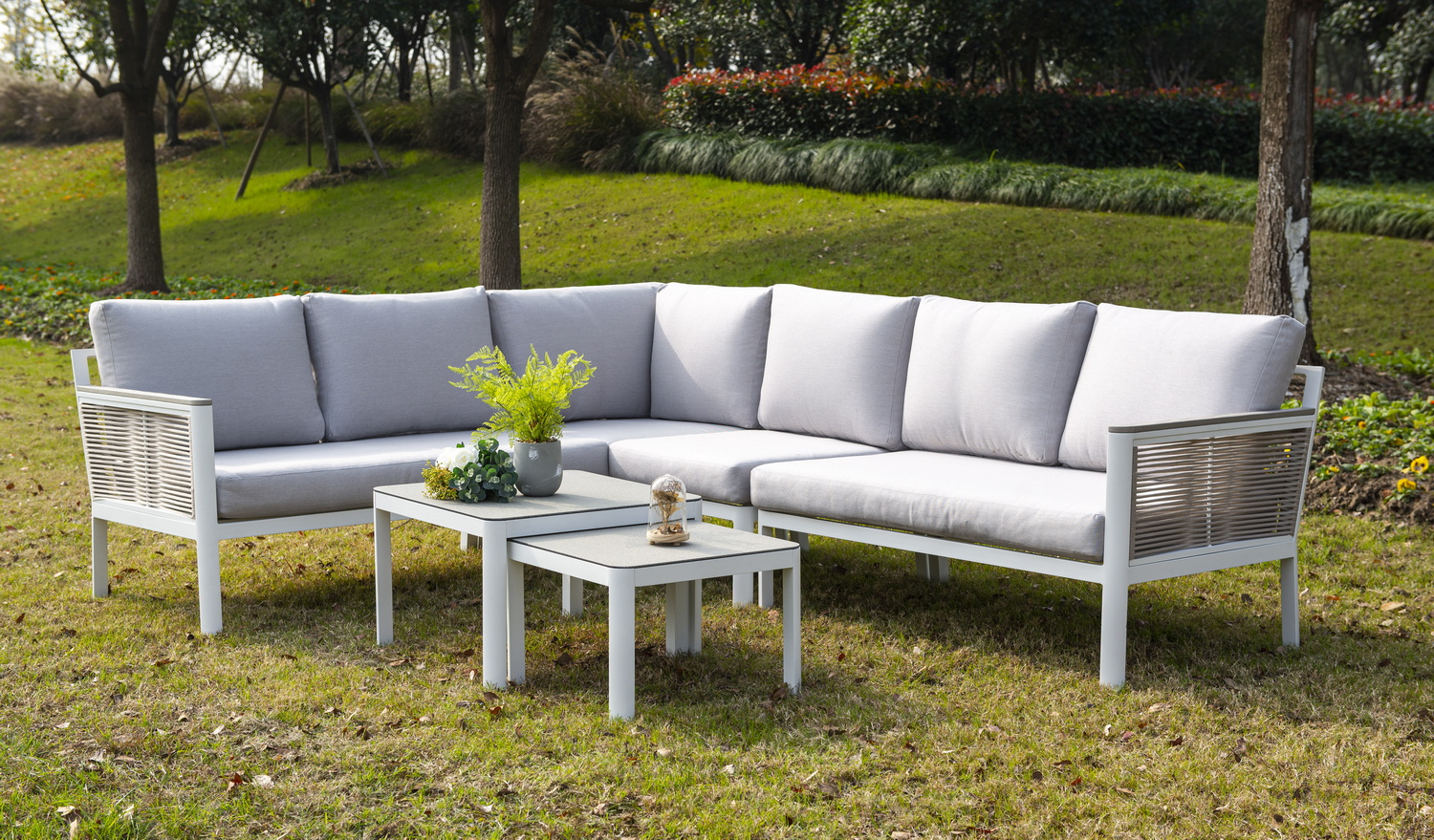 В основе находится алюминиевый каркас, который выступает в качестве устойчивой опоры. Мебель представлена в классическом белом цвете.