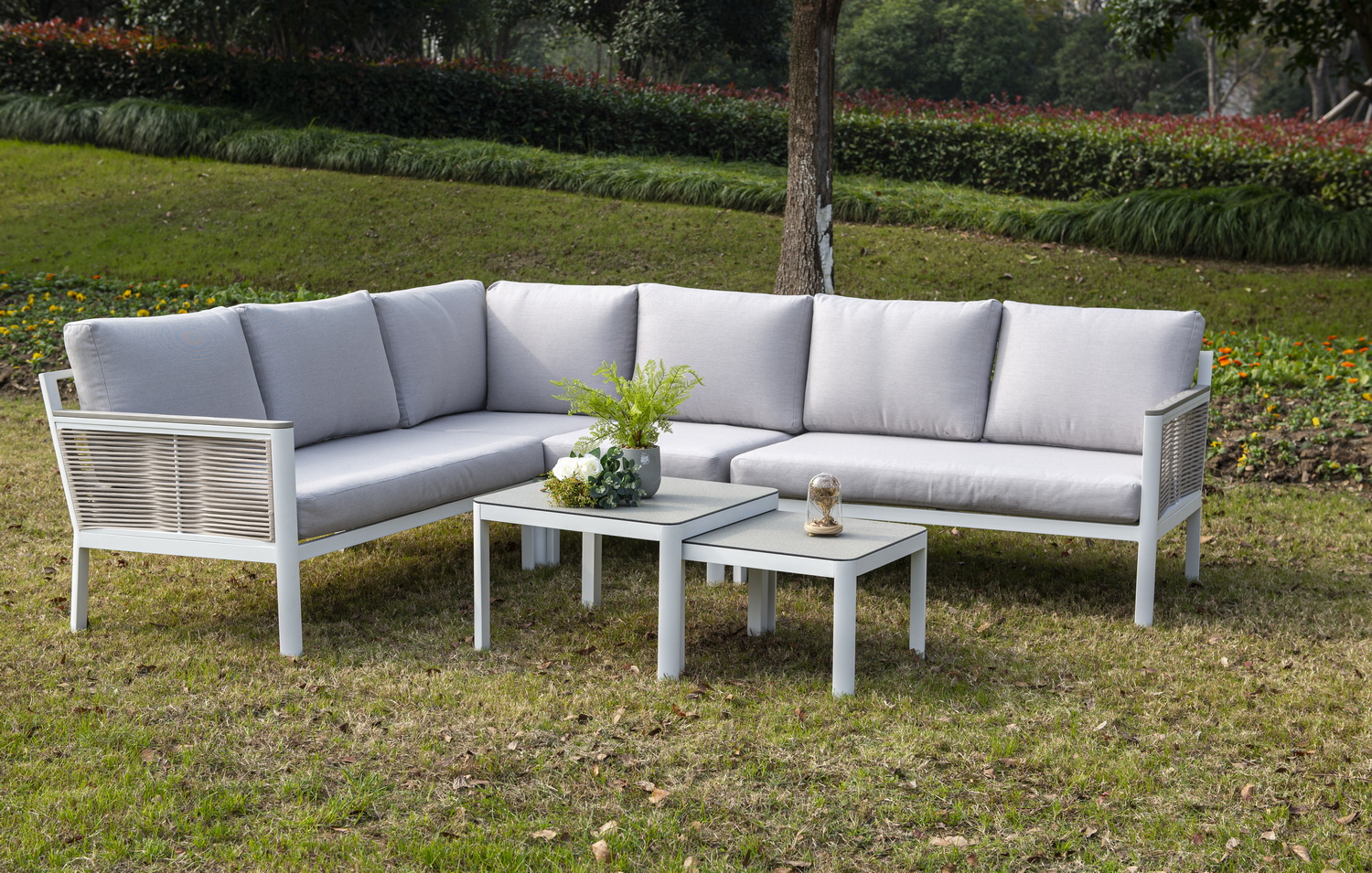 В основе находится алюминиевый каркас, который выступает в качестве устойчивой опоры. Мебель представлена в классическом белом цвете.