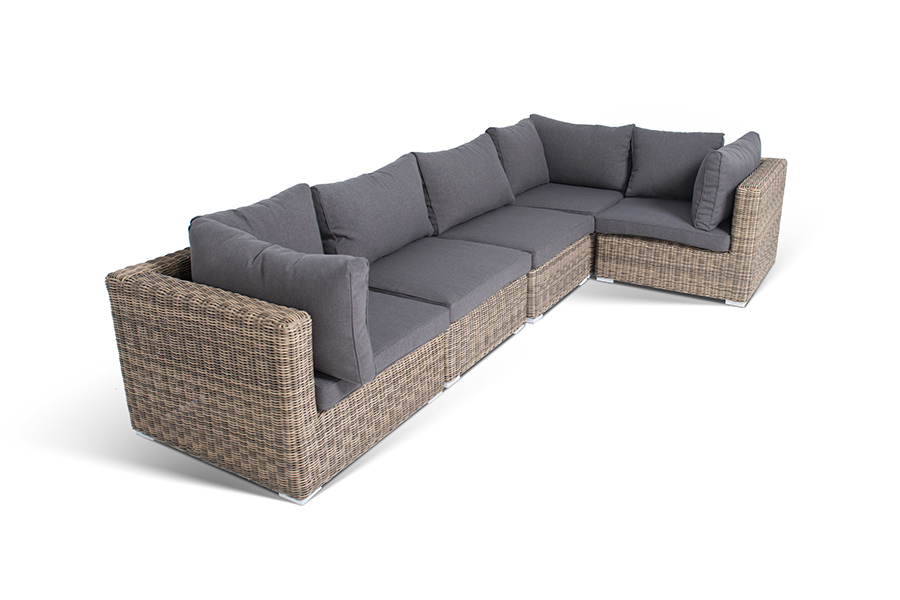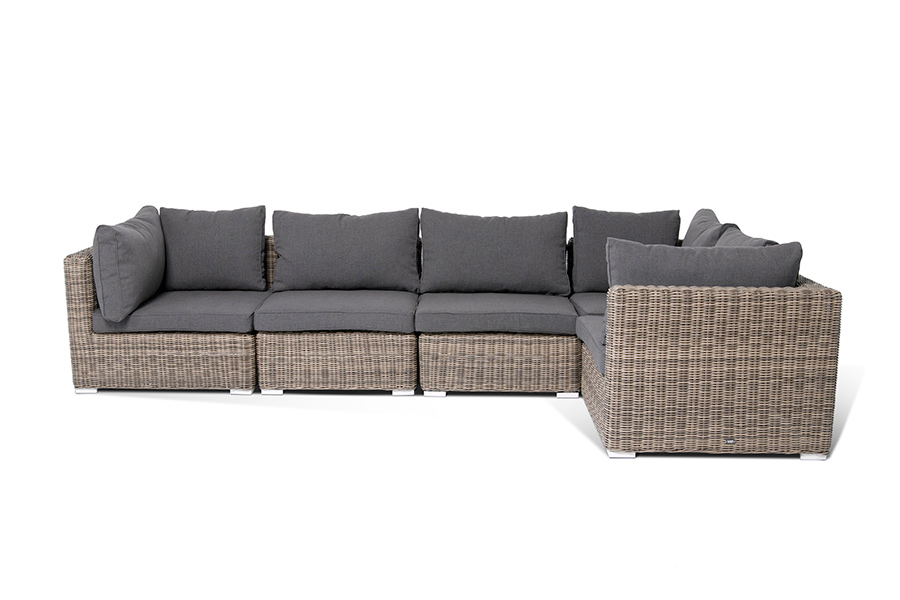 Модульный диван дополняют подушки со съёмными чехлами в сером оттенке. При их пошиве используется полиэстер, плотностью 300гр/м2. Ткань обрабатывается влагоотталкивающей пропиткой для усиления ее защитных качеств.
