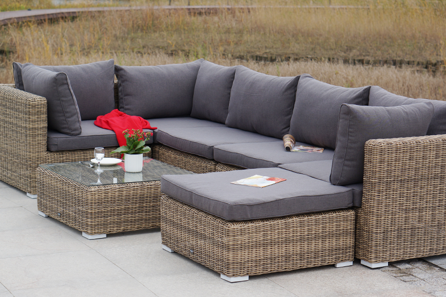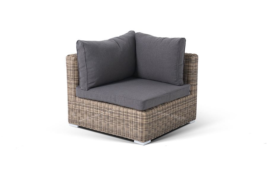 Комплект выполнен из круглого искусственного ротанга ручного плетения. Представлена в соломенном цвете.