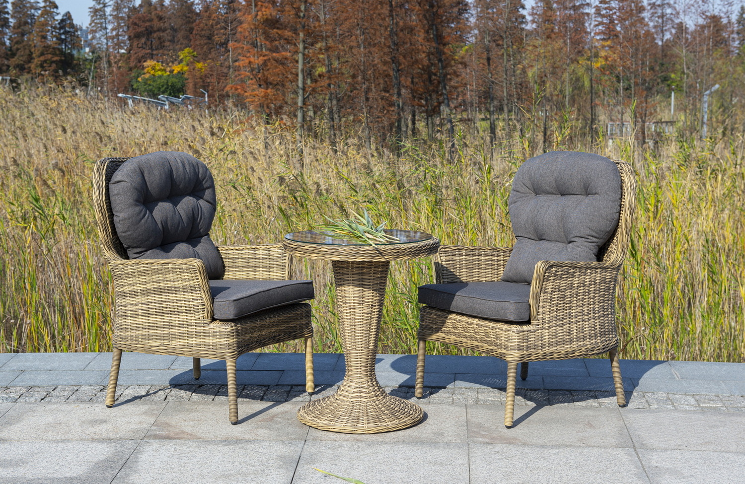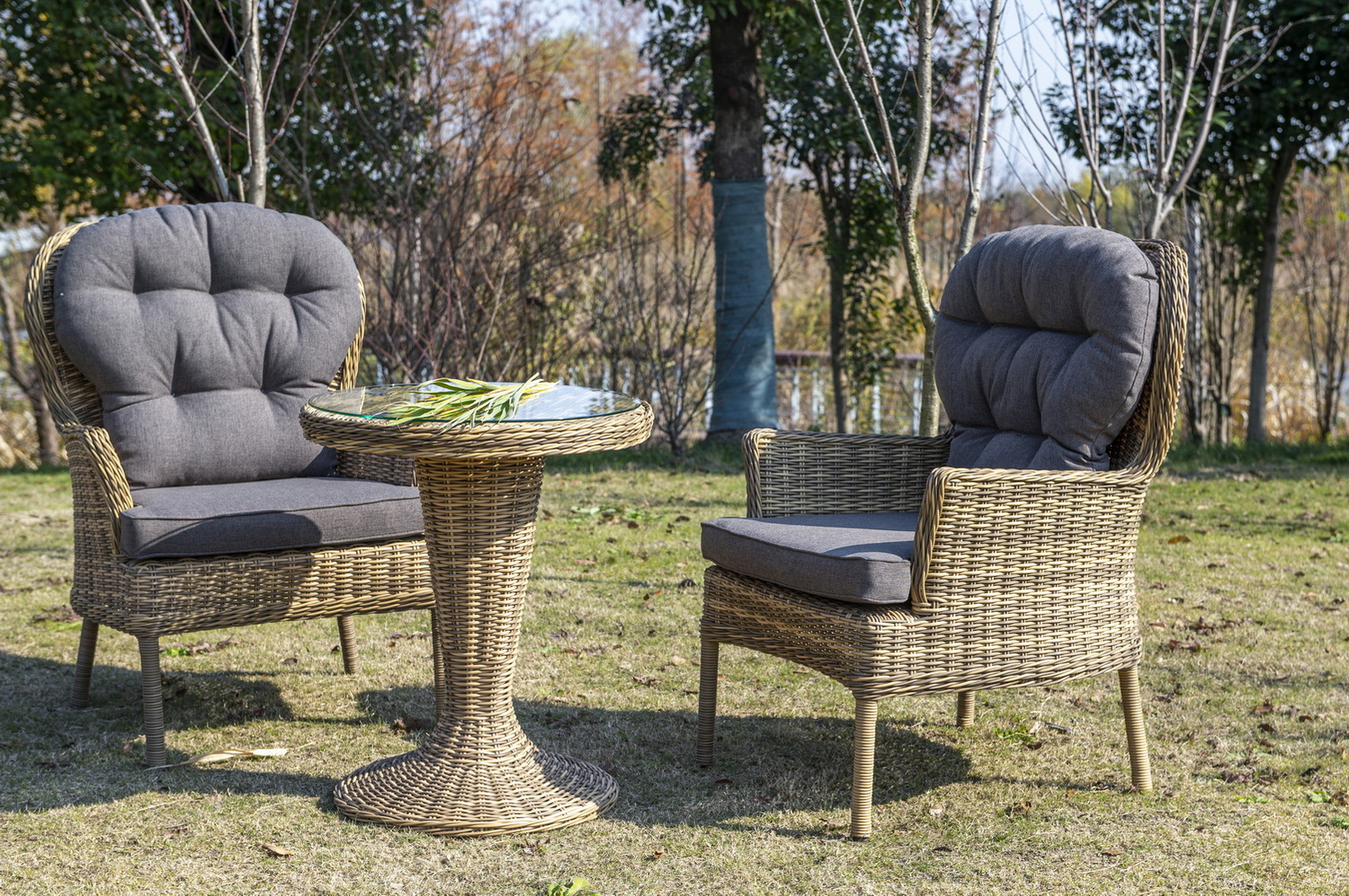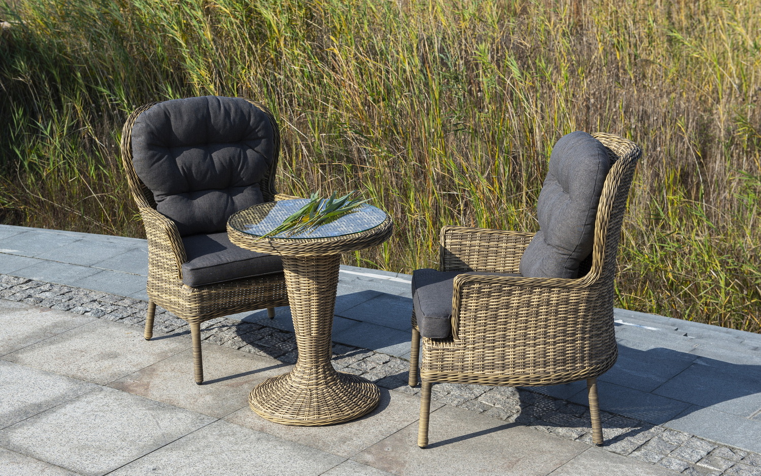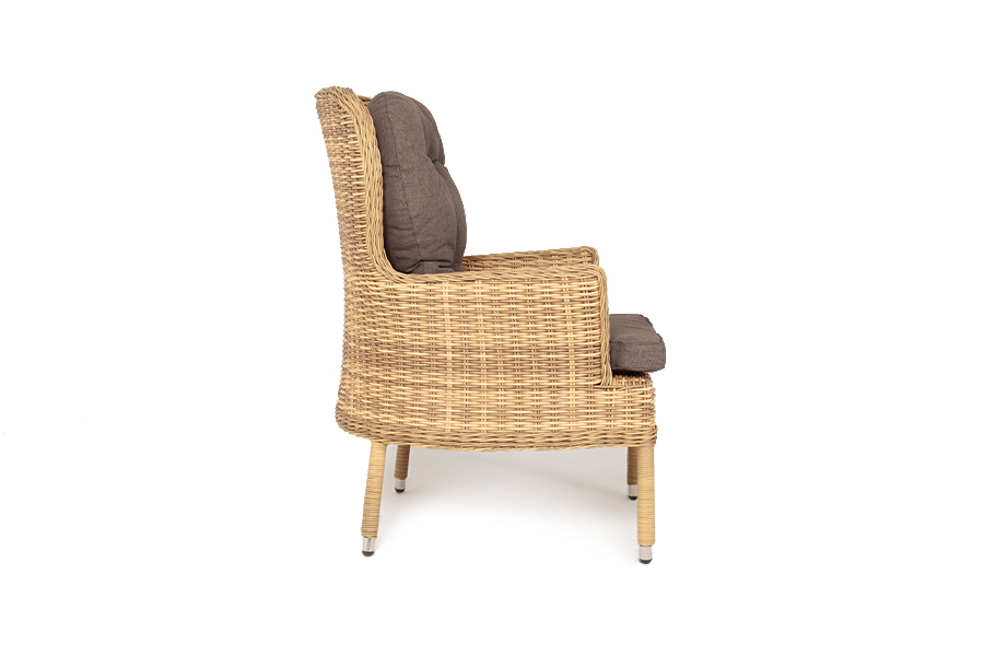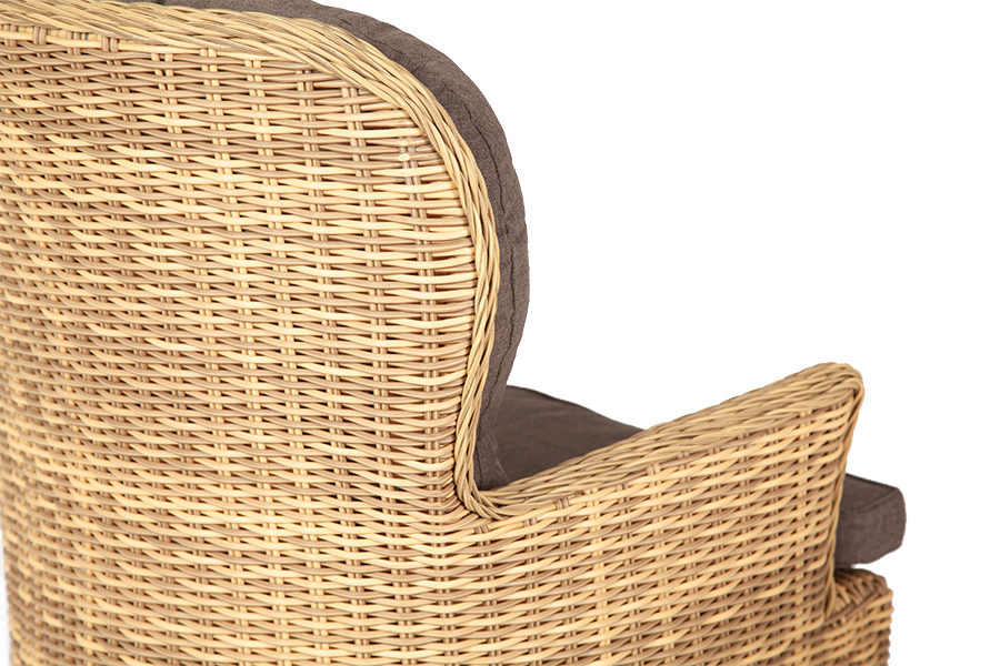 Каркас выполнен из высококачественного алюминия, который оплетен круглым искусственным ротангом соломенного цвета.