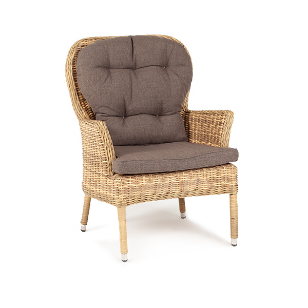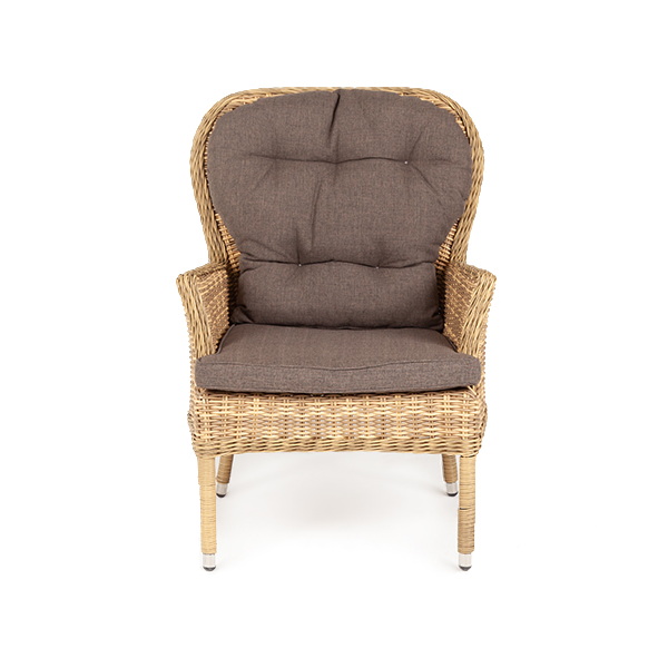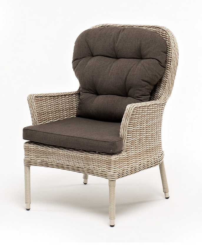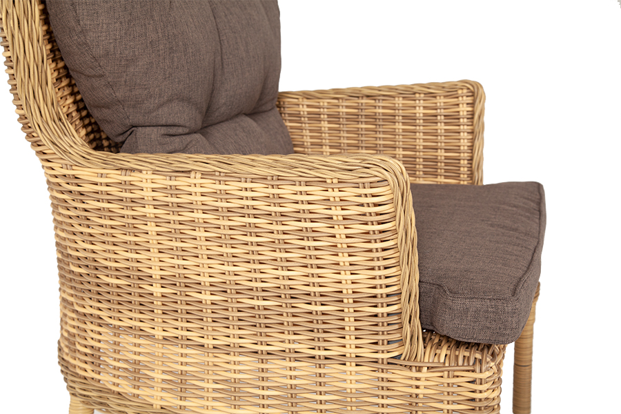 В садовое кресло укомплектовывается мягкими подушками. Они пошиты из износостойкого полиэстера серого оттенка с плотностью 300гр/м2. Защитные свойства синтетического материала усиливаются благодаря влагоотталкивающей пропитке.