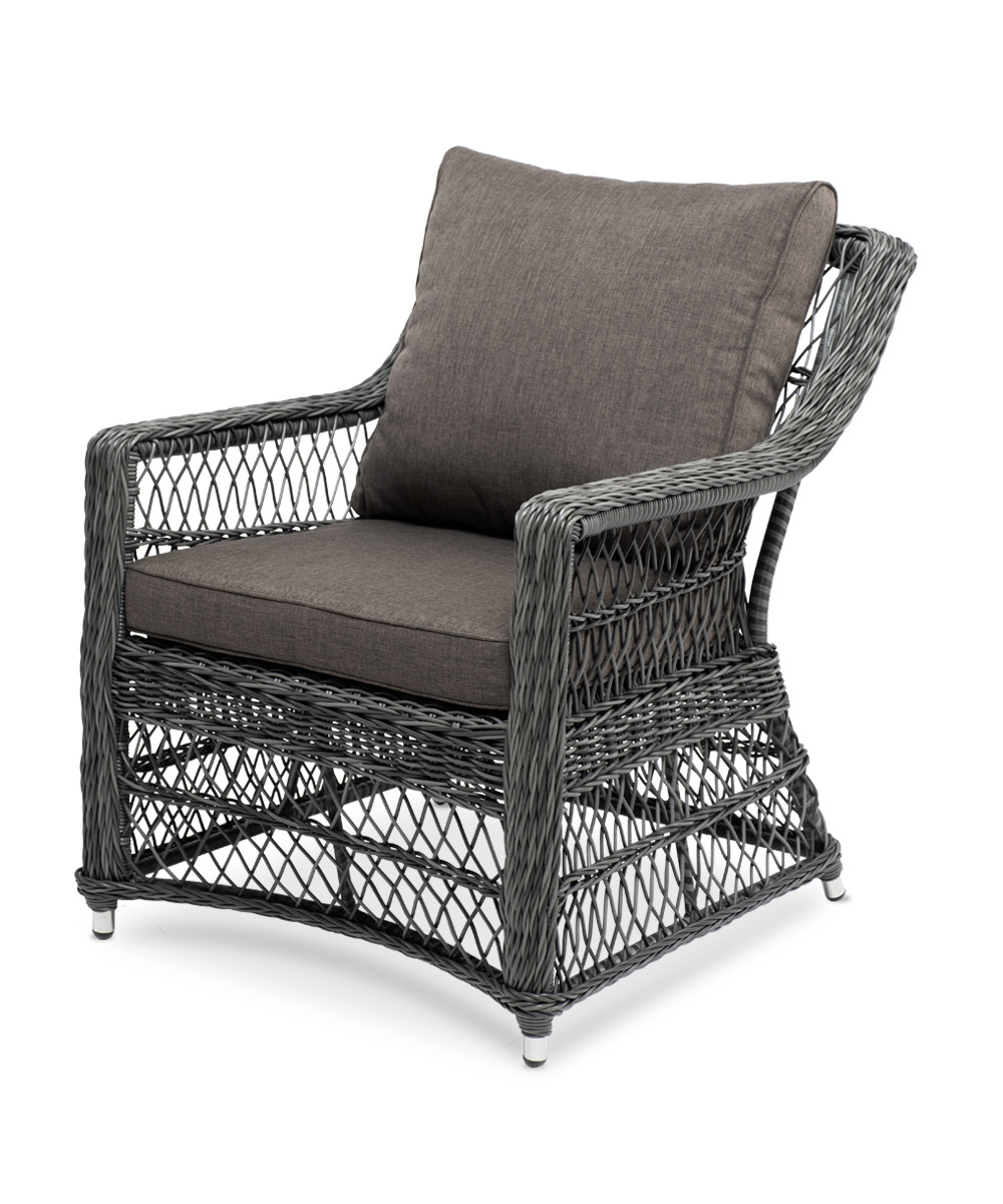 Укомплектовано плетеное кресло удобными мягкими подушками, одна из которых располагается в области спинки. Они выполнены в сером оттенке. При пошиве тканевых изделий используется полиэстер, плотностью 300гр/м2. Он в обязательном порядке проходит обработку влагоотталкивающей пропиткой.
