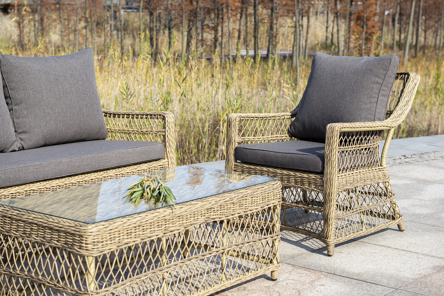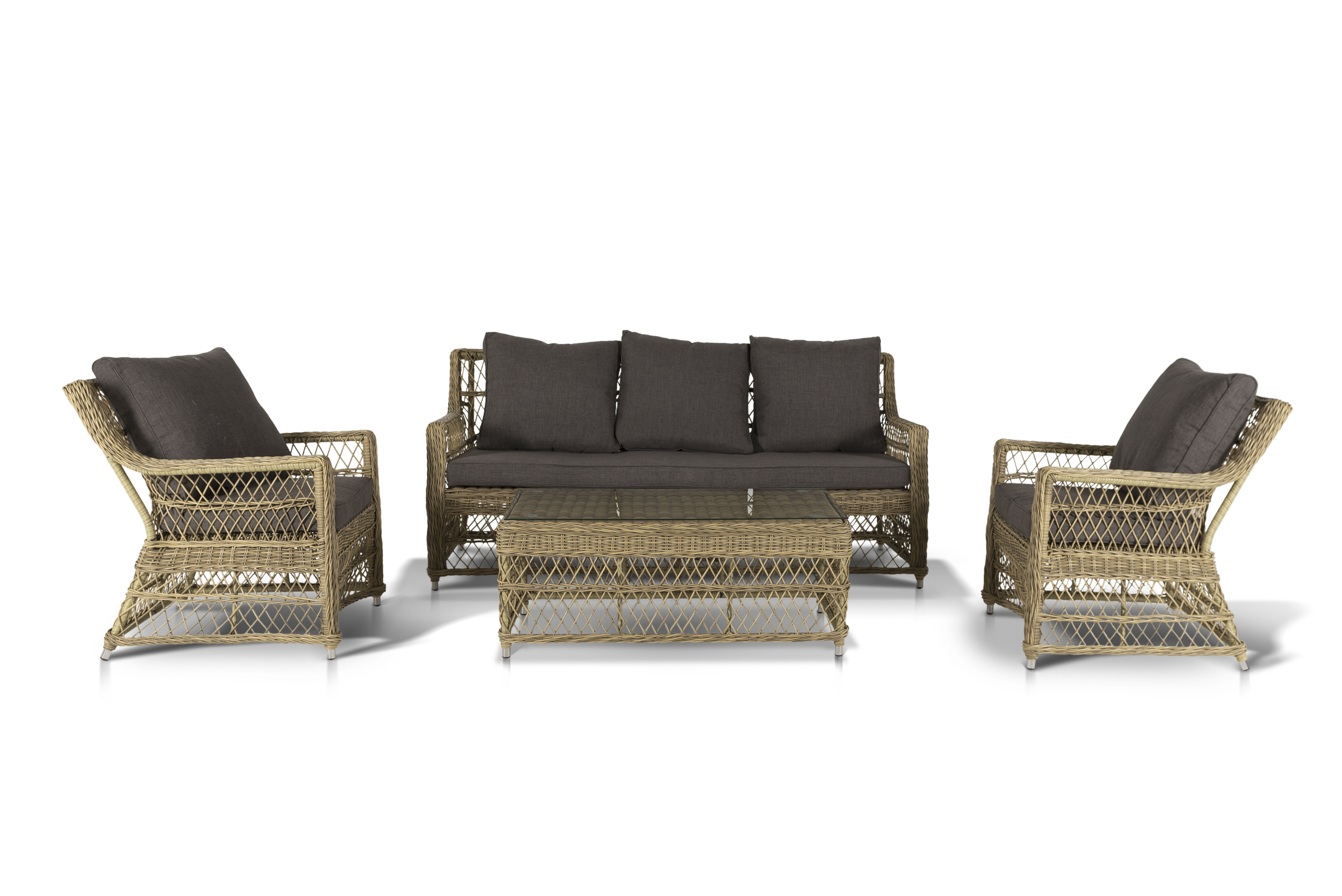 Укомплектовано плетеное кресло удобными мягкими подушками, одна из которых располагается в области спинки. Они выполнены в сером оттенке. При пошиве тканевых изделий используется полиэстер, плотностью 300гр/м2. Он в обязательном порядке проходит обработку влагоотталкивающей пропиткой.