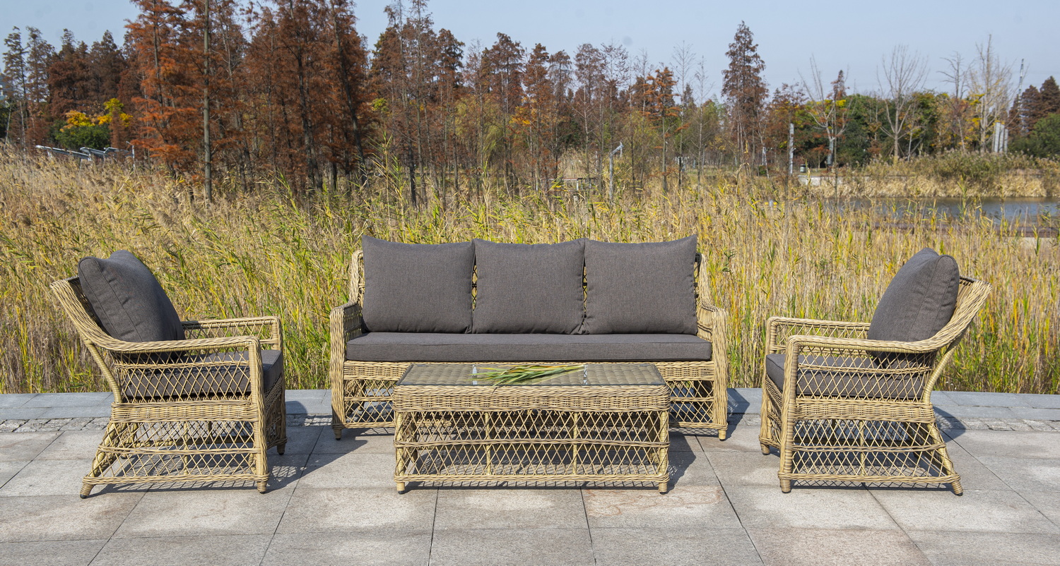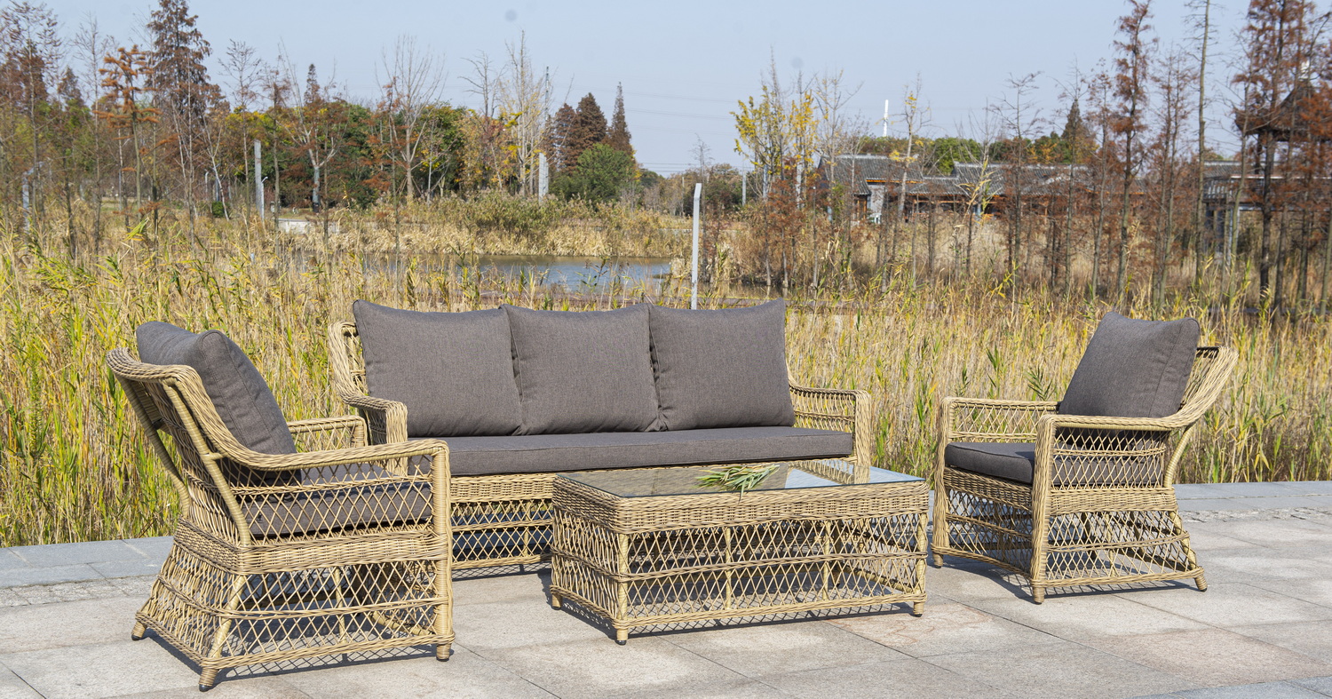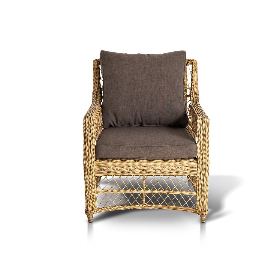 Кресло изготовлена из устойчивого алюминиевого каркаса. Искусственный ротанг украшает мебель в качестве круглого ручного плетения. Оно представлено в соломенном цвете.