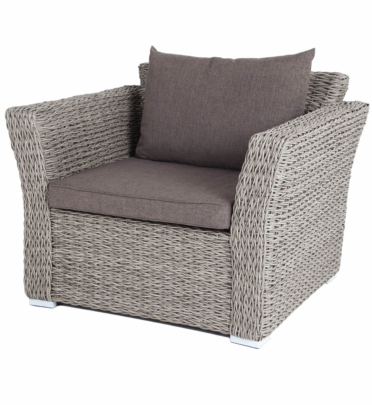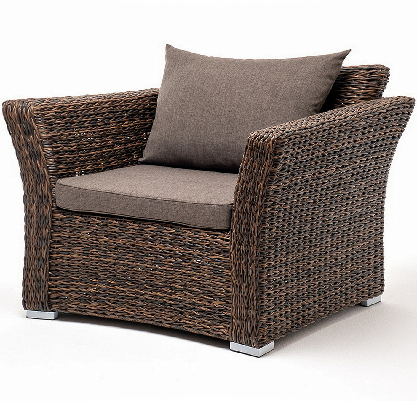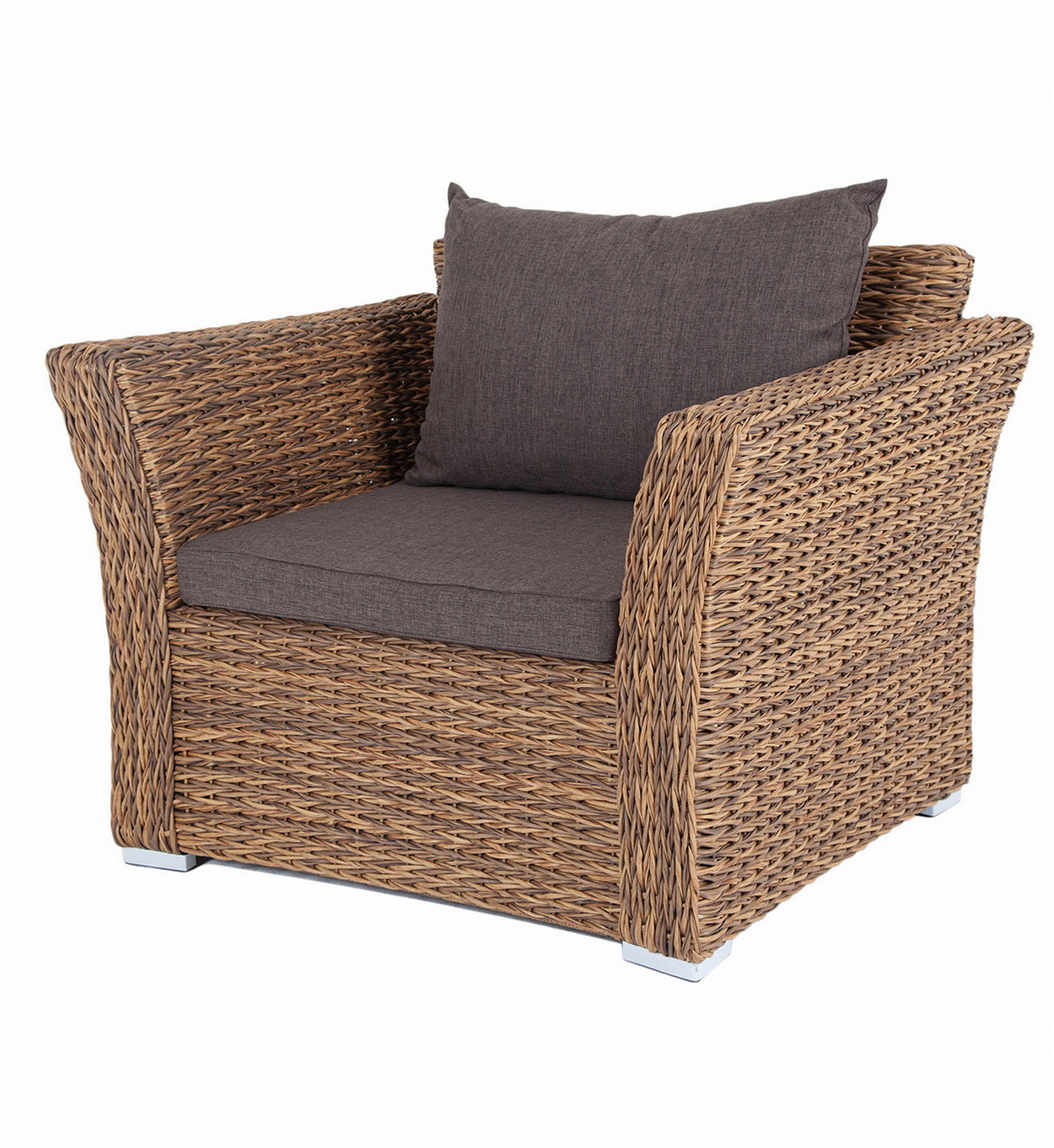 Каркас изготовлен из прочного алюминия, оплетенного вручную искусственным ротангом вида «гиацинт» соломенного оттенка.