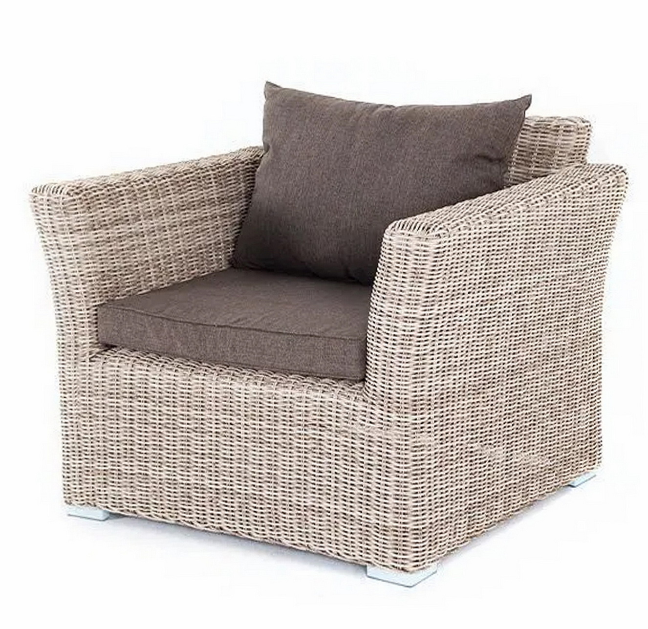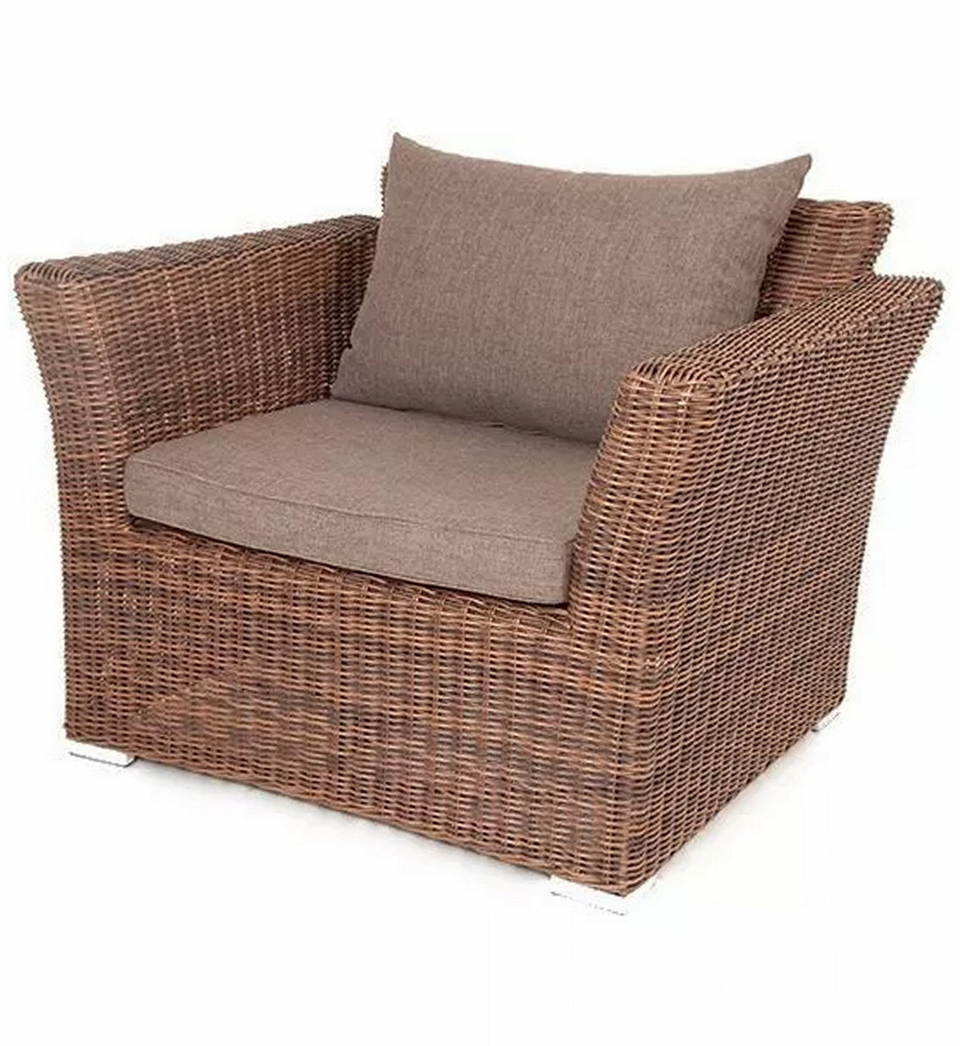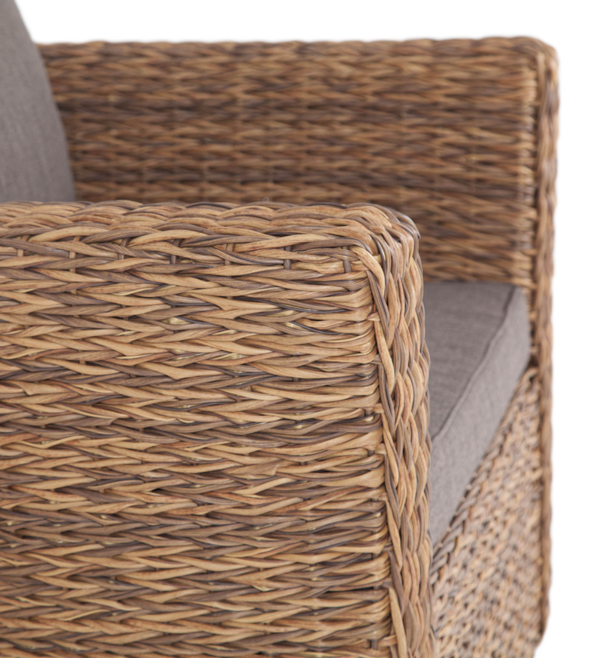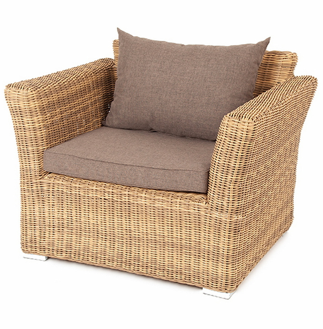 Каркас изготовлен из прочного алюминия, оплетенного вручную искусственным ротангом вида «гиацинт» соломенного оттенка.