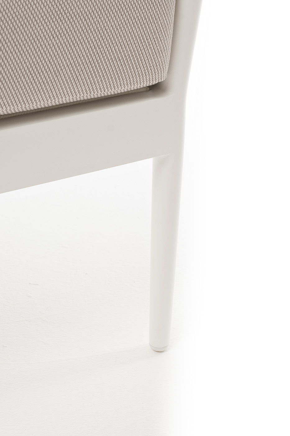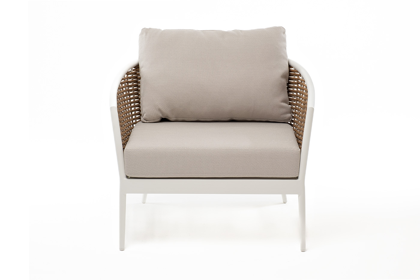 Укомплектовано плетеное кресло удобными мягкими подушками, одна из которых располагается в области спинки. Они выполнены в бежевом оттенке. При пошиве тканевых изделий используется 100% полиэстер, плотностью 300гр/м2. Он в обязательном порядке проходит обработку влагоотталкивающей пропиткой.