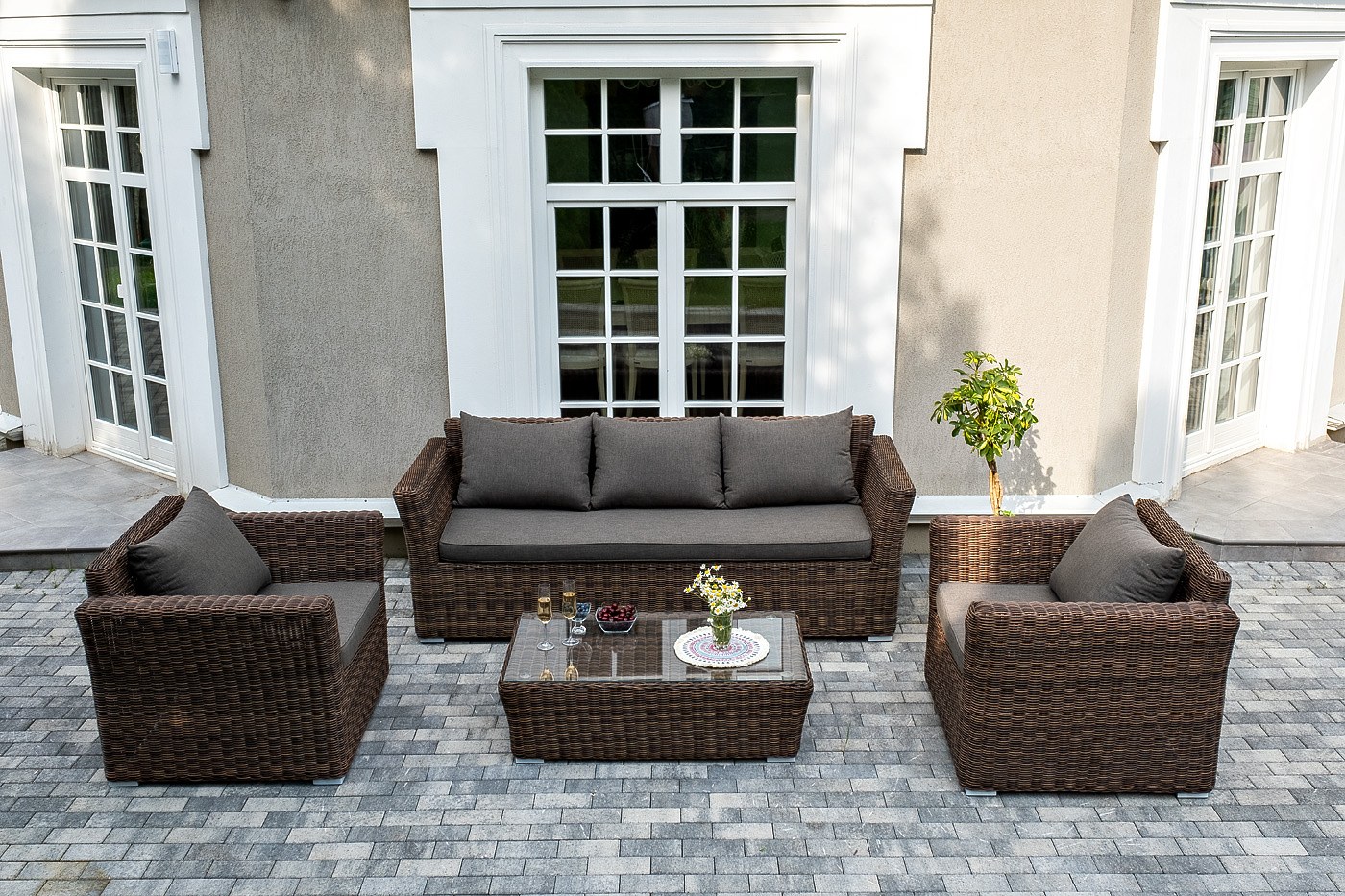 Кресла и диван идут в комплекте с подушками с серыми чехлами. Они пошиты из качественного полиэстера с плотностью 300гр/м2. Материал предварительно проходит обработку влагоотталкивающей пропиткой. Столик дополнен практичной столешницей из стекла толщиной 5 мм.