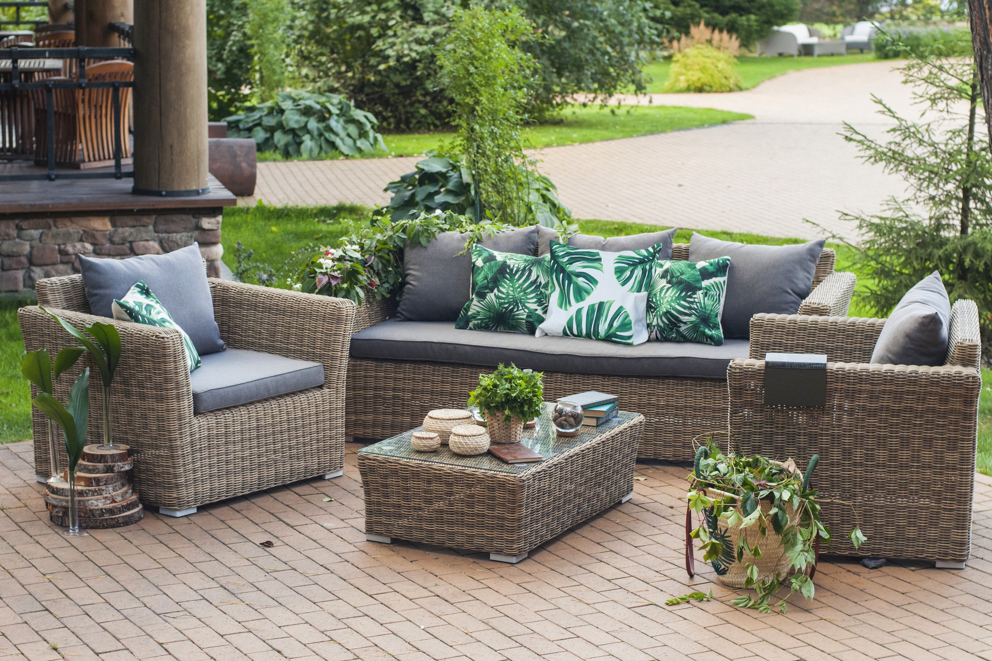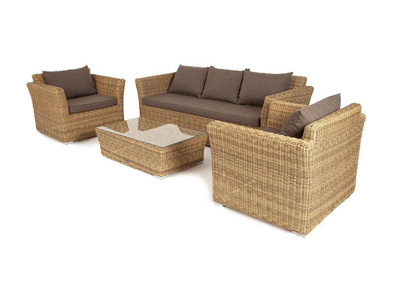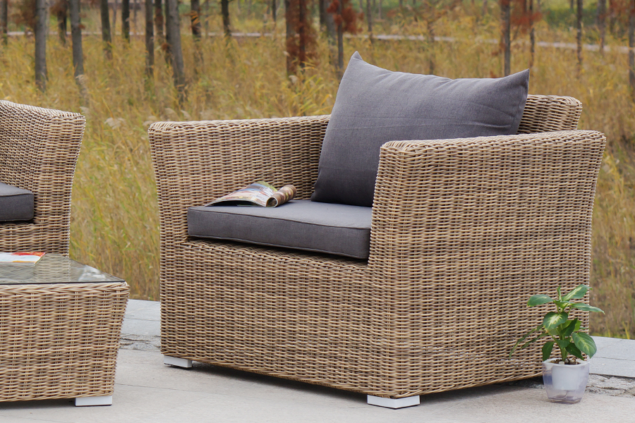 Из алюминия сделан устойчивый каркас мебели. Ее поверхность дополнена искусственным ротангом, из которого сделано ручное плетение, цвет соломенный.