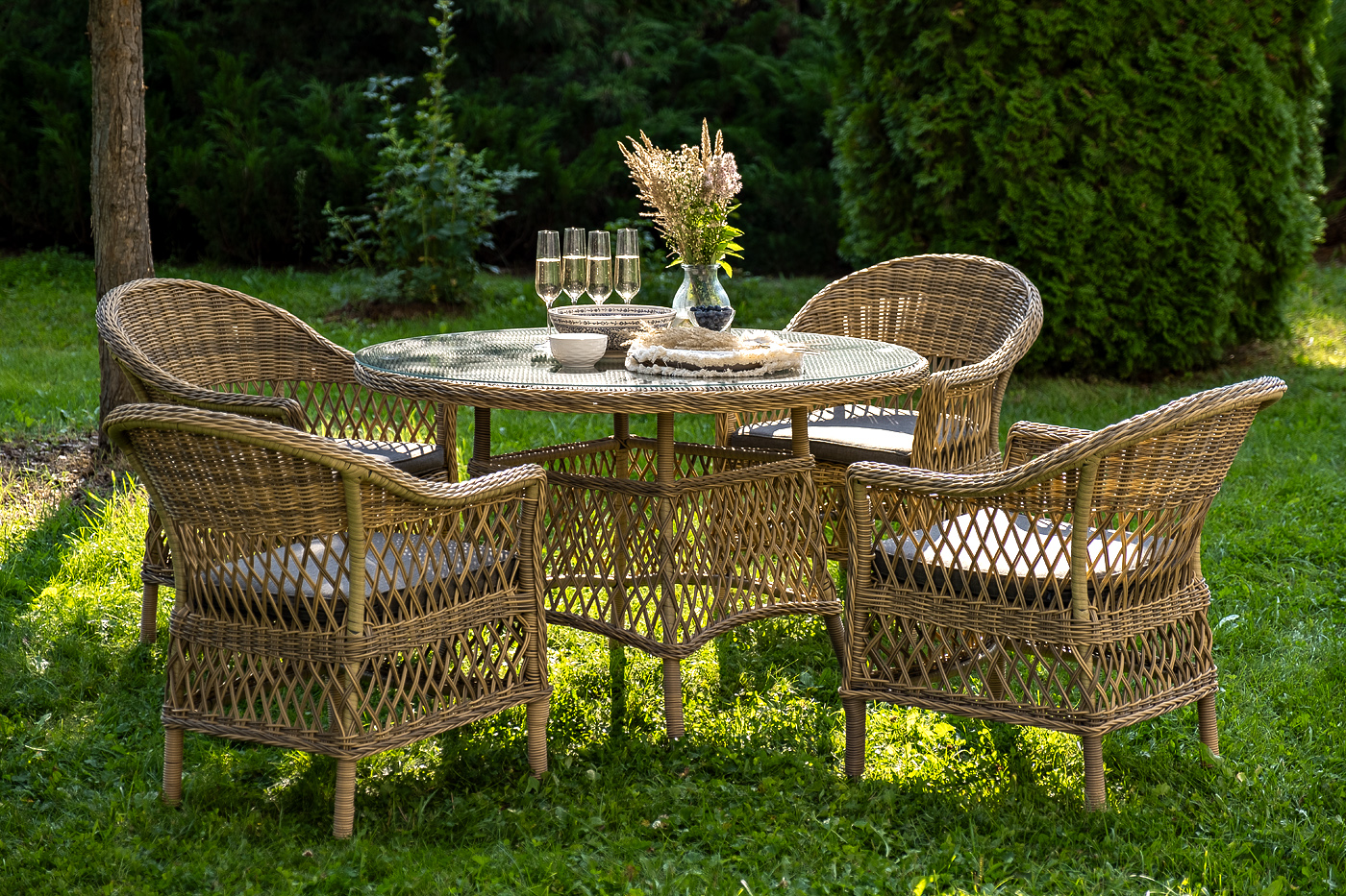 Из алюминия выполнен устойчивый каркас мебели, который задекорирован искусственным ротангом круглого ручного плетения. Комплект представлен в соломенном цвете.