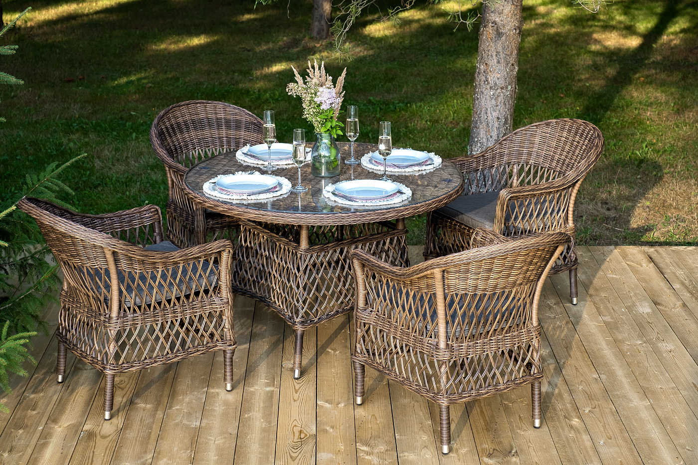 Из алюминия выполнен устойчивый каркас мебели, который задекорирован искусственным ротангом круглого ручного плетения. Комплект представлен в коричневом цвете.