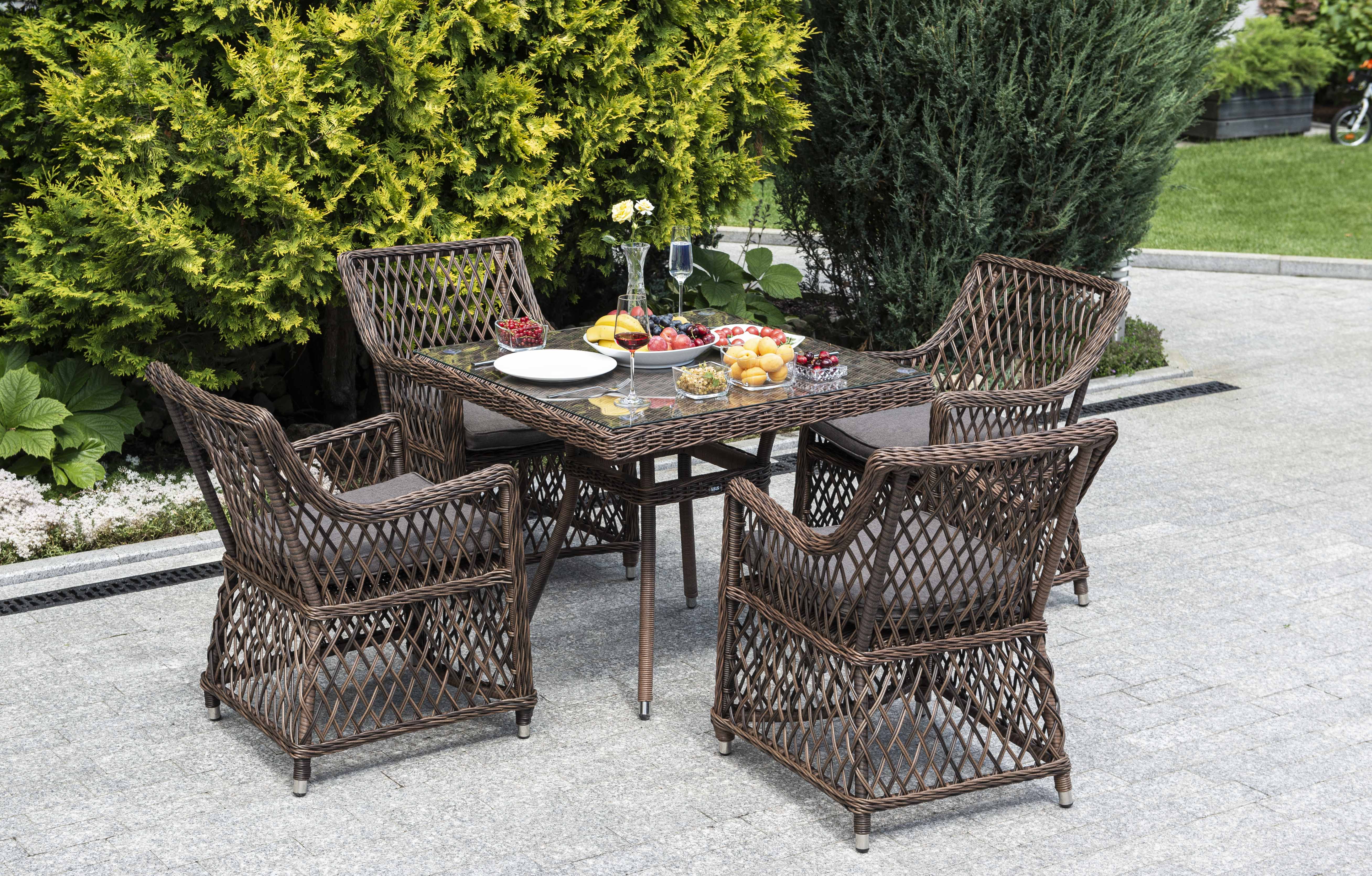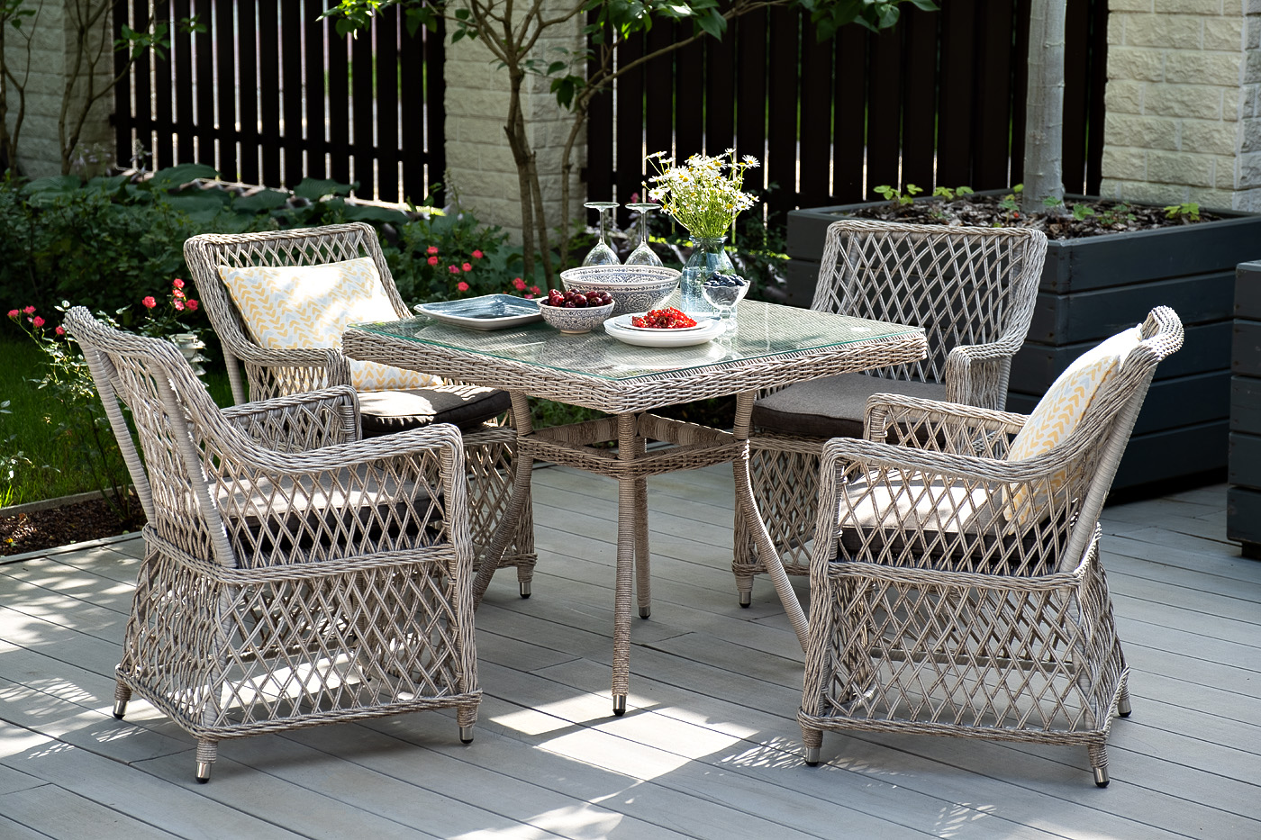 Каркас мебели выполнен из прочного и легкого алюминия, оплетенного вручную долговечным искусственным ротангом графитового цвета, столешница – закаленное стекло.