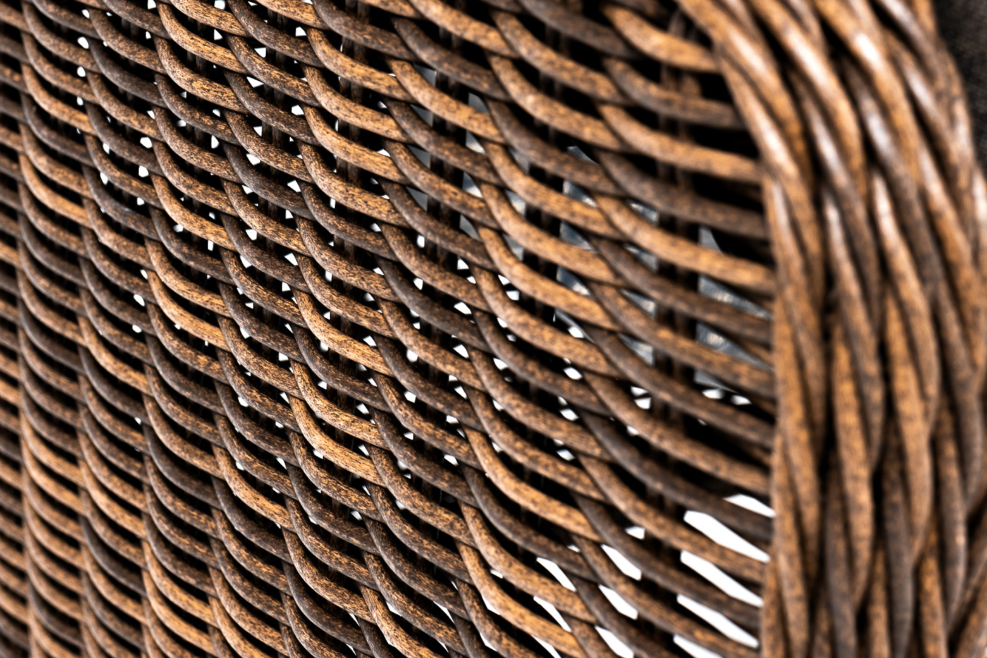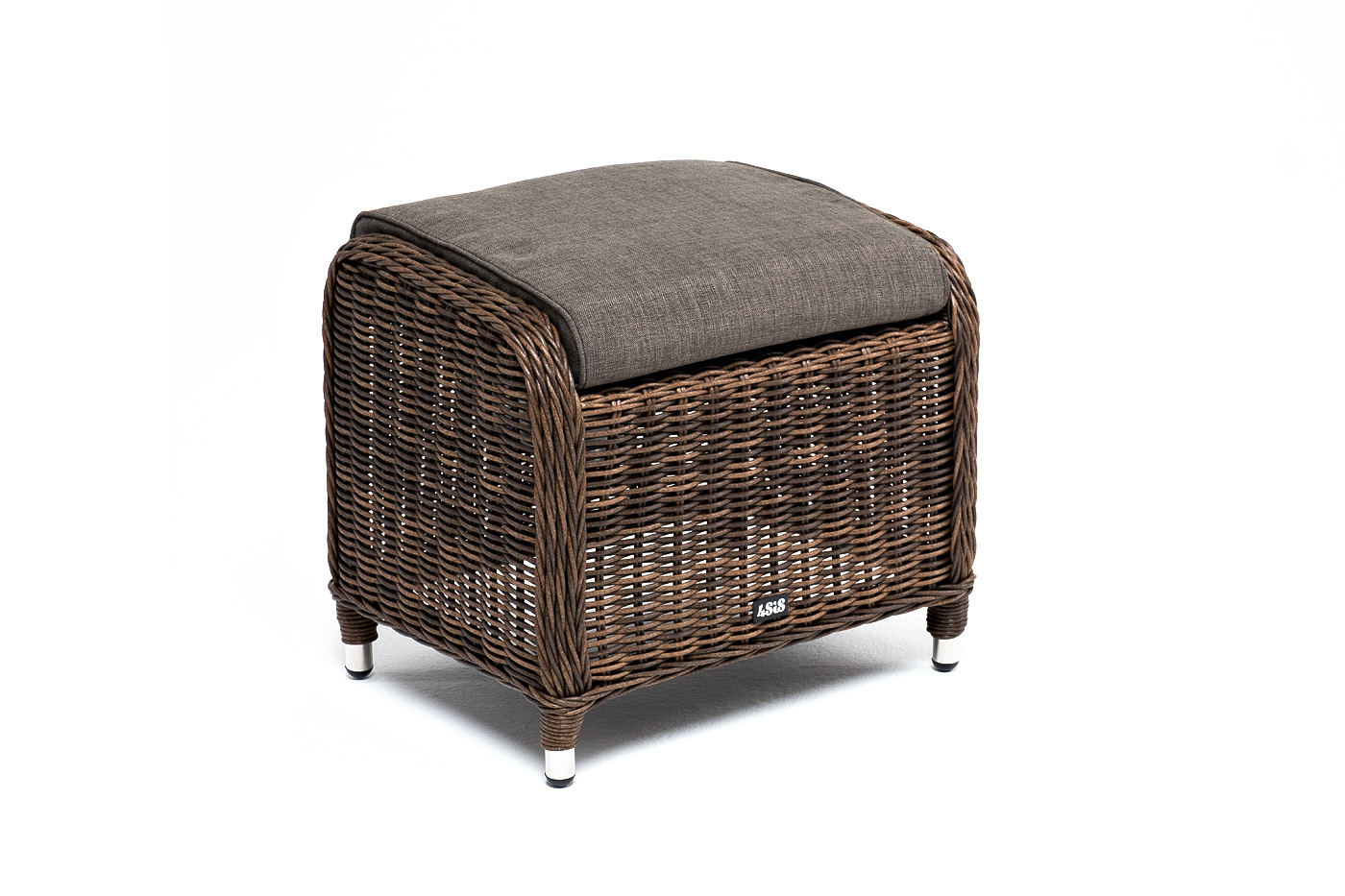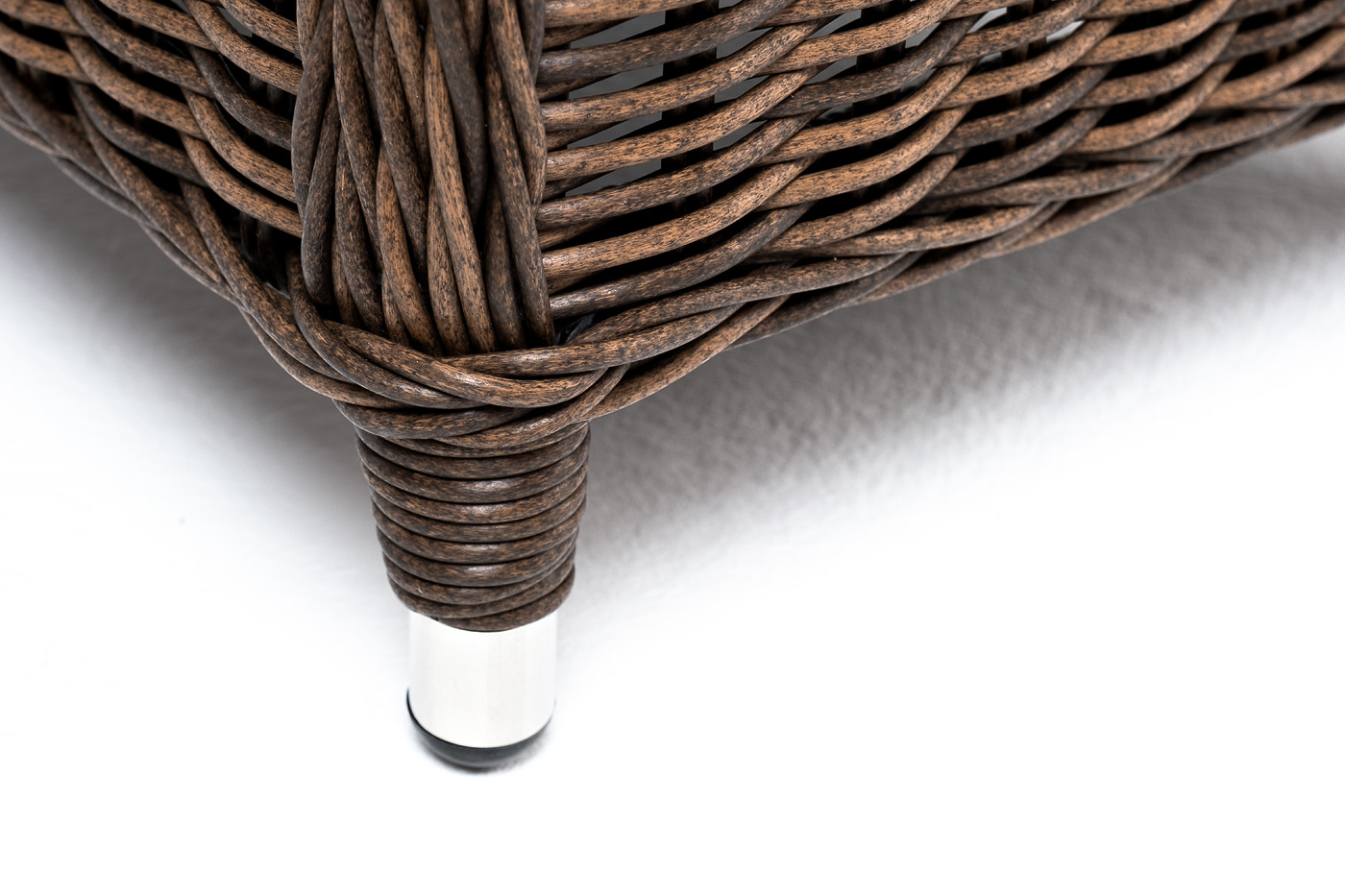 Алюминиевый каркас используется при изготовлении основы пуфа. В роли декоративного элемента выступает ручная оплетка, созданная из искусственного ротанга. Представлена в коричневом цвете.