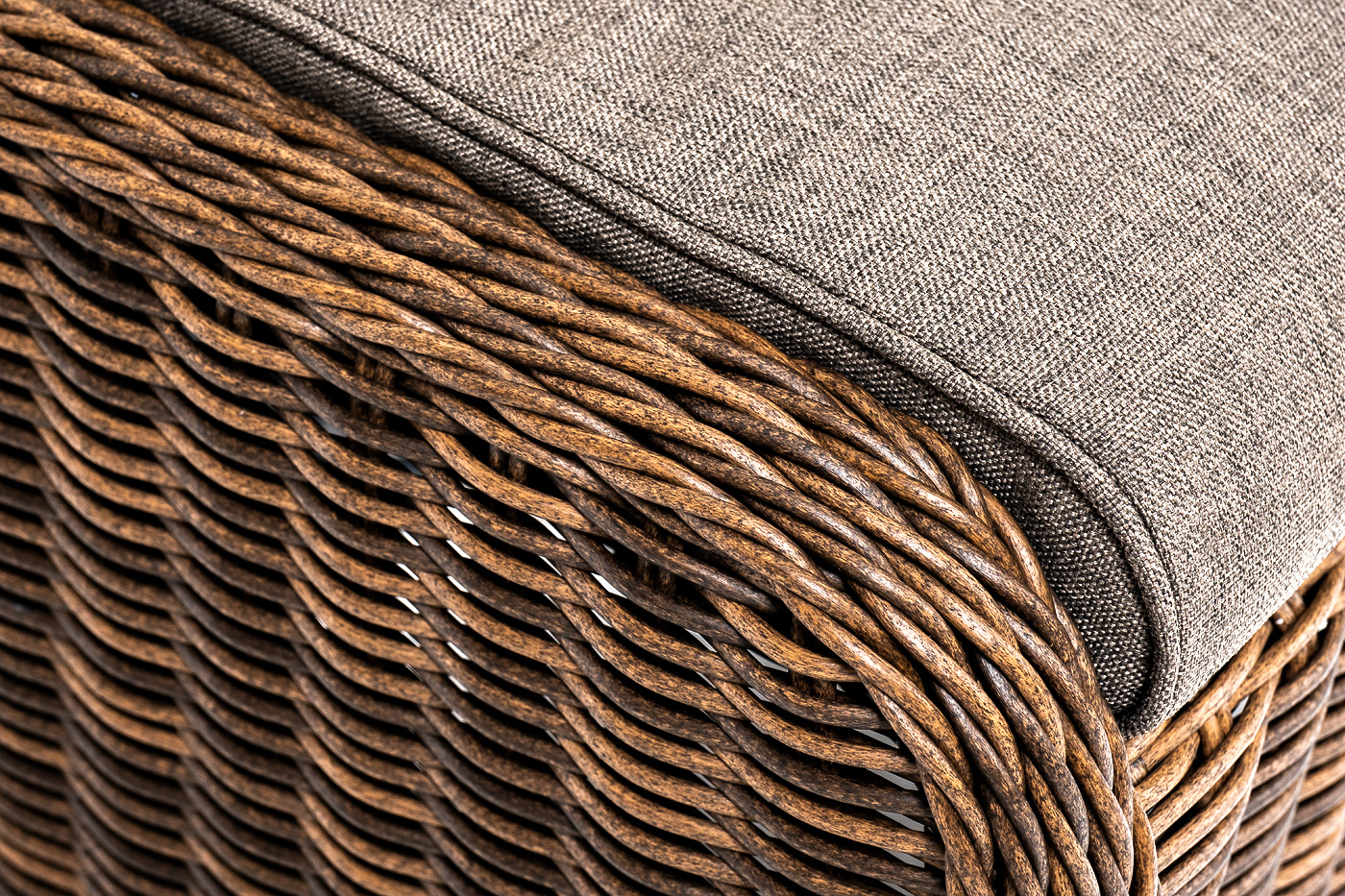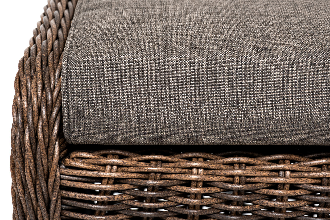 В комплект с плетеным пуфом идет мягкая подушка серого оттенка. При пошиве изделия используется высококачественный полиэстер, его плотность 300гр/м2. Материал обрабатывается влагоотталкивающей пропиткой.