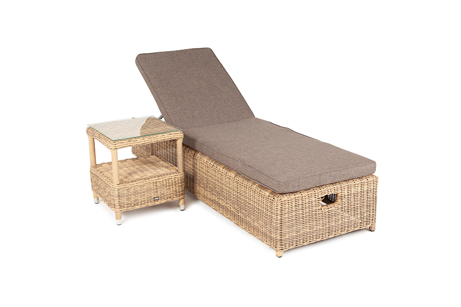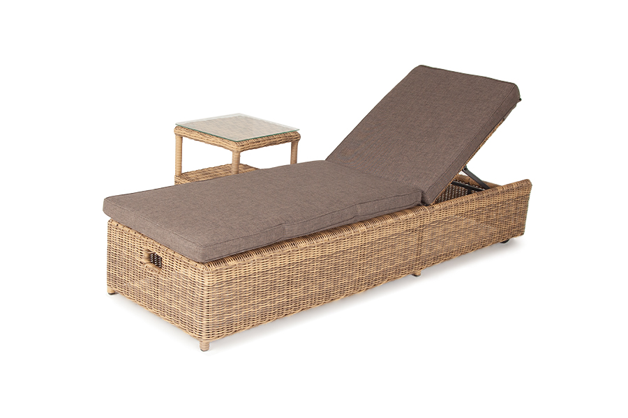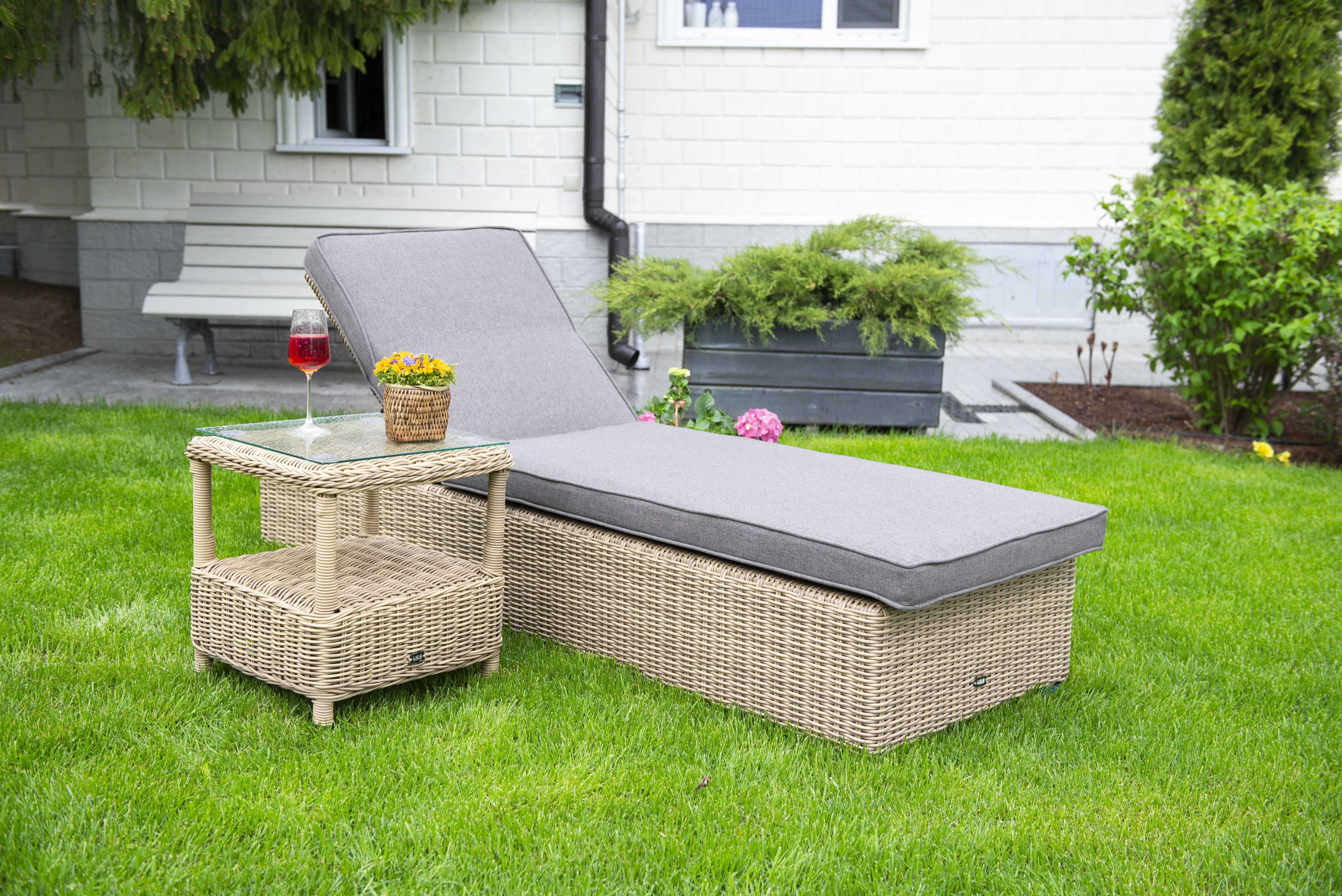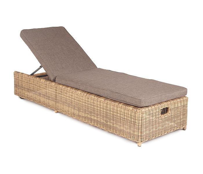 Дополнительно к шезлонгу прилагаются мягкие подушки из полиэфирной ткани, которая обладает стойкостью к ультрафиолету, воде. Съёмные чехлы серого цвета. Для удобства можно отрегулировать наклон спинки лежака.