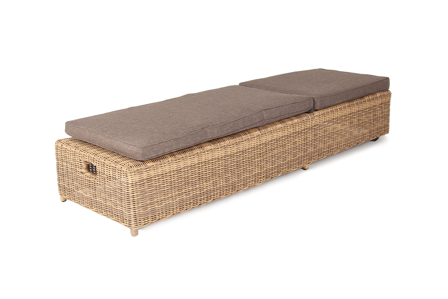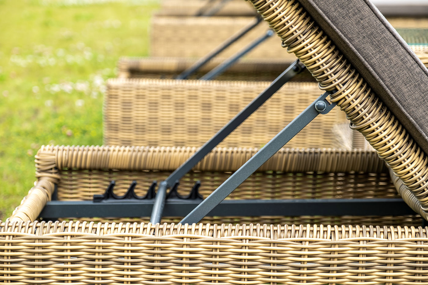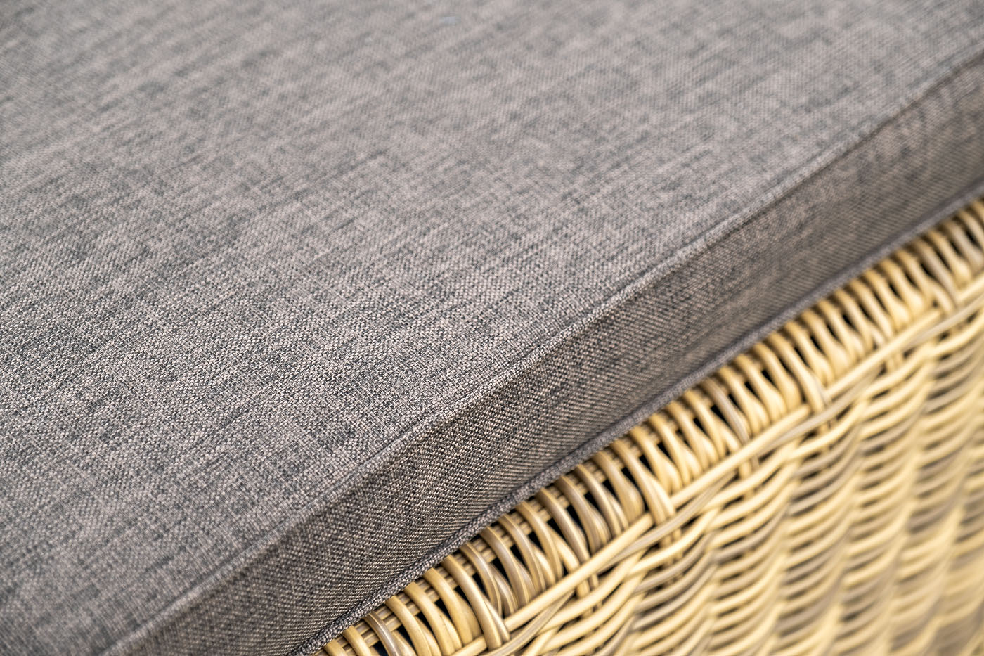 Есть несколько пазов, благодаря которым можно поднимать или опускать спинку. Также комфорт обеспечивает мягкий матрас. Съёмный чехол серого цвета изготовлен из 100%-го полиэстера с водоотталкивающим эффектом. Мебель оплетена вручную.