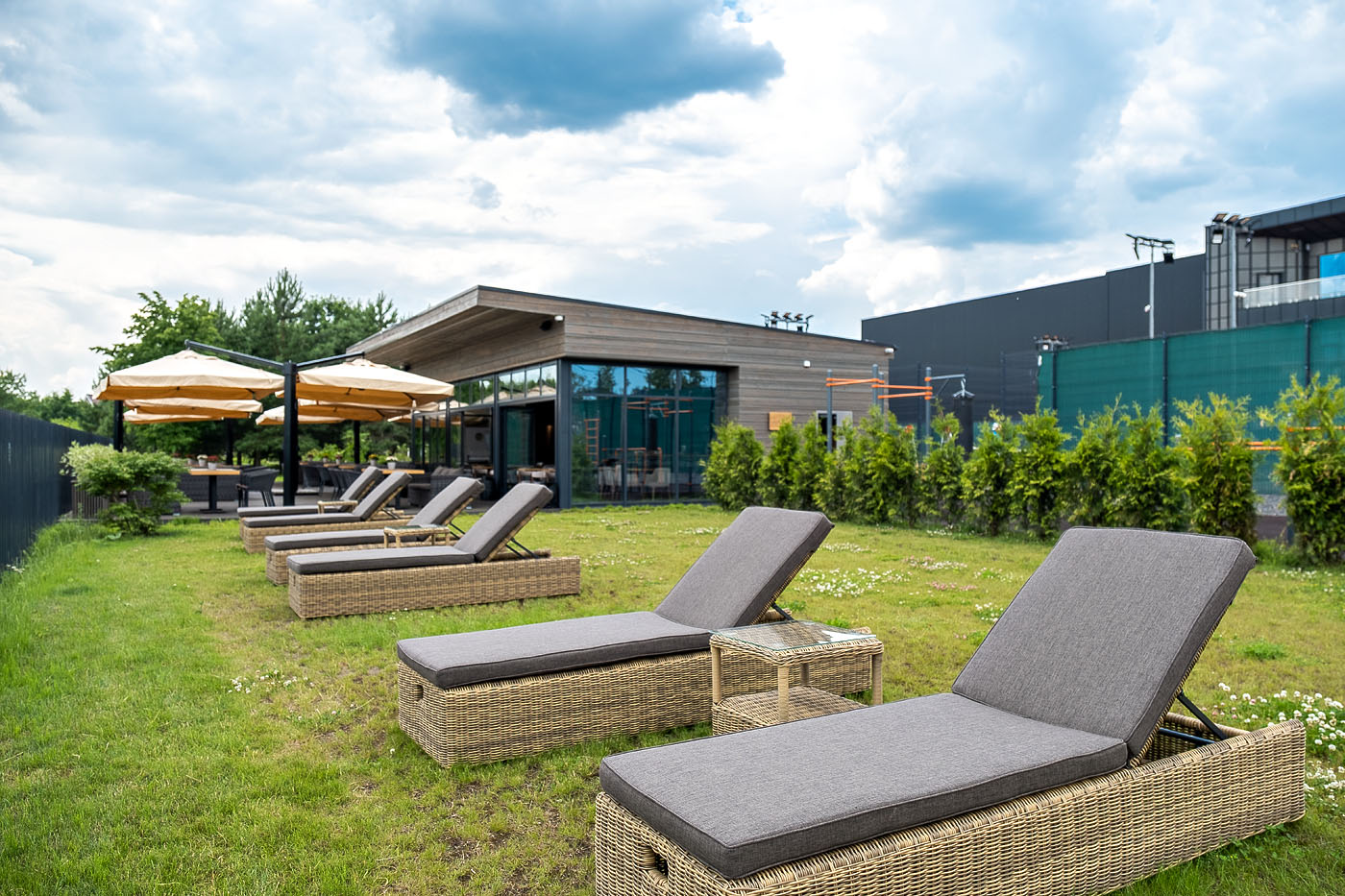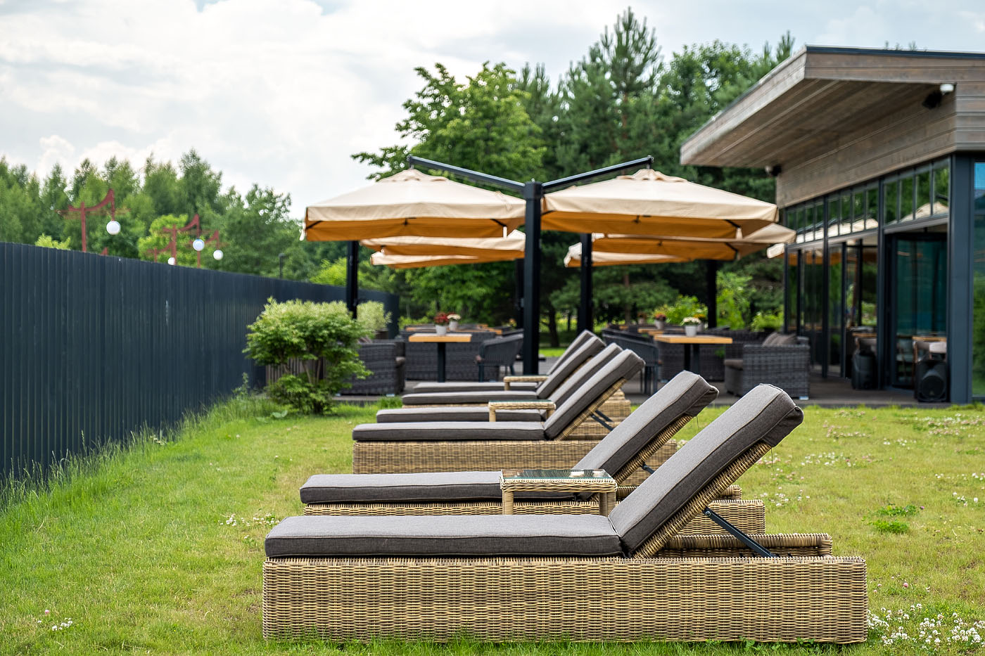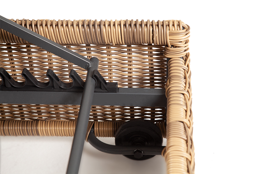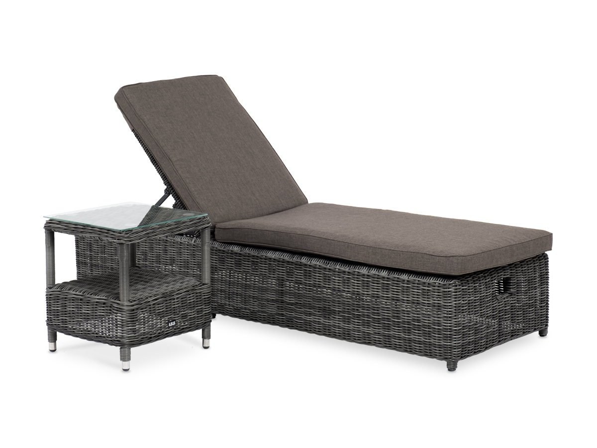 Есть несколько пазов, благодаря которым можно поднимать или опускать спинку. Также комфорт обеспечивает мягкий матрас. Съёмный чехол серого цвета изготовлен из 100%-го полиэстера с водоотталкивающим эффектом. Мебель оплетена вручную.