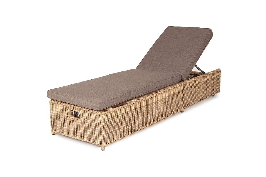 Цвет - натуральный соломенный. Благодаря уникальным свойствам искусственного ротанга не требуется специальный уход. Прочный каркас шезлонга из алюминия выдерживает нагрузку до 150 кг.