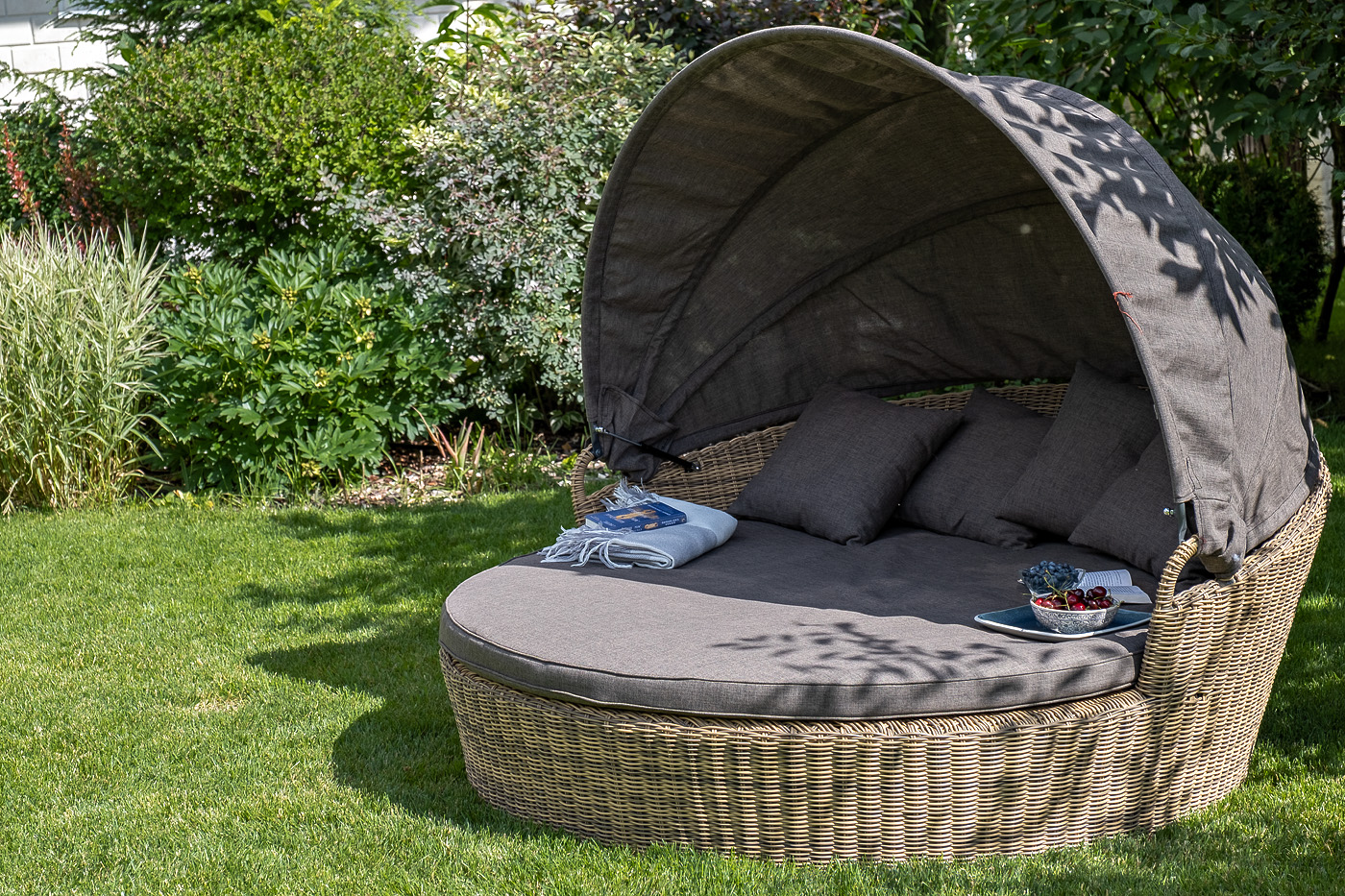 Данная модель имеет в основании прочный алюминиевый каркас, оплетенный вручную круглым ротангом и оснащена регулируемым козырьком, который ограничивает попадание солнечных лучей. Выполнен из водостойкой полиэфирной ткани.
