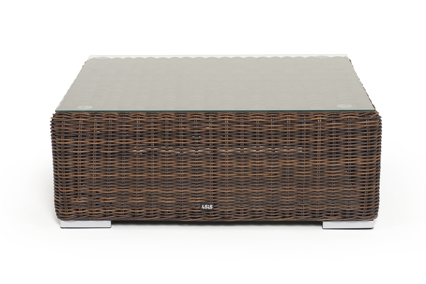 Размер модели – 950×950×350 мм. Ее каркас сделан из высокопрочного алюминия, который оплетен искусственным ротангом с помощью ручного круглого плетения. Столик представлен в соломенном цвете.