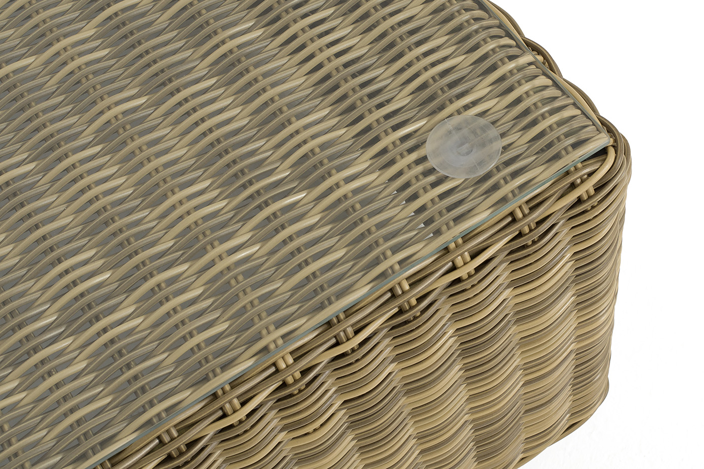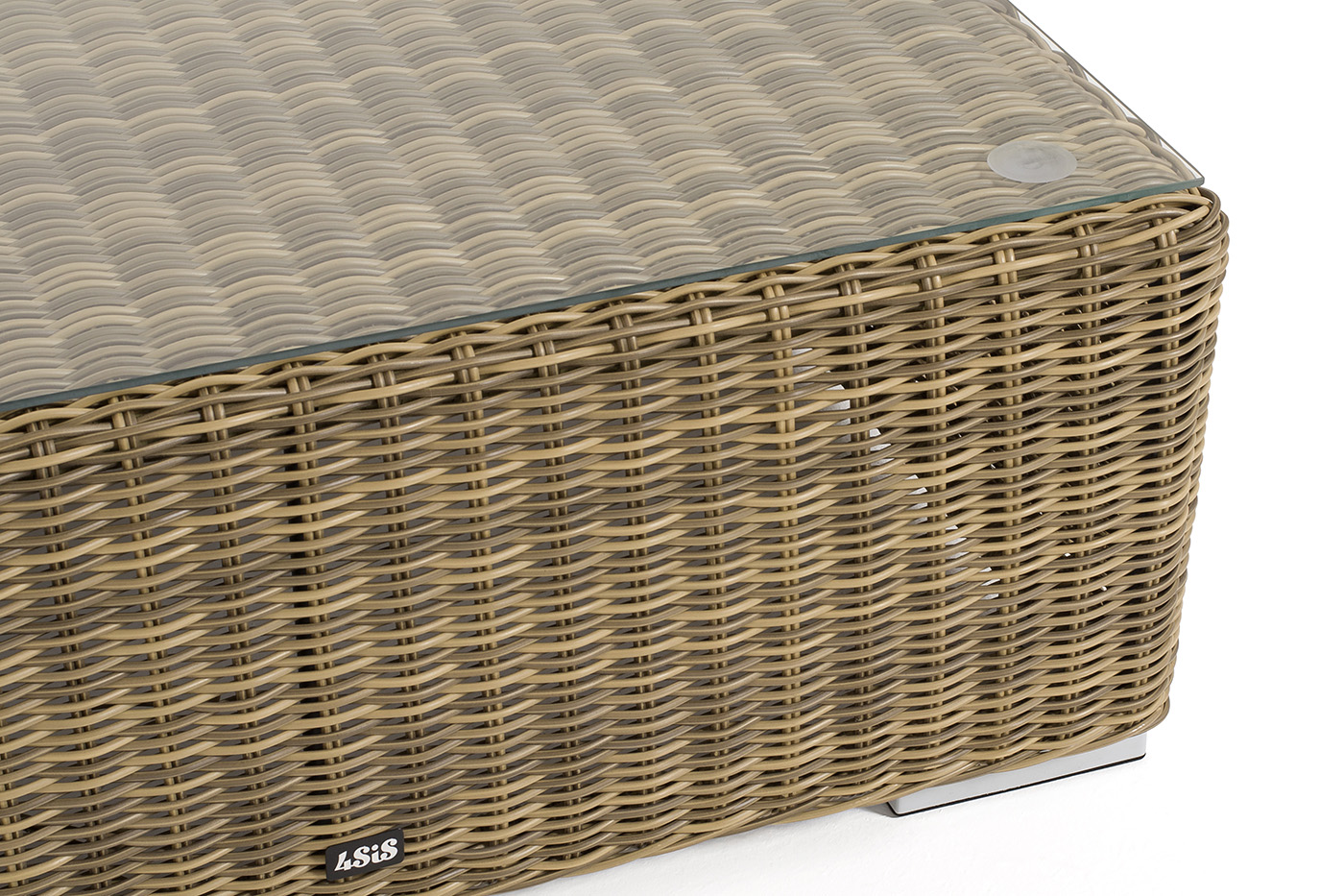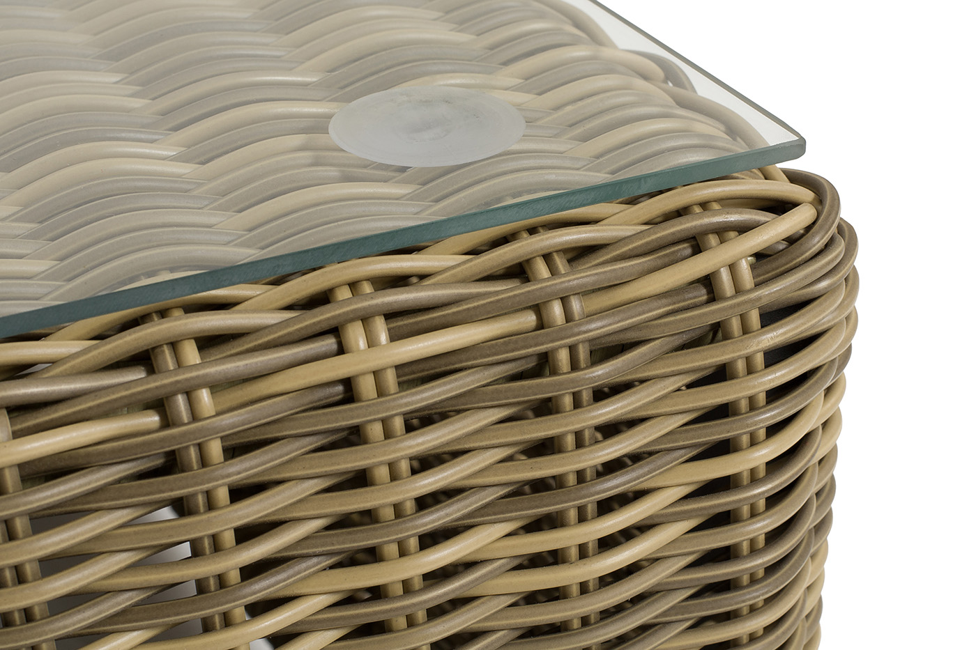 Размер модели – 950×950×350 мм. Ее каркас сделан из высокопрочного алюминия, который оплетен искусственным ротангом с помощью ручного круглого плетения. Столик представлен в соломенном цвете.