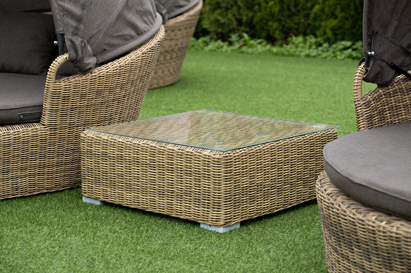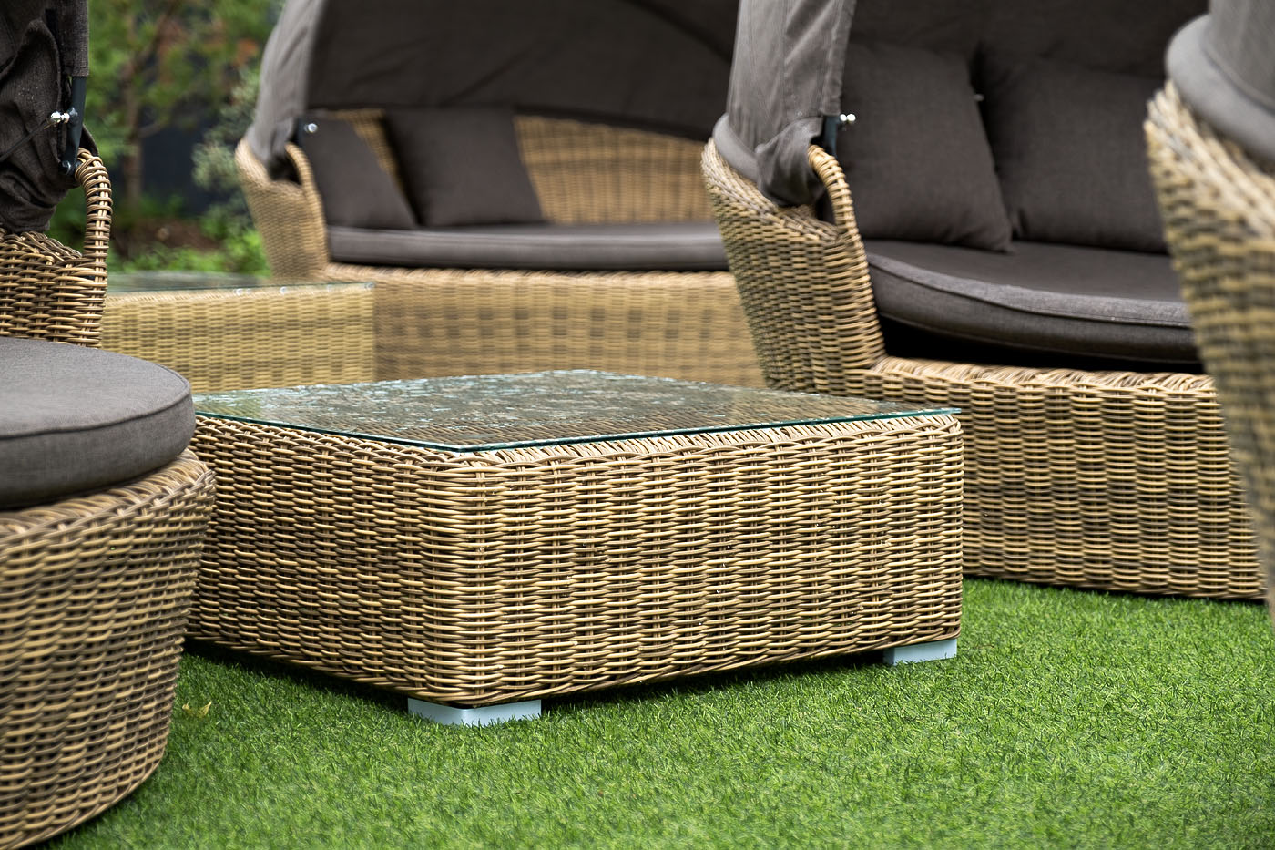 Компактные габариты позволяют удобно разместить мебельный элемент в месте с ограниченным свободным пространством. Столик имеет прочный алюминиевый каркас. Ручное круглое плетение сделано из искусственного ротанга и представлено в соломенном цвете.
