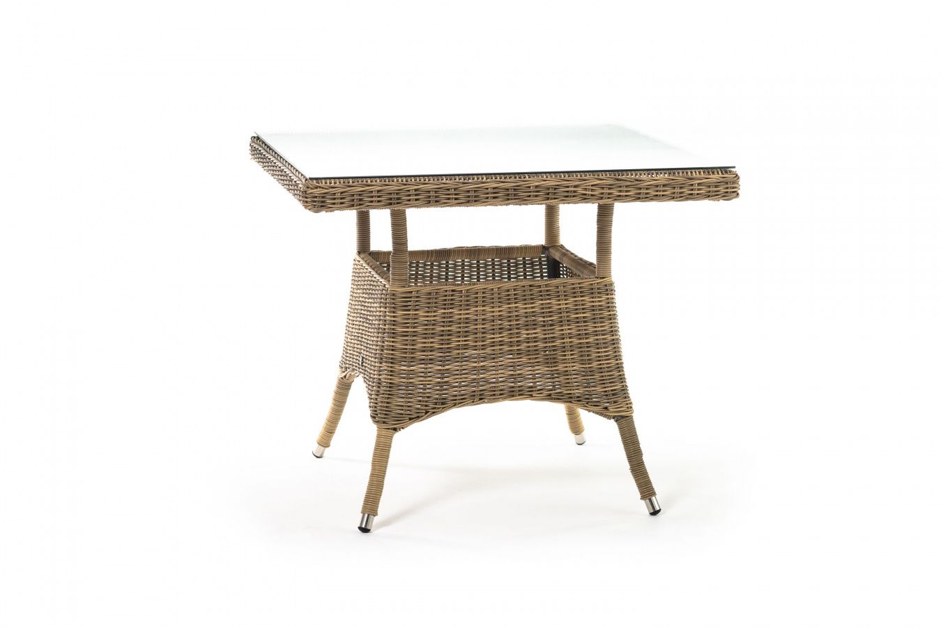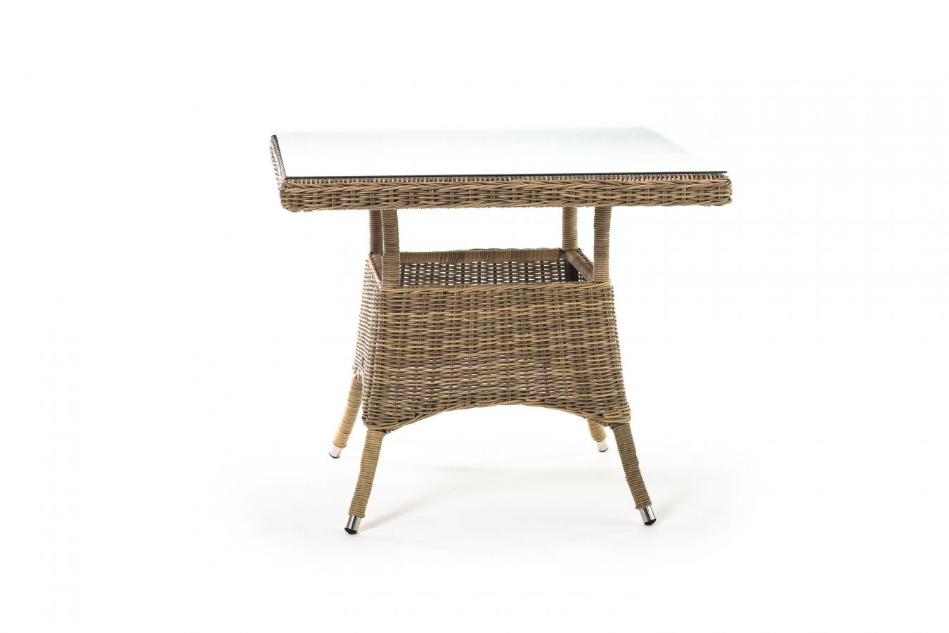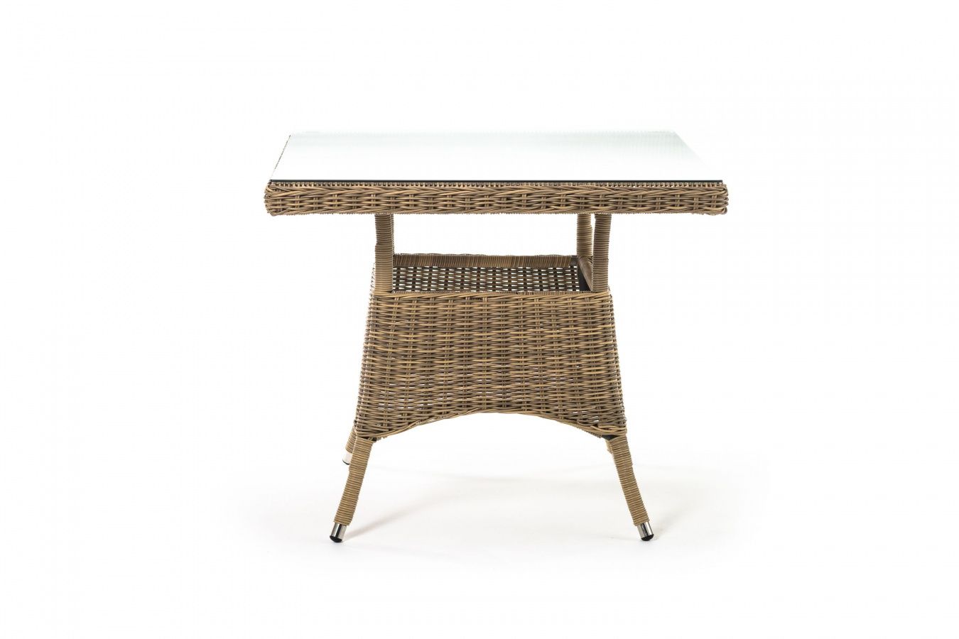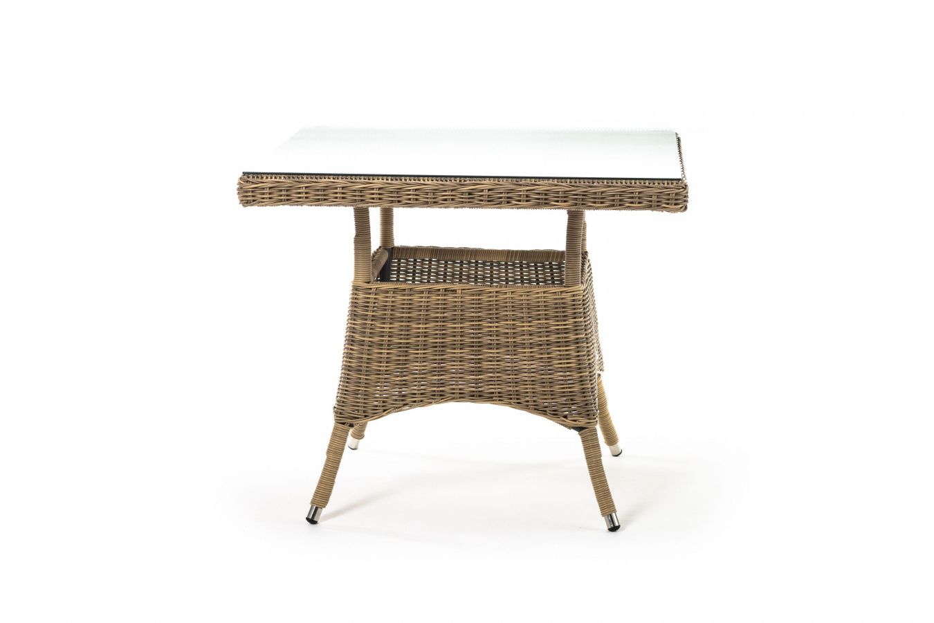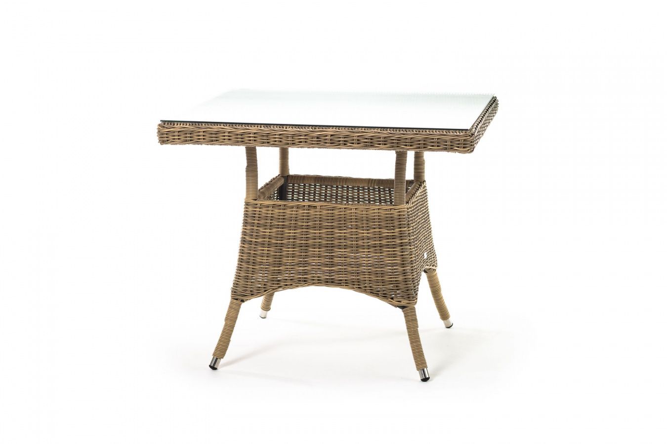 Каркас изготовлен из прочного алюминия, вручную оплетенного круглым искусственным ротангом натурального соломенного оттенка. В качестве столешницы использовано ударопрочное стекло, толщиной 5 мм. На стол можно ставить горячие тарелки и чашки, не опасаясь деформации покрытия.