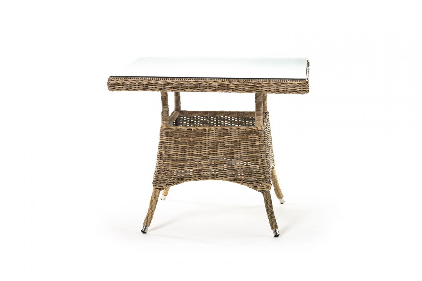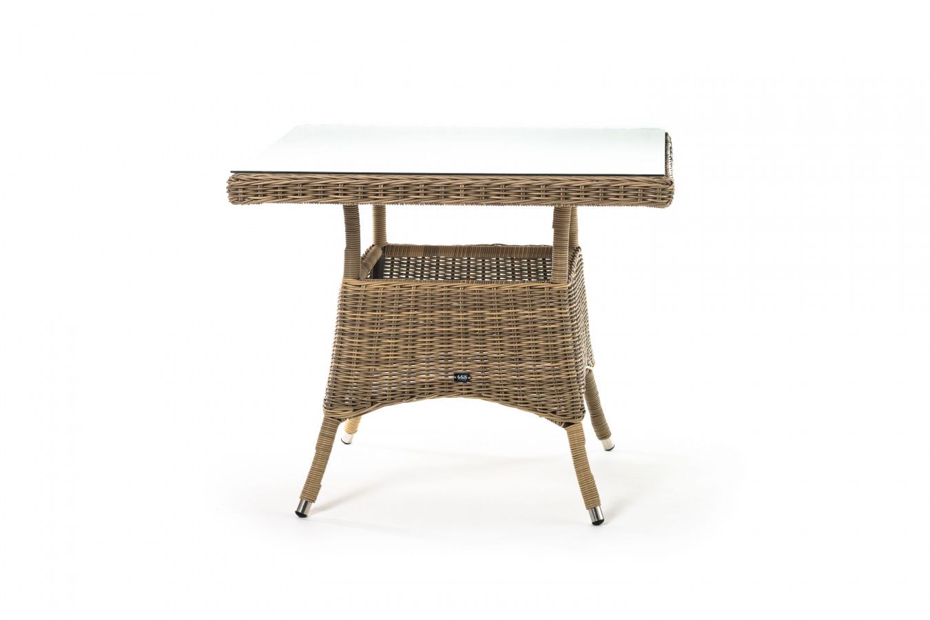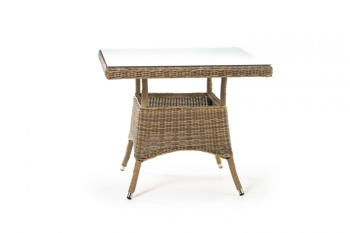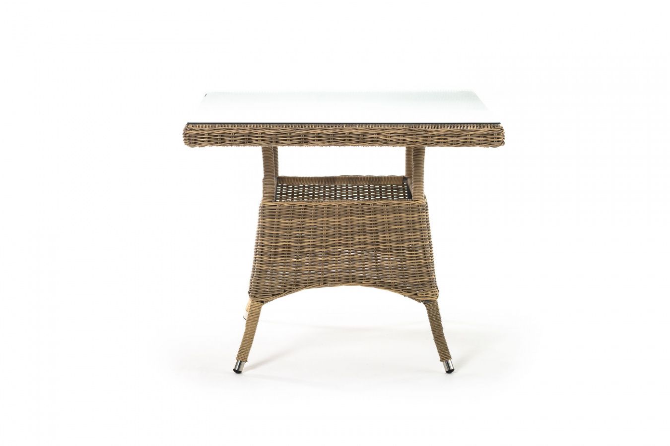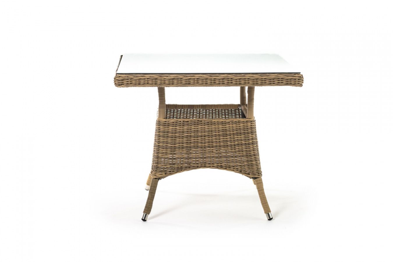 Каркас изготовлен из прочного алюминия, вручную оплетенного круглым искусственным ротангом натурального соломенного оттенка. В качестве столешницы использовано ударопрочное стекло, толщиной 5 мм. На стол можно ставить горячие тарелки и чашки, не опасаясь деформации покрытия.