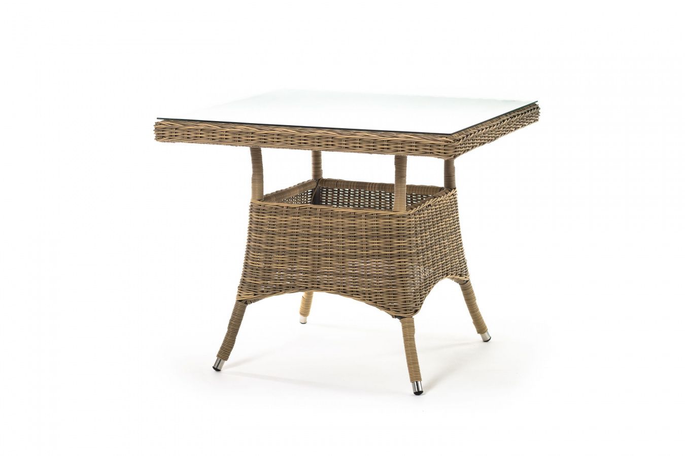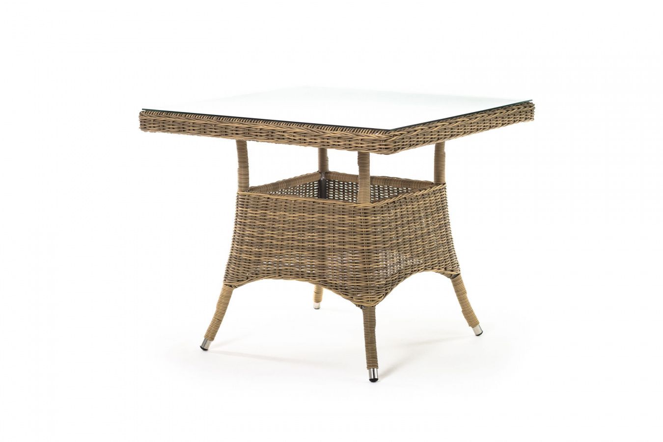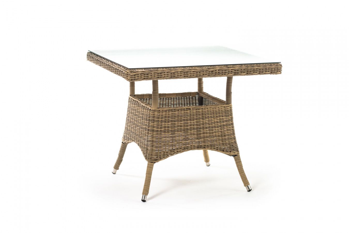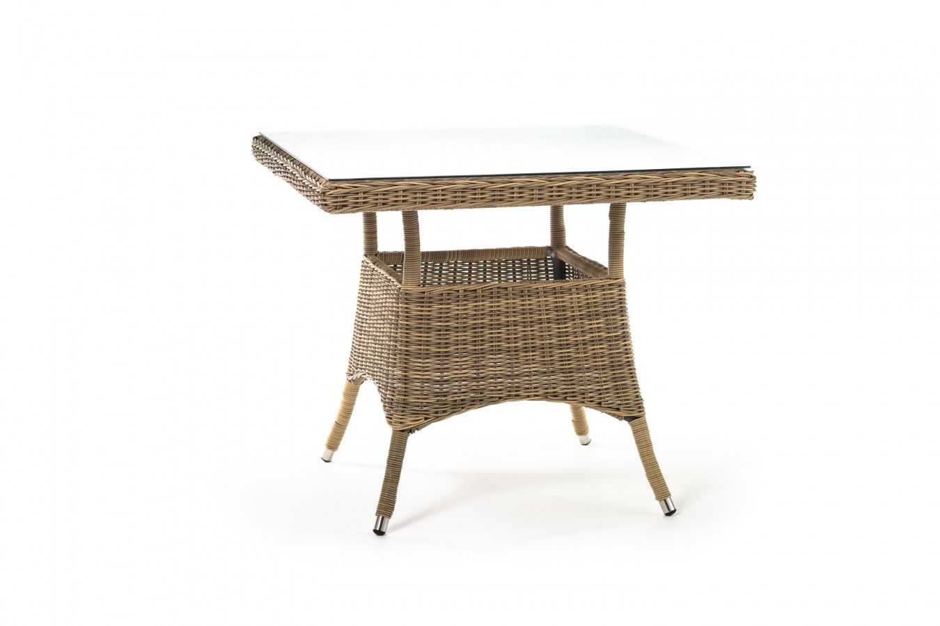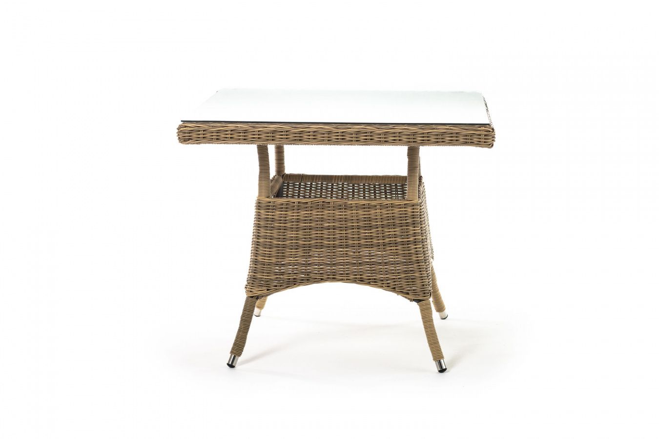 Каркас изготовлен из прочного алюминия, вручную оплетенного круглым искусственным ротангом натурального соломенного оттенка. В качестве столешницы использовано ударопрочное стекло, толщиной 5 мм. На стол можно ставить горячие тарелки и чашки, не опасаясь деформации покрытия.