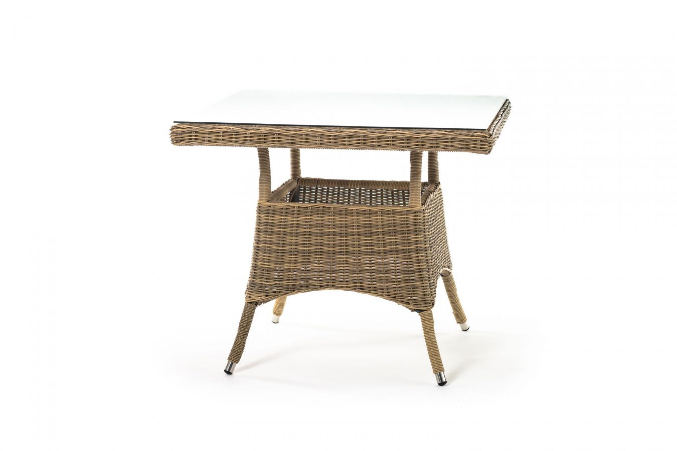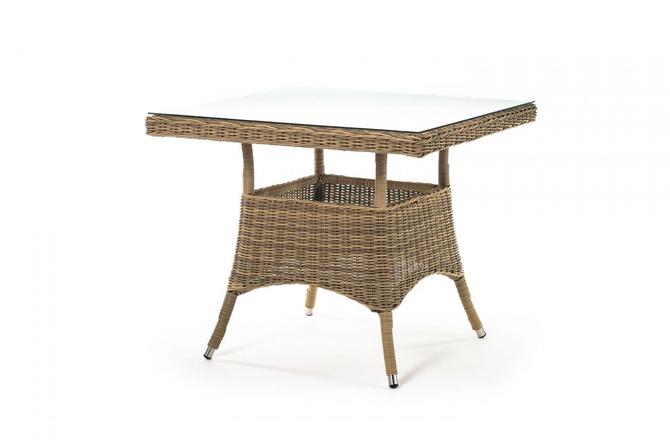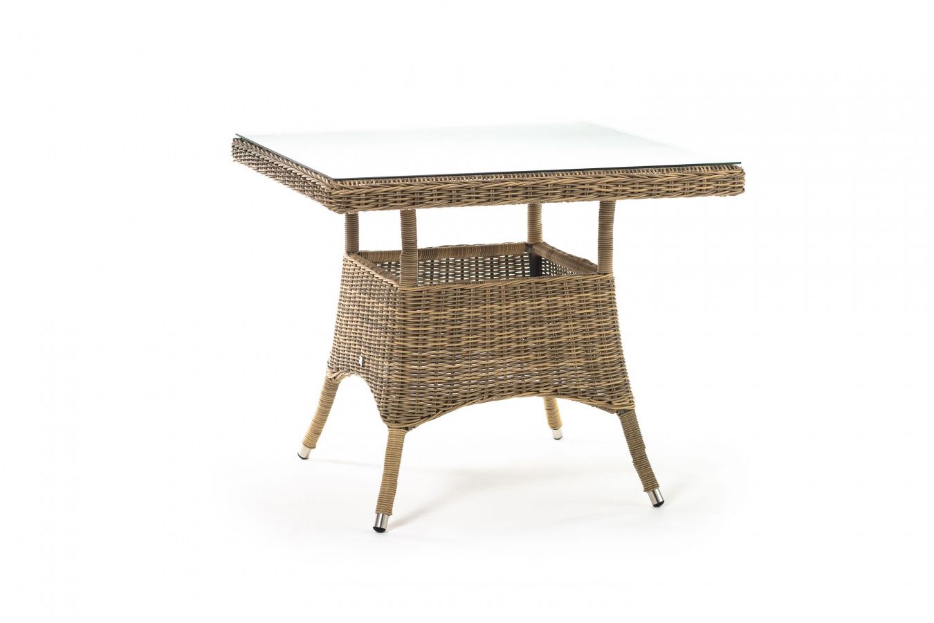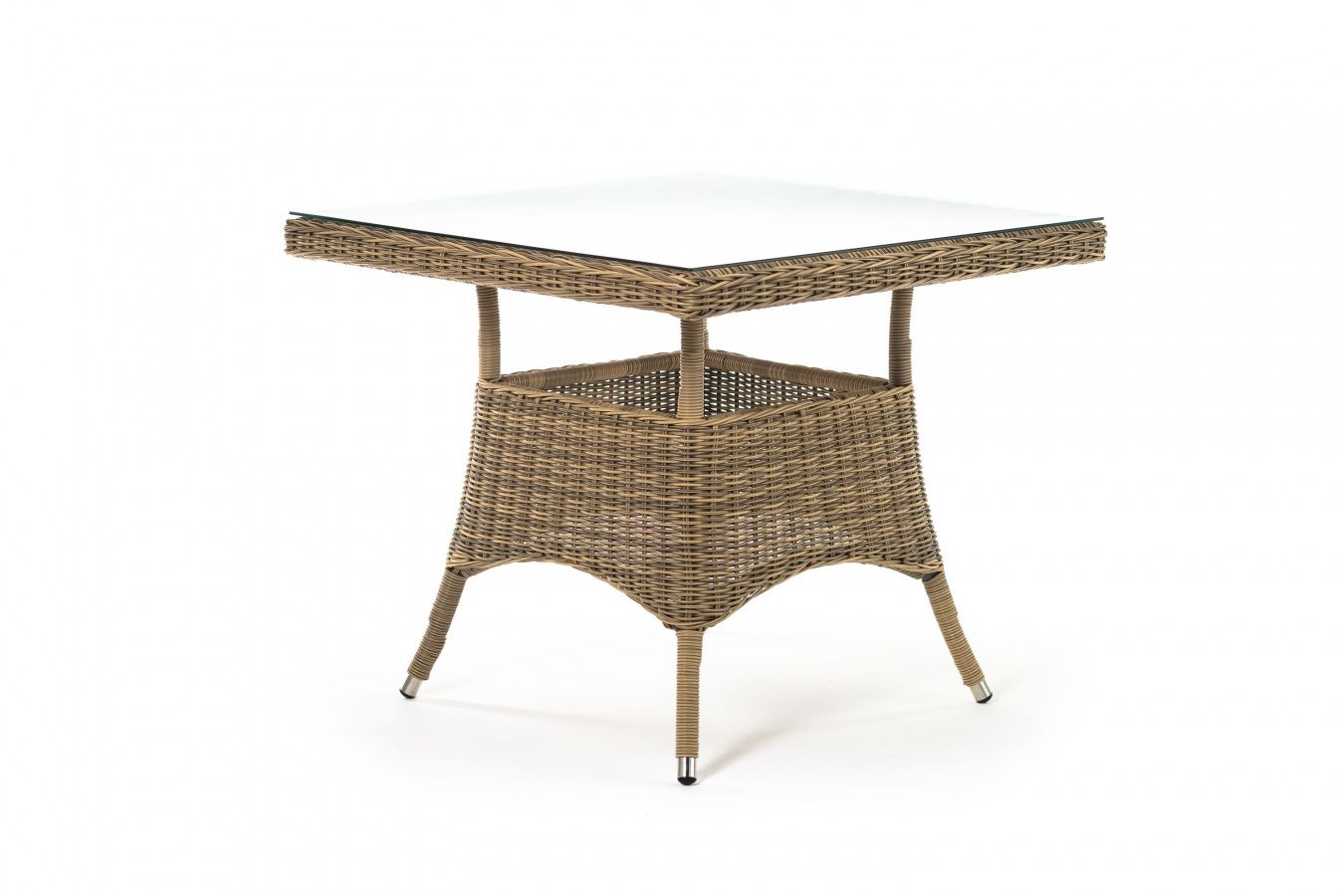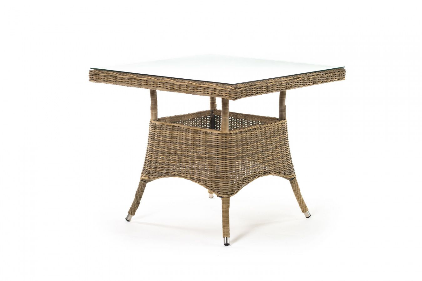 Каркас изготовлен из прочного алюминия, вручную оплетенного круглым искусственным ротангом натурального соломенного оттенка. В качестве столешницы использовано ударопрочное стекло, толщиной 5 мм. На стол можно ставить горячие тарелки и чашки, не опасаясь деформации покрытия.