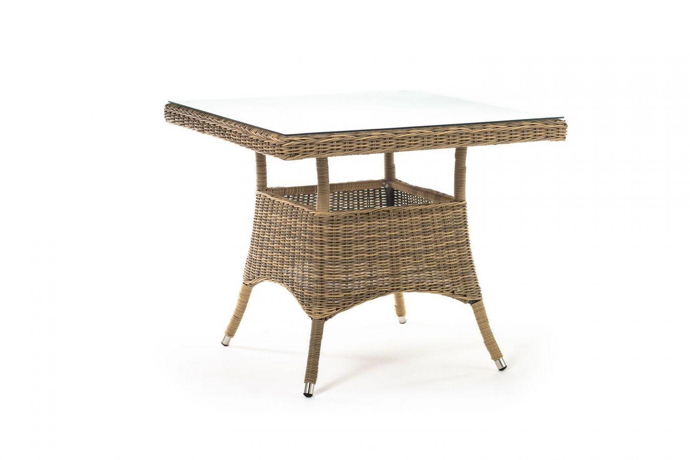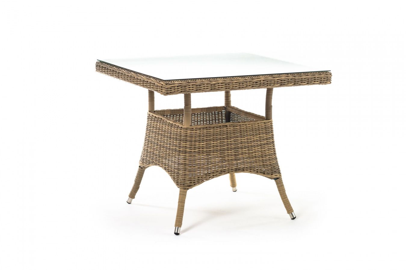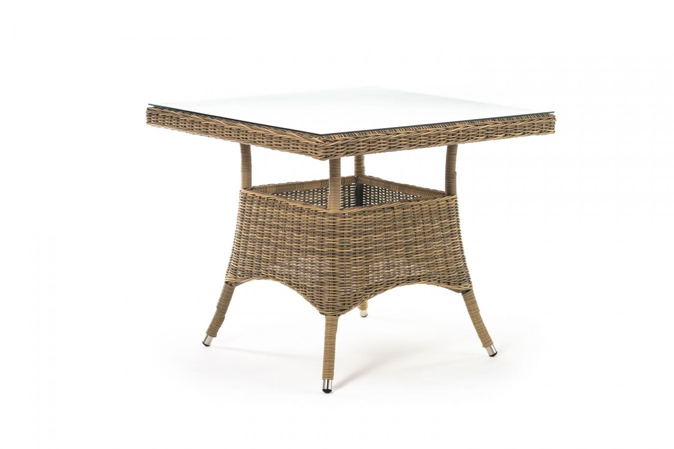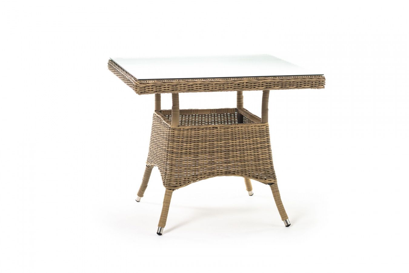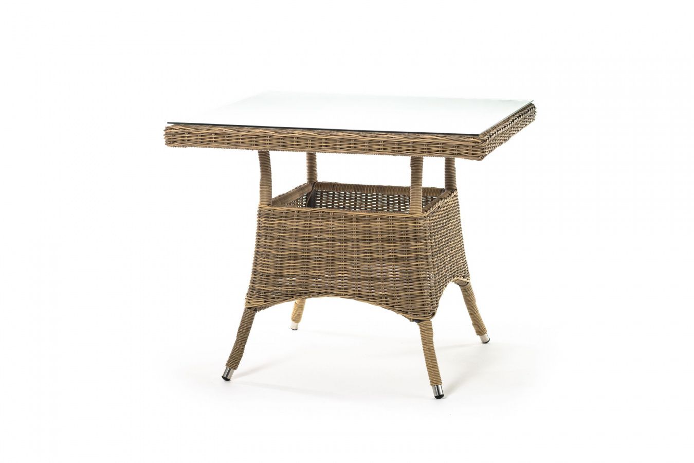 Каркас изготовлен из прочного алюминия, вручную оплетенного круглым искусственным ротангом натурального соломенного оттенка. В качестве столешницы использовано ударопрочное стекло, толщиной 5 мм. На стол можно ставить горячие тарелки и чашки, не опасаясь деформации покрытия.