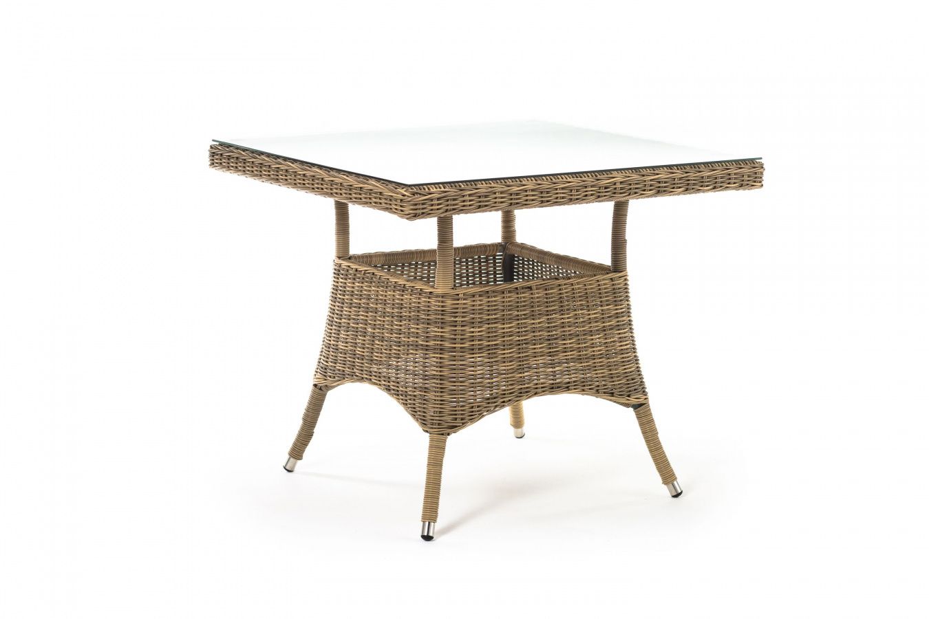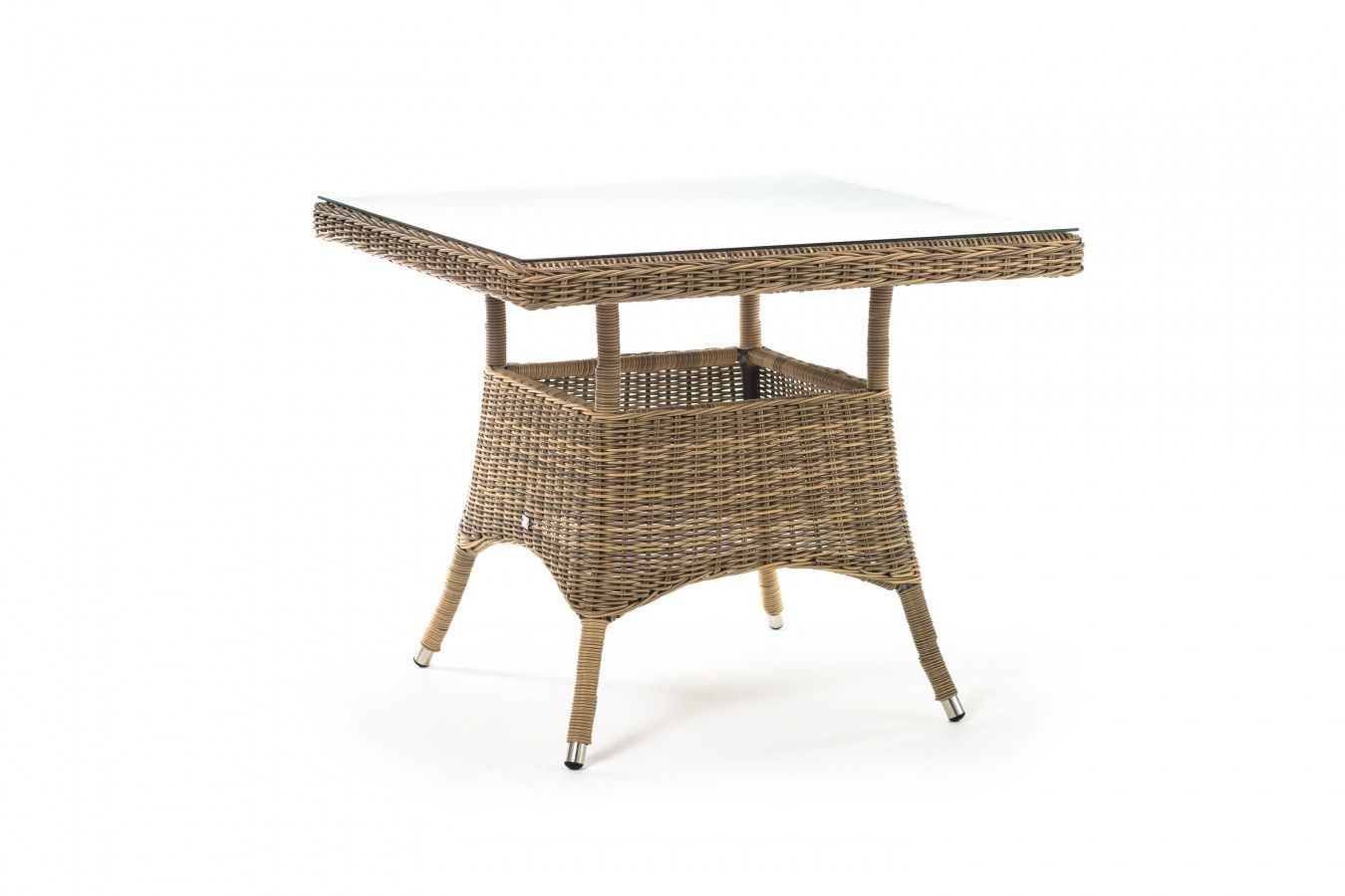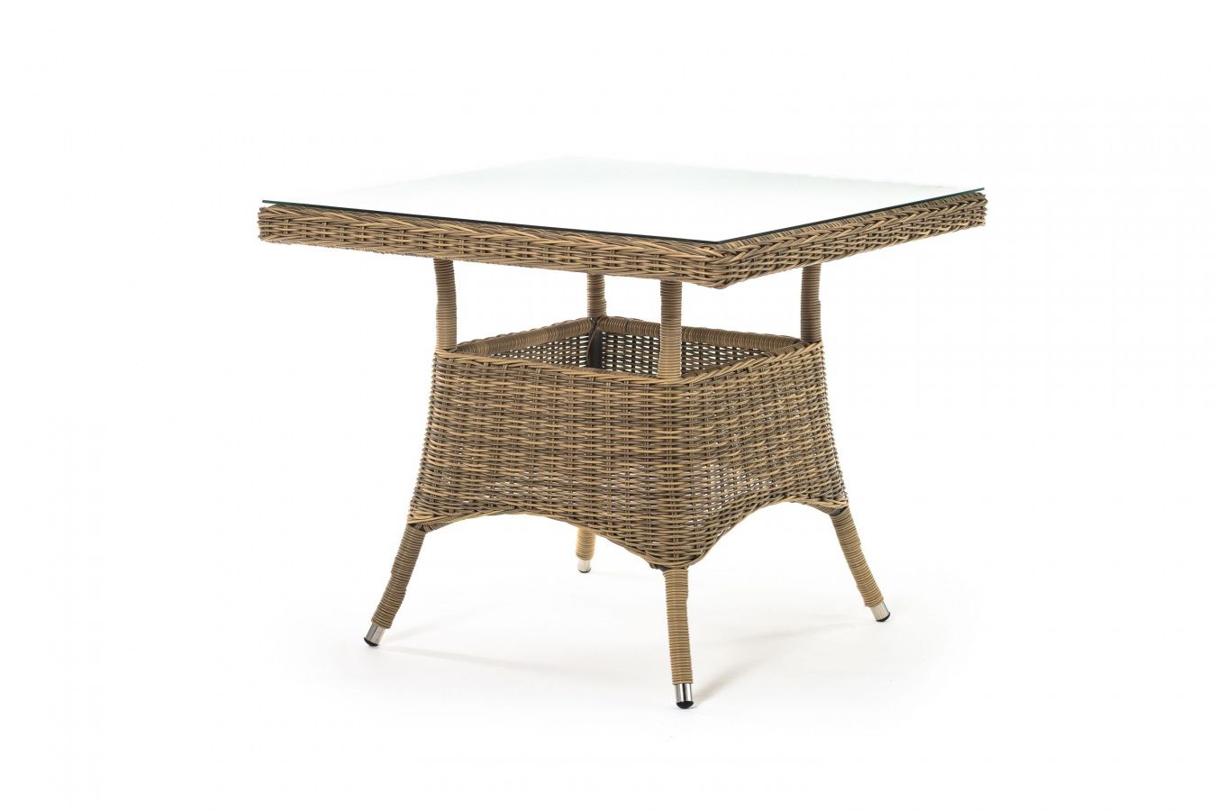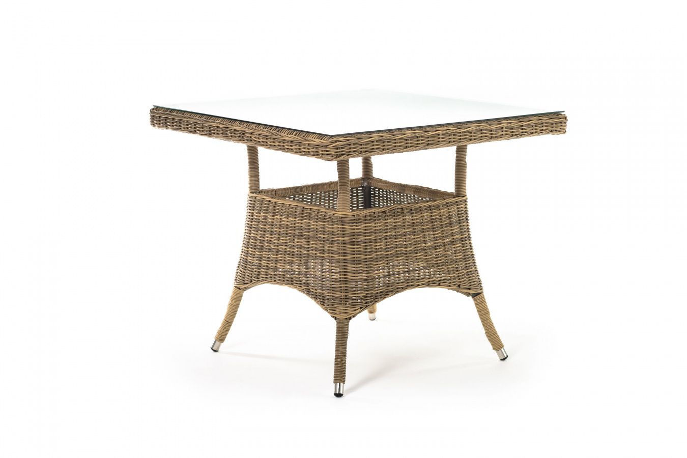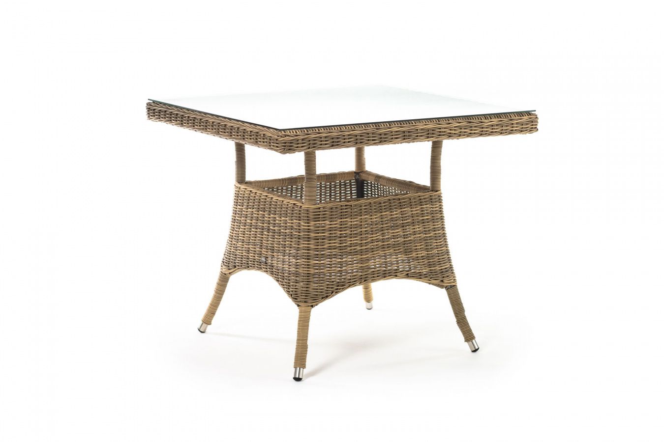Каркас изготовлен из прочного алюминия, вручную оплетенного круглым искусственным ротангом натурального соломенного оттенка. В качестве столешницы использовано ударопрочное стекло, толщиной 5 мм. На стол можно ставить горячие тарелки и чашки, не опасаясь деформации покрытия.