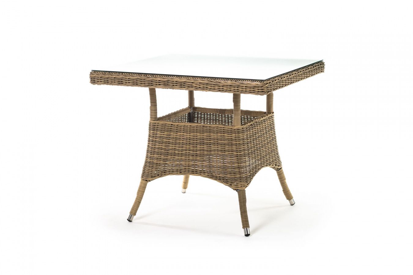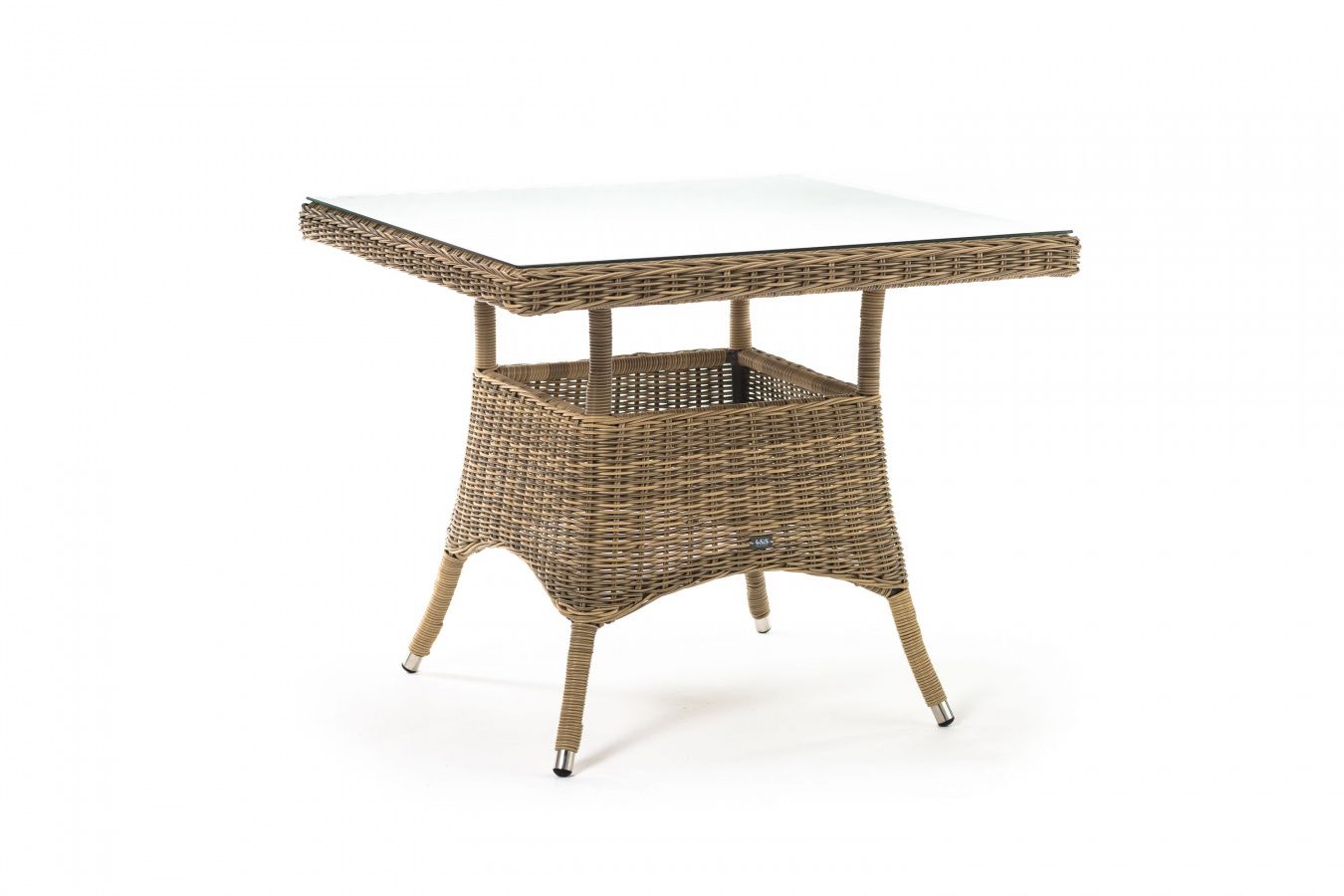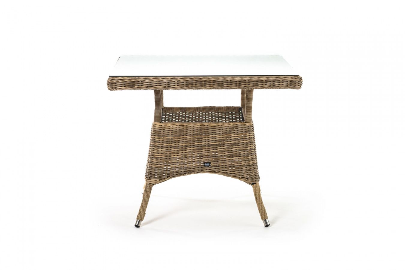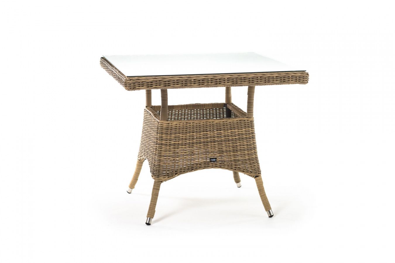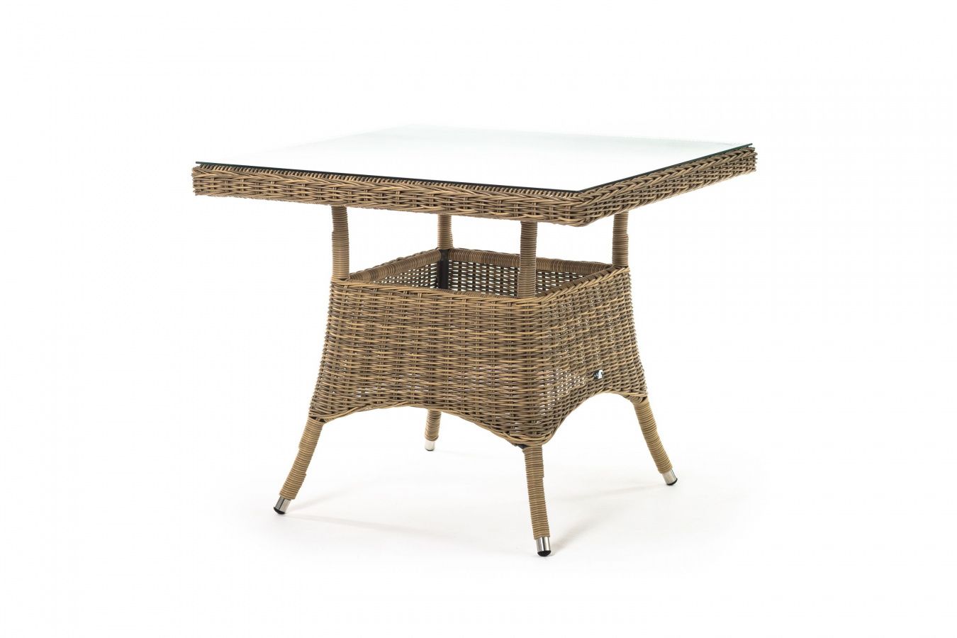 Каркас изготовлен из прочного алюминия, вручную оплетенного круглым искусственным ротангом натурального соломенного оттенка. В качестве столешницы использовано ударопрочное стекло, толщиной 5 мм. На стол можно ставить горячие тарелки и чашки, не опасаясь деформации покрытия.