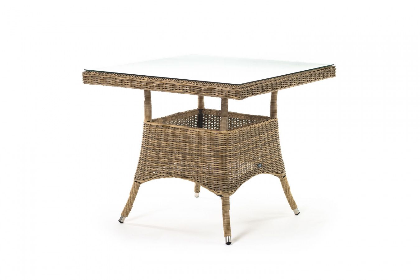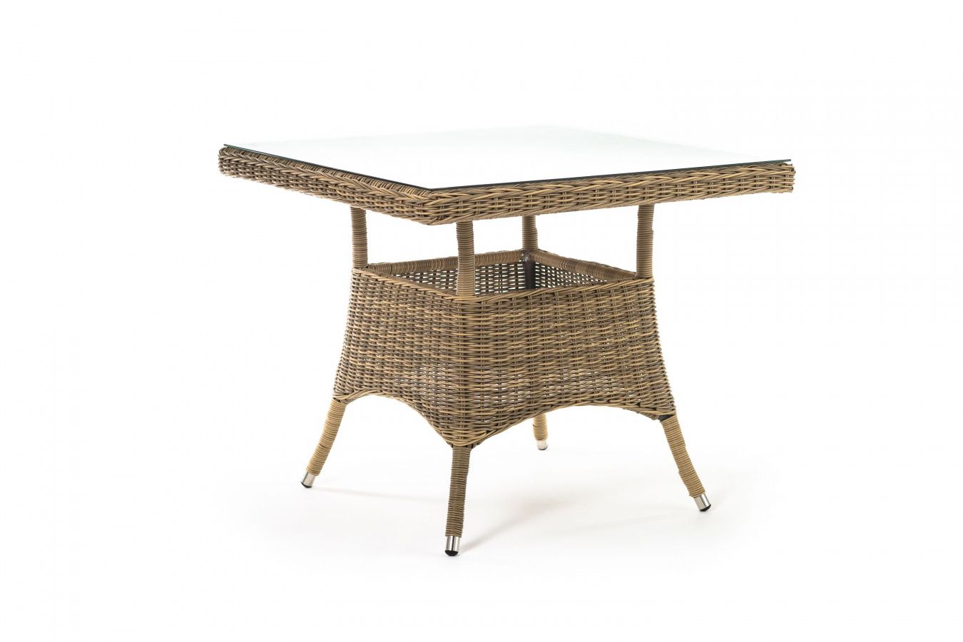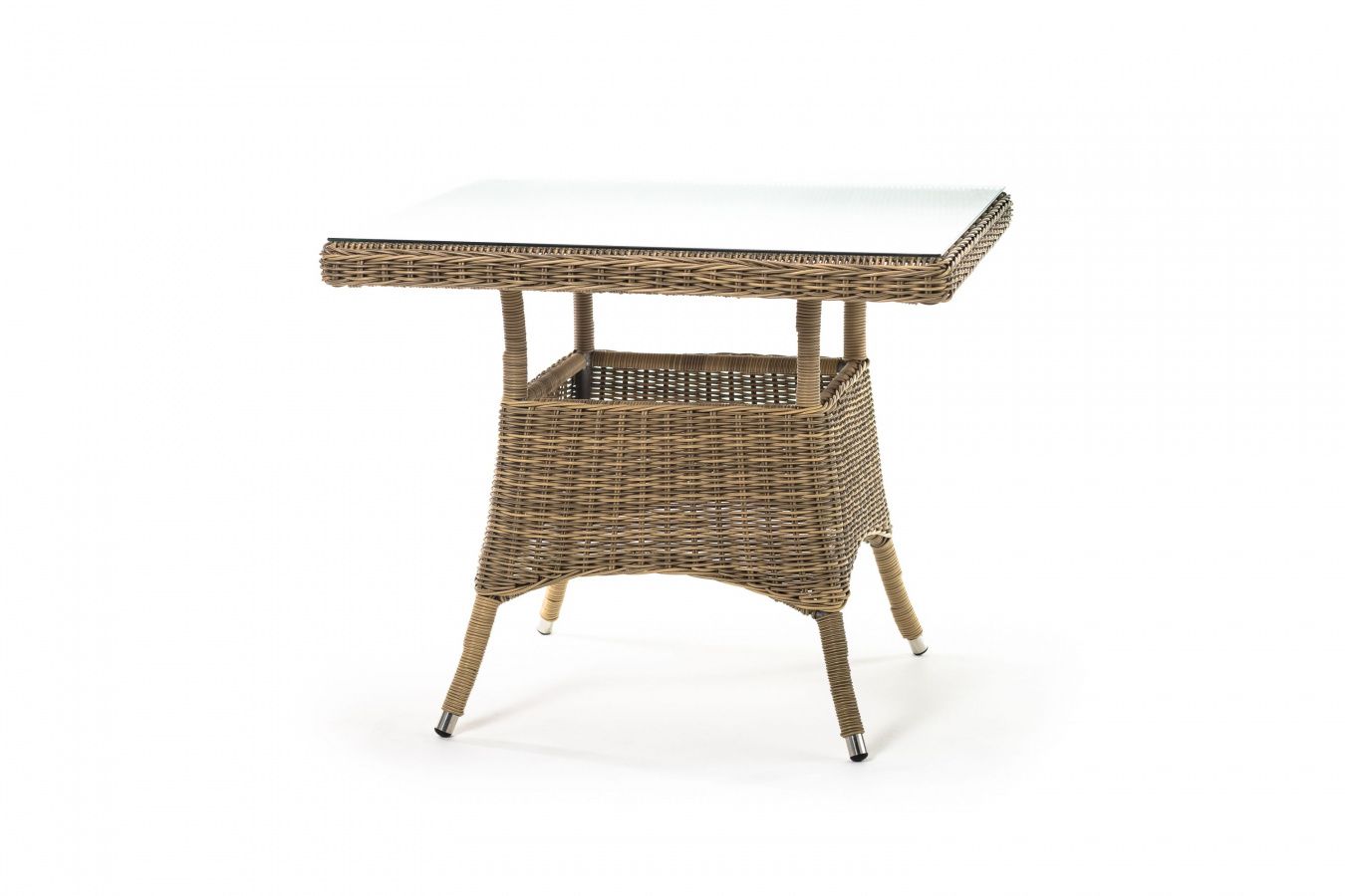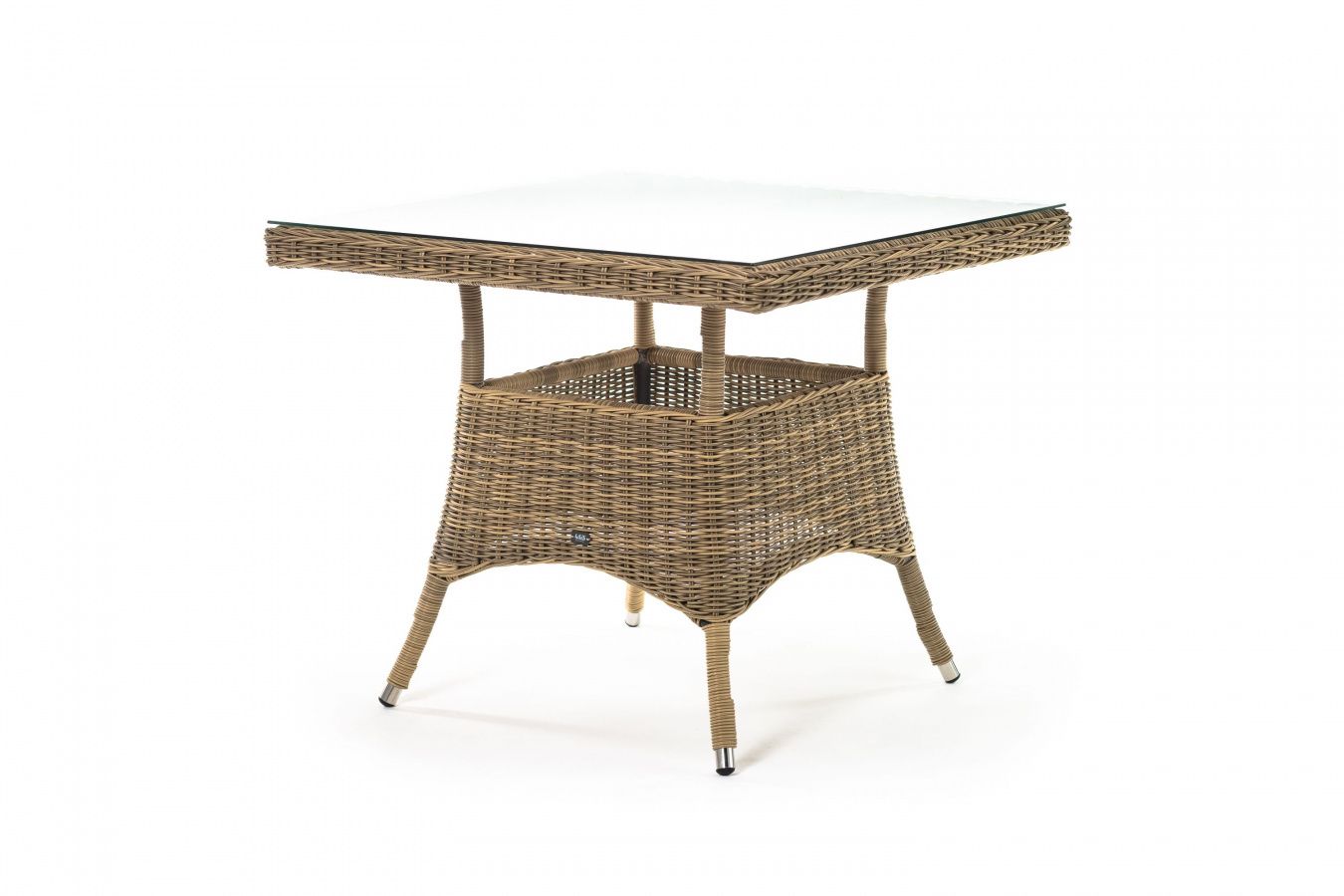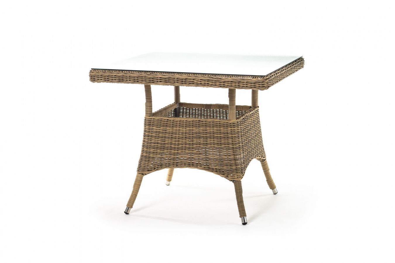 Каркас изготовлен из прочного алюминия, вручную оплетенного круглым искусственным ротангом натурального соломенного оттенка. В качестве столешницы использовано ударопрочное стекло, толщиной 5 мм. На стол можно ставить горячие тарелки и чашки, не опасаясь деформации покрытия.