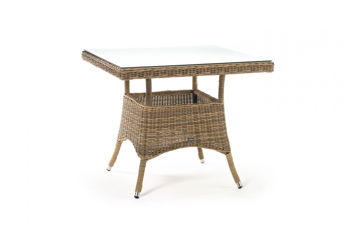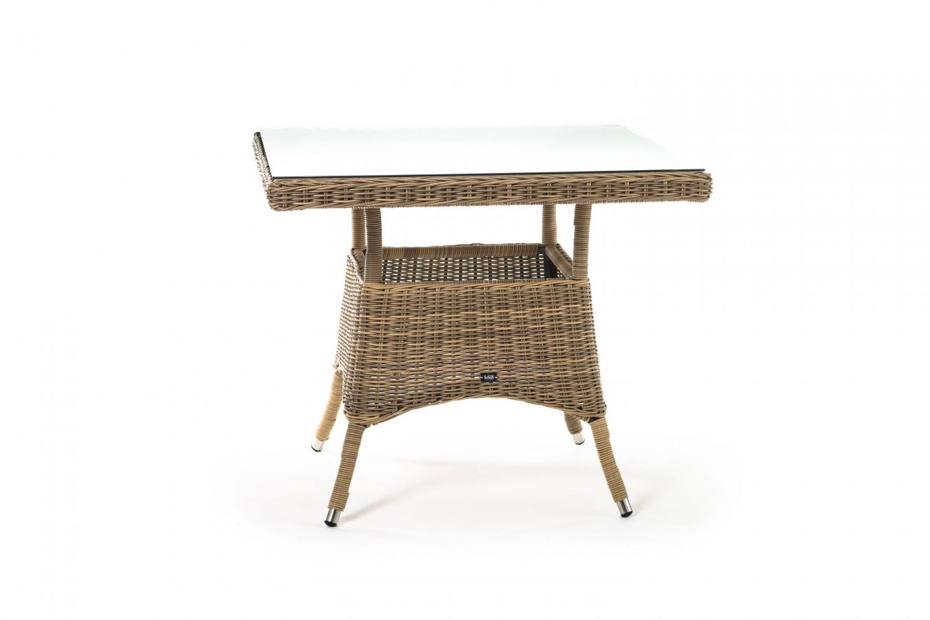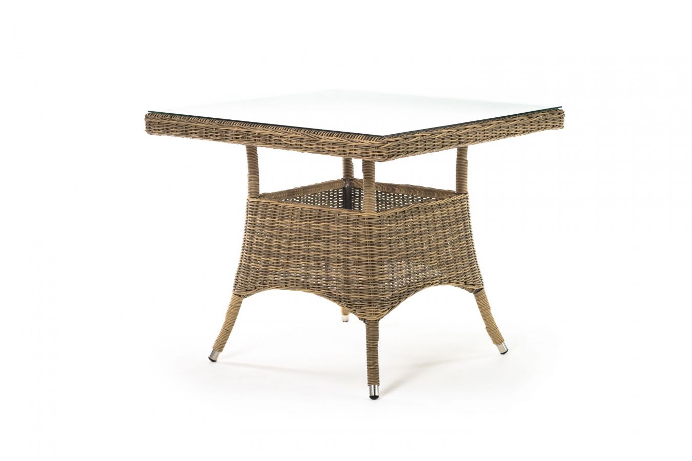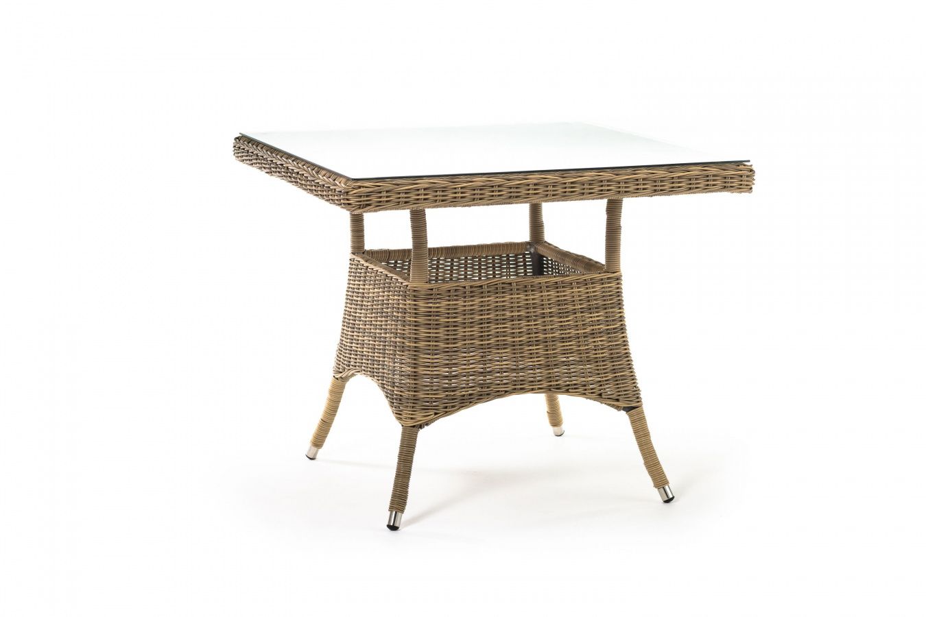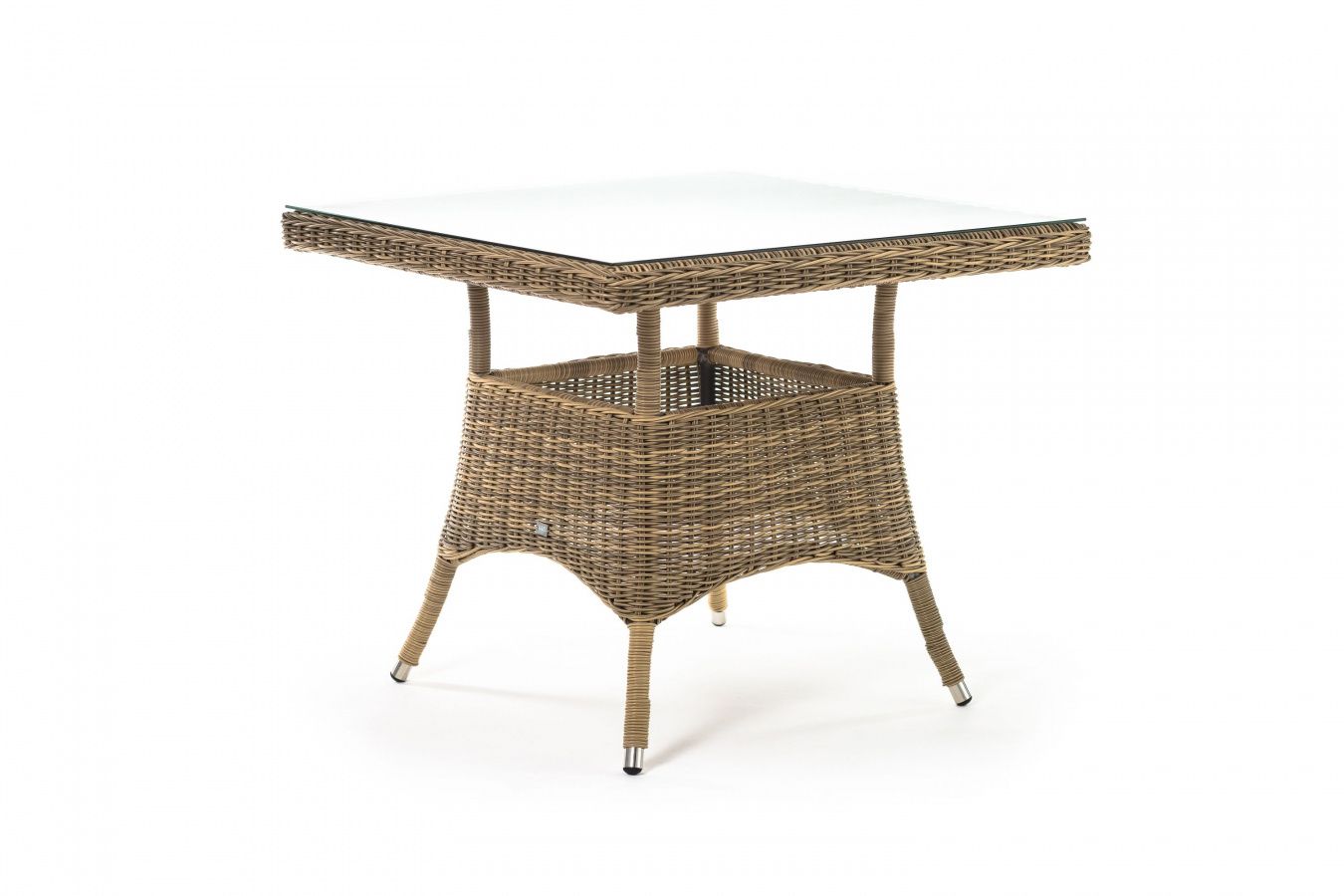 Каркас изготовлен из прочного алюминия, вручную оплетенного круглым искусственным ротангом натурального соломенного оттенка. В качестве столешницы использовано ударопрочное стекло, толщиной 5 мм. На стол можно ставить горячие тарелки и чашки, не опасаясь деформации покрытия.