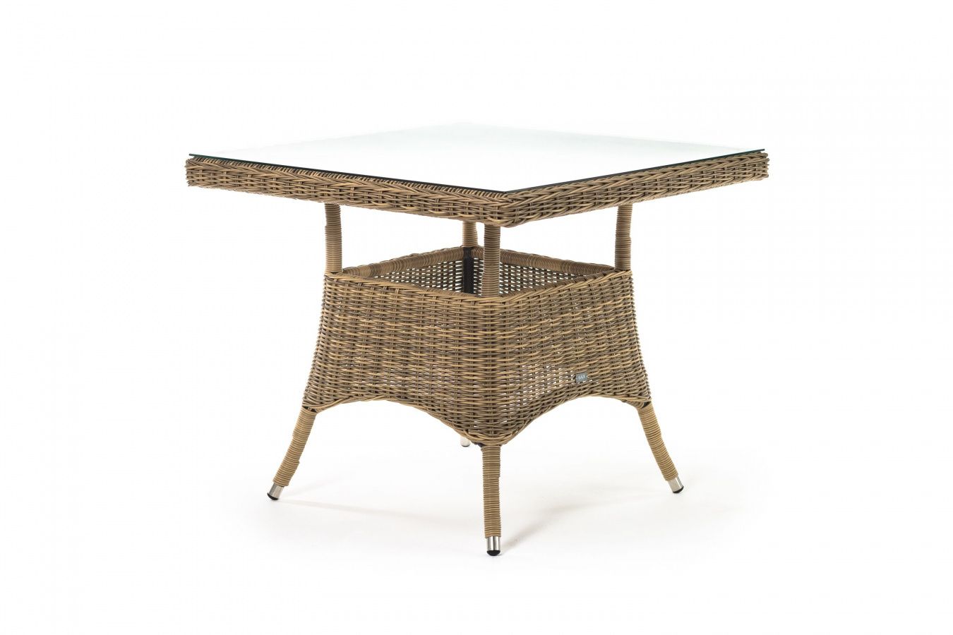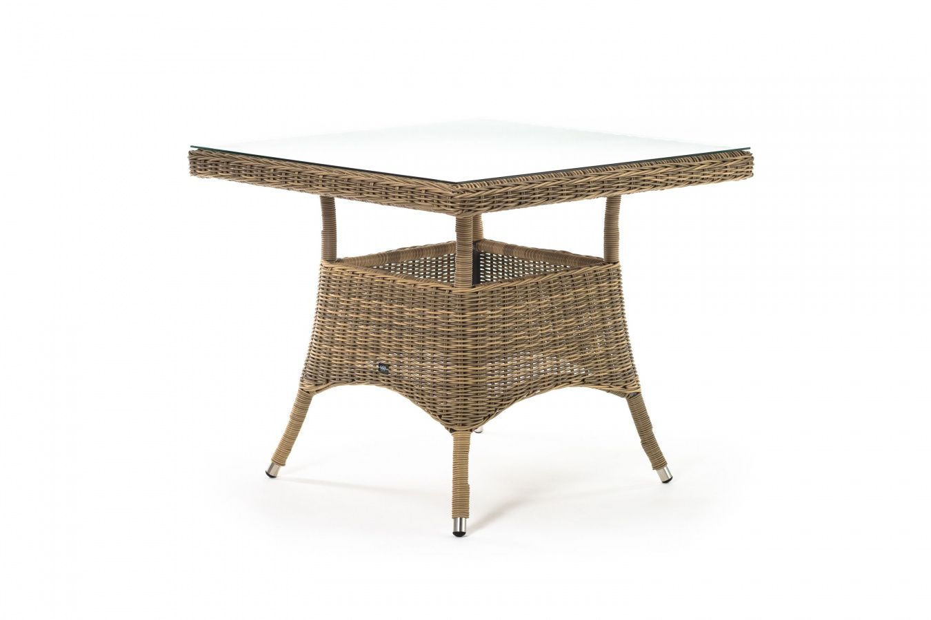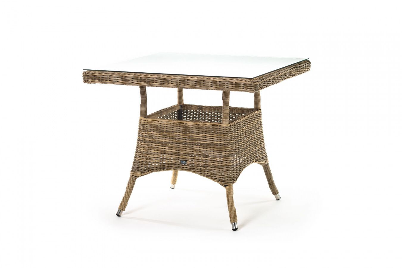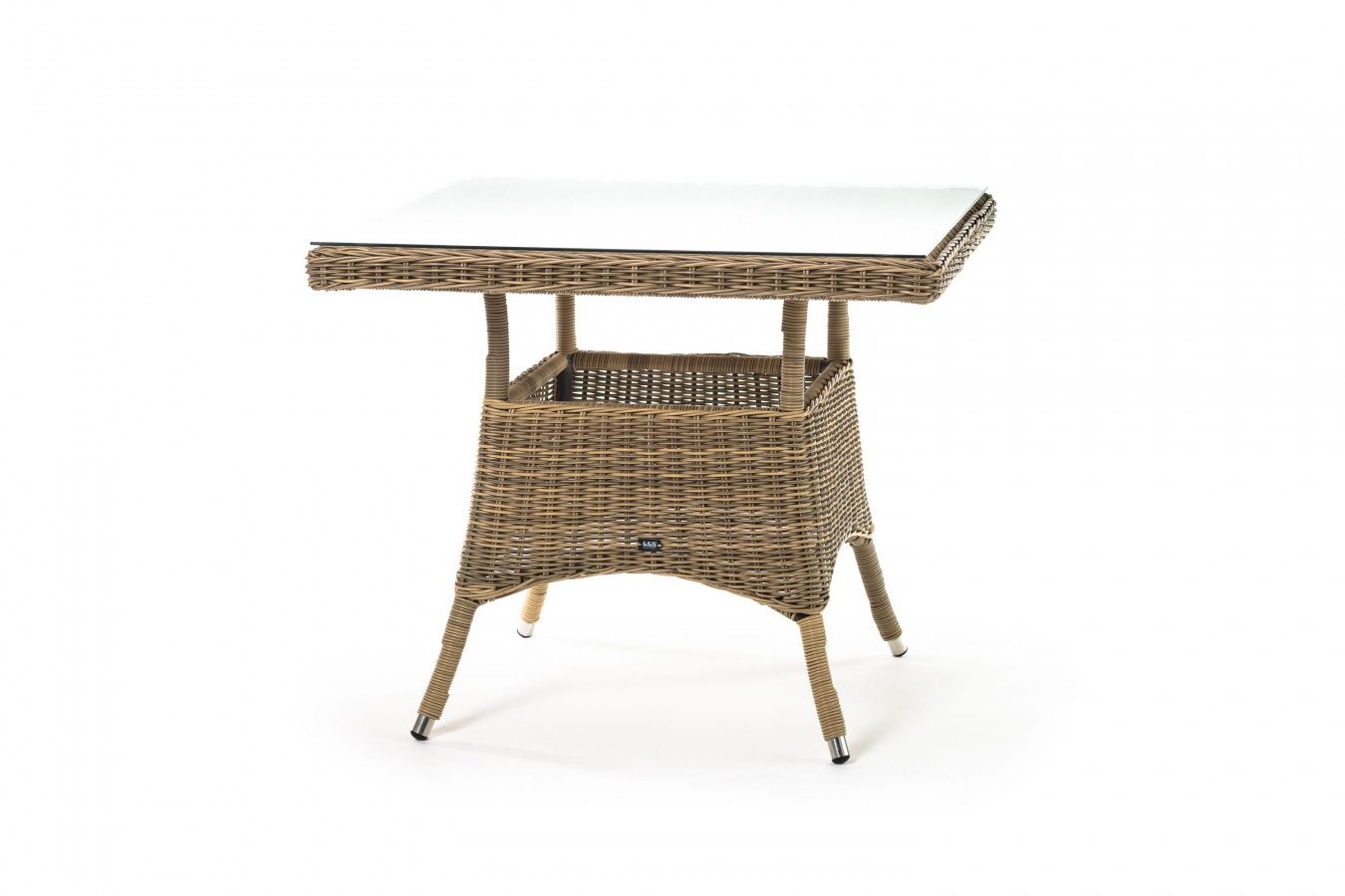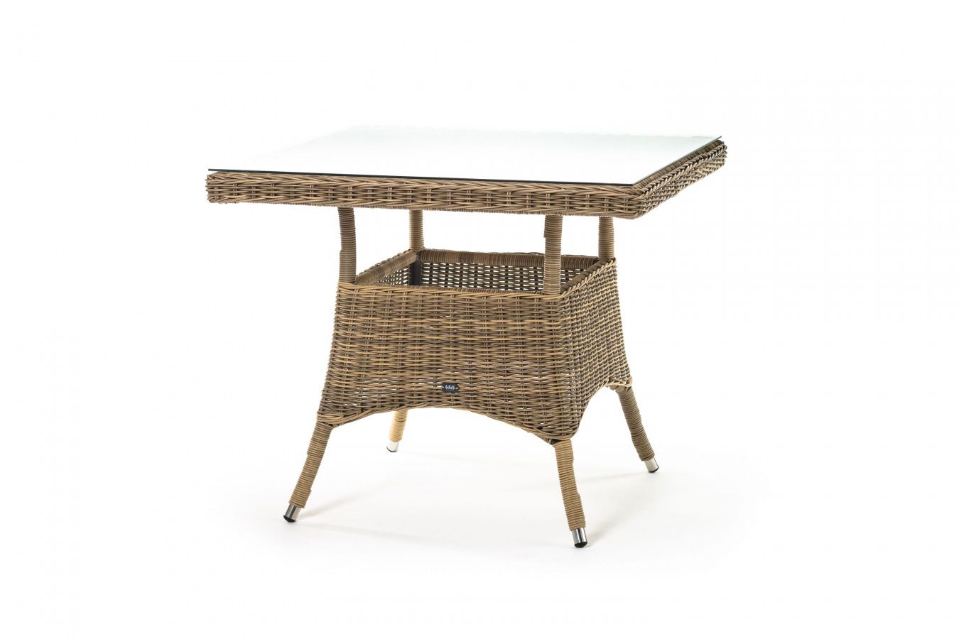 Каркас изготовлен из прочного алюминия, вручную оплетенного круглым искусственным ротангом натурального соломенного оттенка. В качестве столешницы использовано ударопрочное стекло, толщиной 5 мм. На стол можно ставить горячие тарелки и чашки, не опасаясь деформации покрытия.