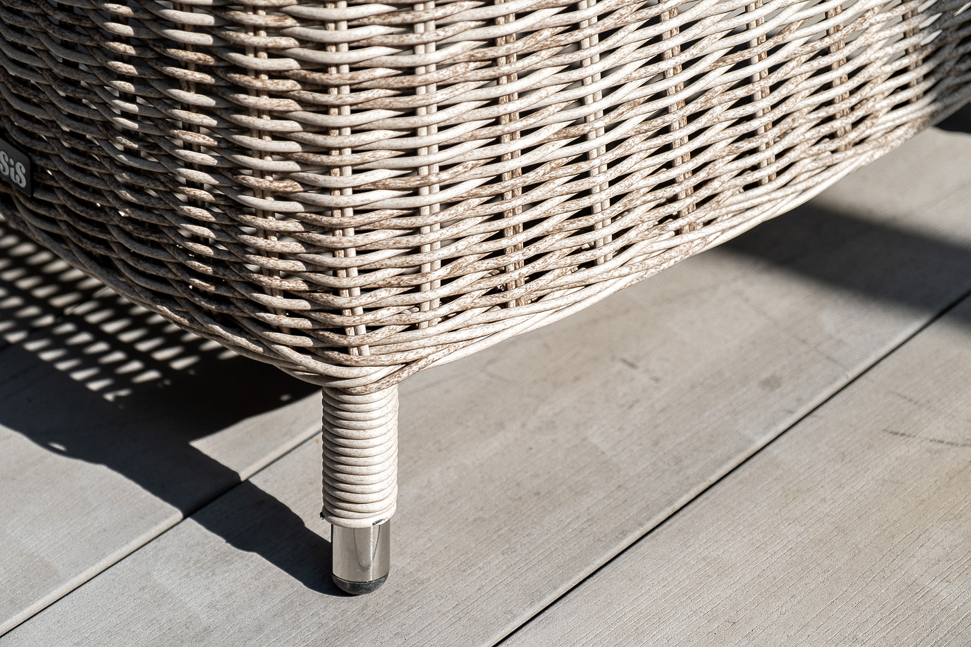 Кресло изготовлено вручную. Каркас алюминиевый, а сверху он оплетен круглым искусственным ротангом бежевого оттенка.