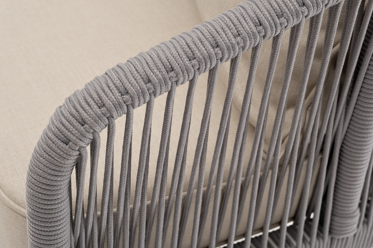 Диван имеет алюминиевый каркас, окрашенный порошковой краской в белый цвет. Боковины каркаса и спинка вручную оплетены роупом - эластичными синтетическими лентами, изготовленными из высокопрочных полиэфирных волокон. Цвет оплетки - светло-серый.