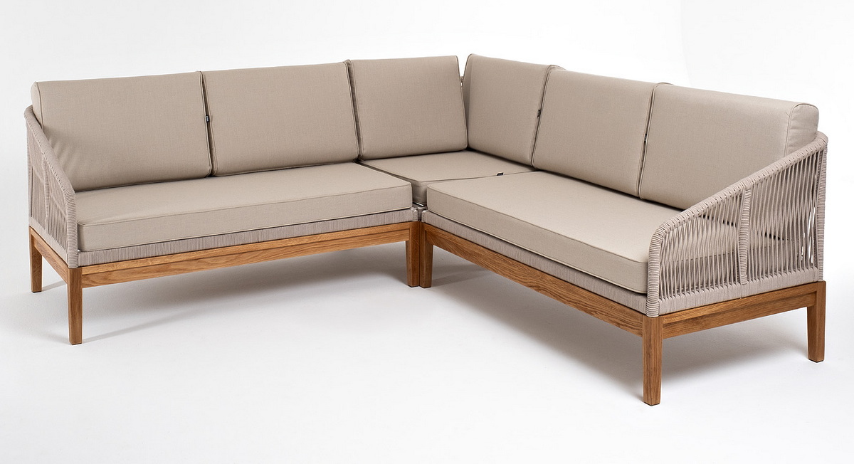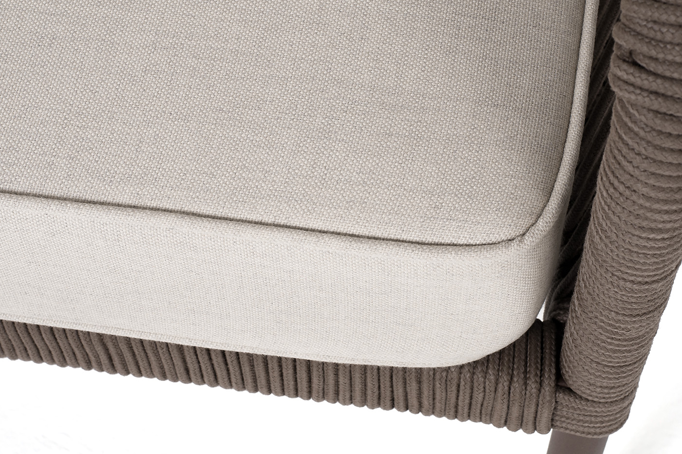 Диван имеет алюминиевый каркас, окрашенный порошковой краской в коричневый (RAL8016) цвет. Боковины каркаса вручную оплетены роупом - эластичными синтетическими лентами, изготовленными из высокопрочных полиэфирных волокон. Цвет оплетки - коричневый.