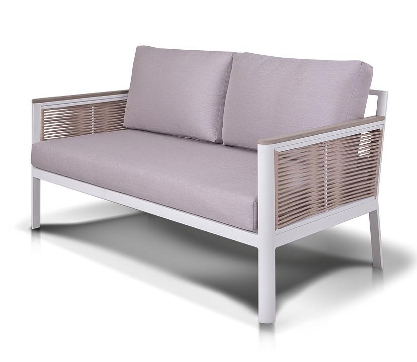 Каркас выполнен из высококачественного алюминия и окрашен порошковой краской в белый цвет. Боковые стороны подлокотников вручную оплетены эластичными синтетическими лентами серо-коричневого оттенка, состоящие из высокопрочных полиэфирных волокон.