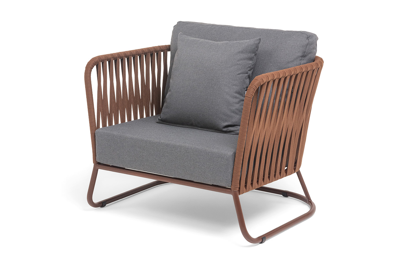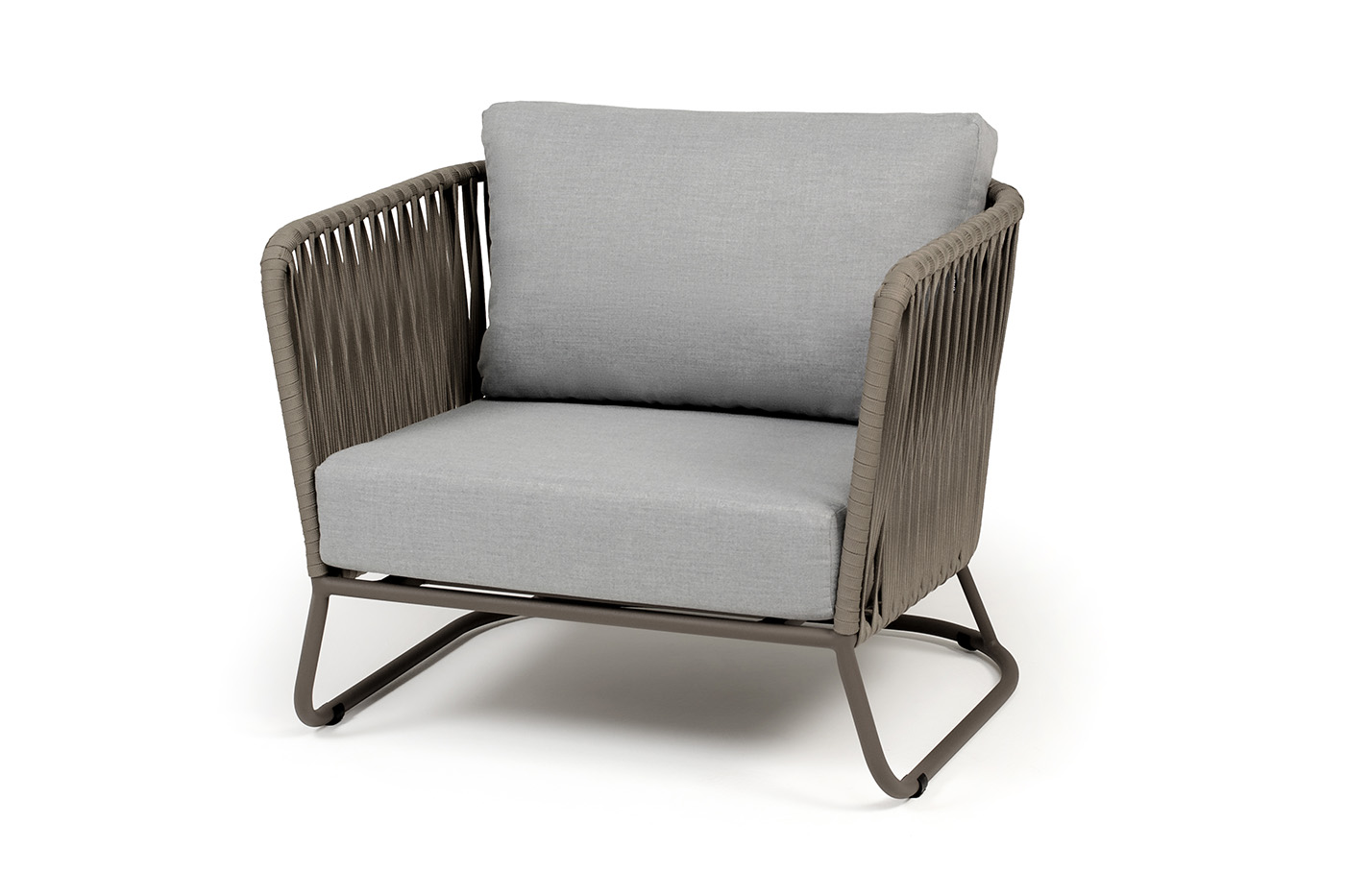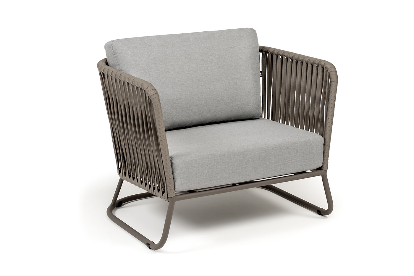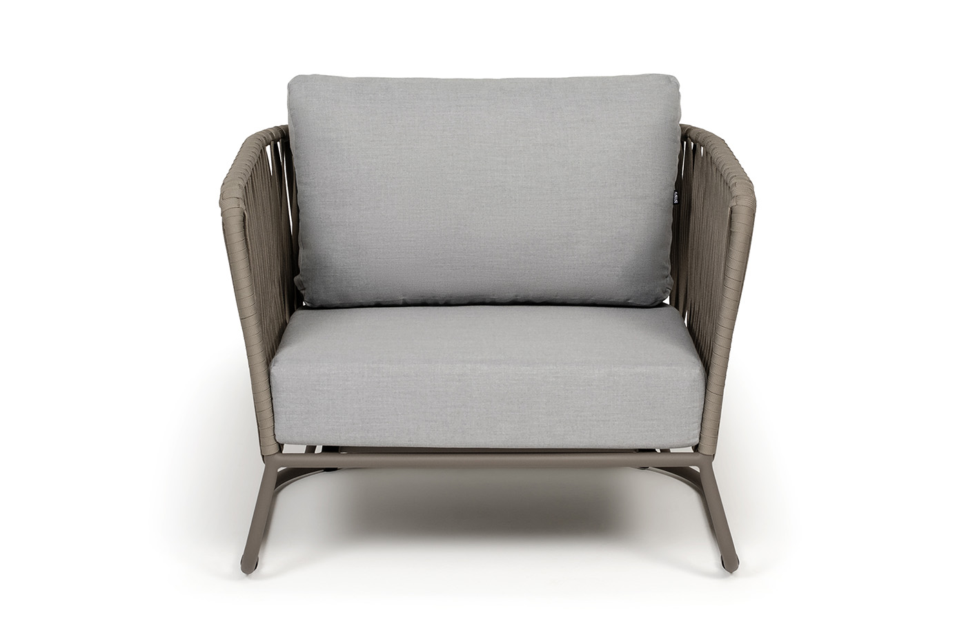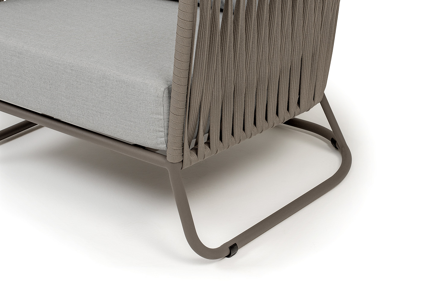 Кресло имеет алюминиевый каркас, окрашенный порошковой краской в бежево-серый (RAL7006) цвет. Боковины каркаса вручную оплетены роупом - эластичными синтетическими лентами, изготовленными из высокопрочных полиэфирных волокон. Цвет оплетки - серо-коричневый.