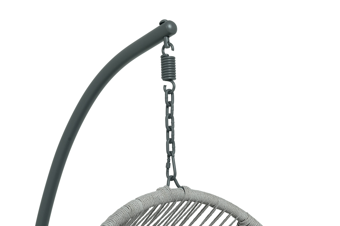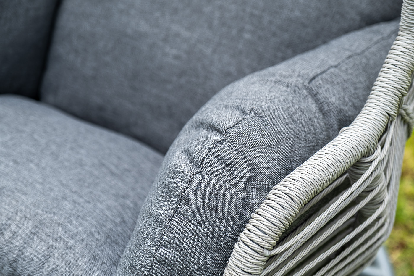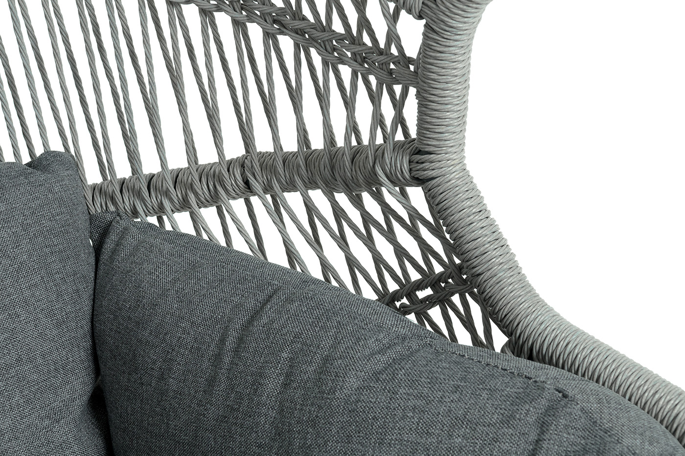 Каркас изготовлен из стали, окрашенного порошковой износостойкой краской серого цвета. Оплетка – плоский искусственный ротанг серого оттенка. Материал устойчив к перепадам погоды и подходит для использования на открытых пространствах.