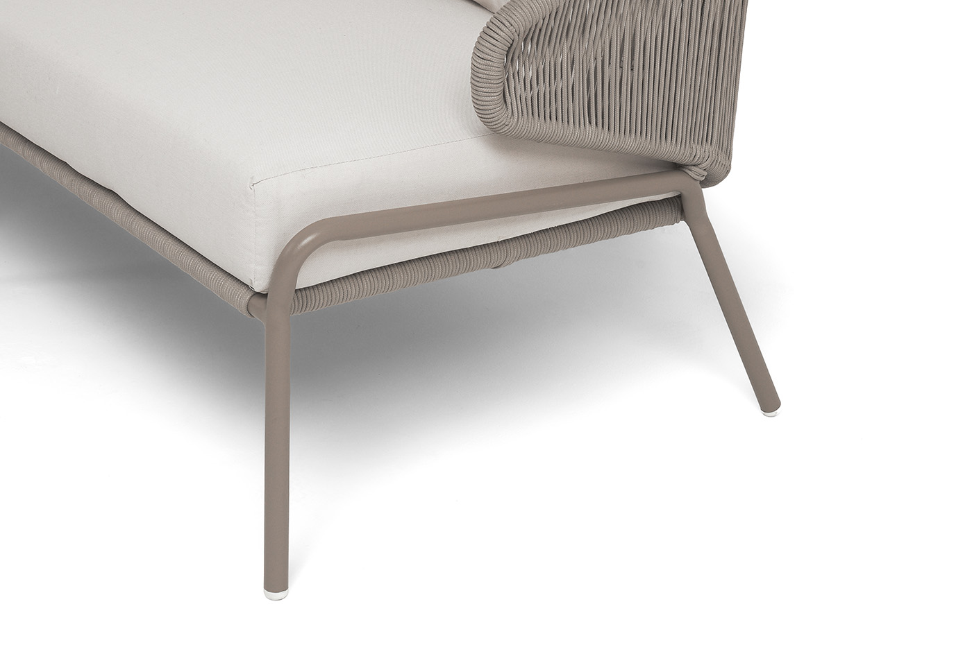 Диван имеет алюминиевый каркас, цвет - серый шёлк. Боковины каркаса и спинка вручную оплетены роупом - эластичными синтетическими лентами, изготовленными из высокопрочных полиэфирных волокон. Цвет оплетки – бежевый.