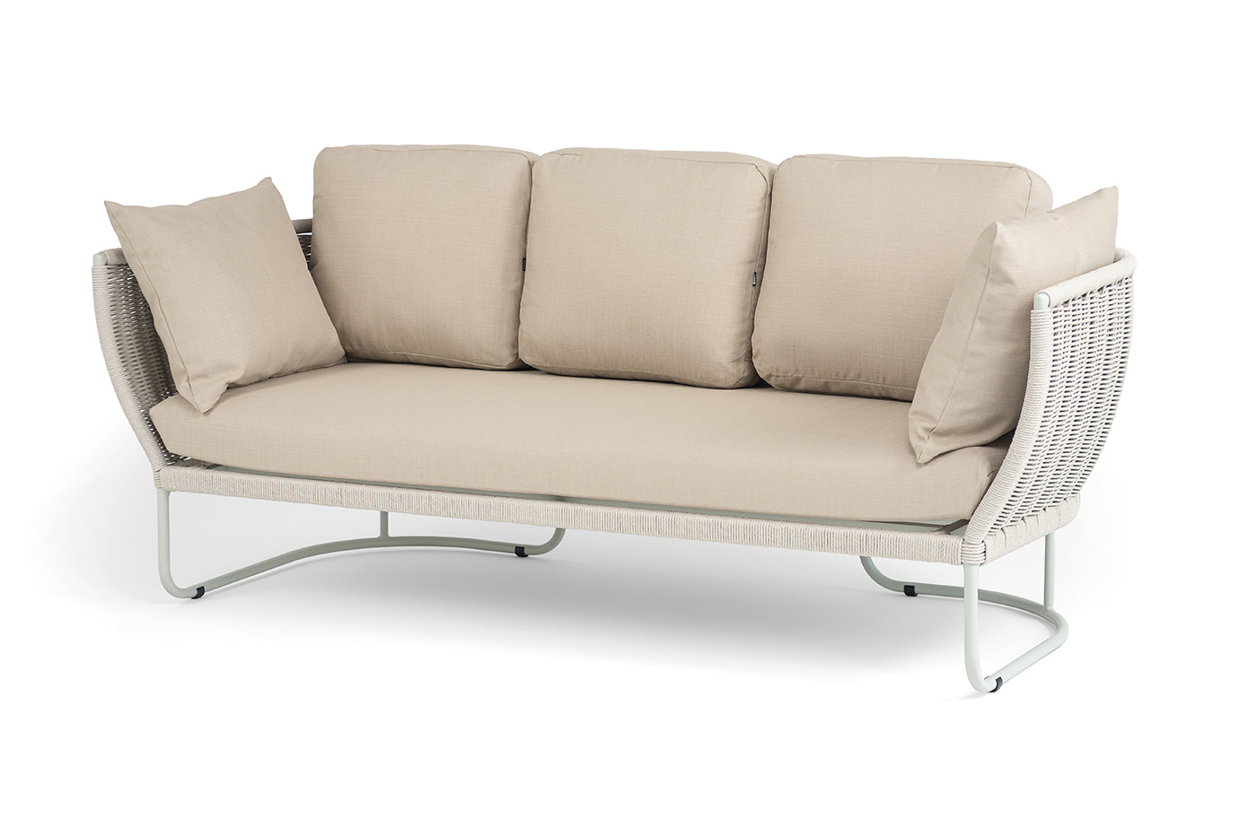 В комплект входят подушки с плотным наполнителем и съёмными чехлами. Чехлы изготовлены из материала Mossle бежевого цвета, обработаны влагоотталкивающей пропиткой. Тип ткани - рогожка.