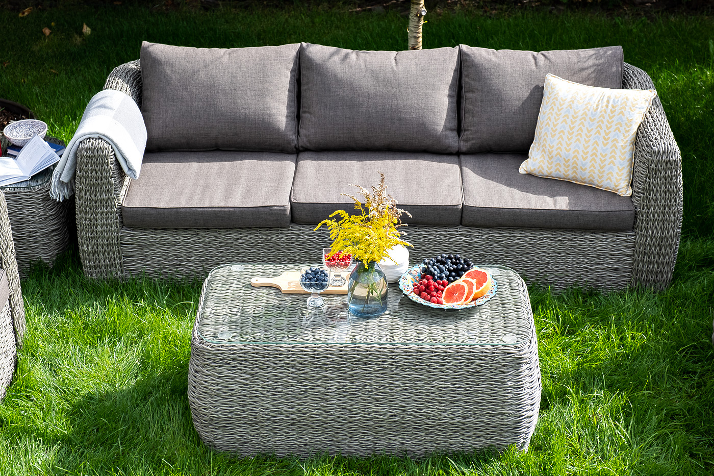 Плетеный столик представлен в сером цвете.