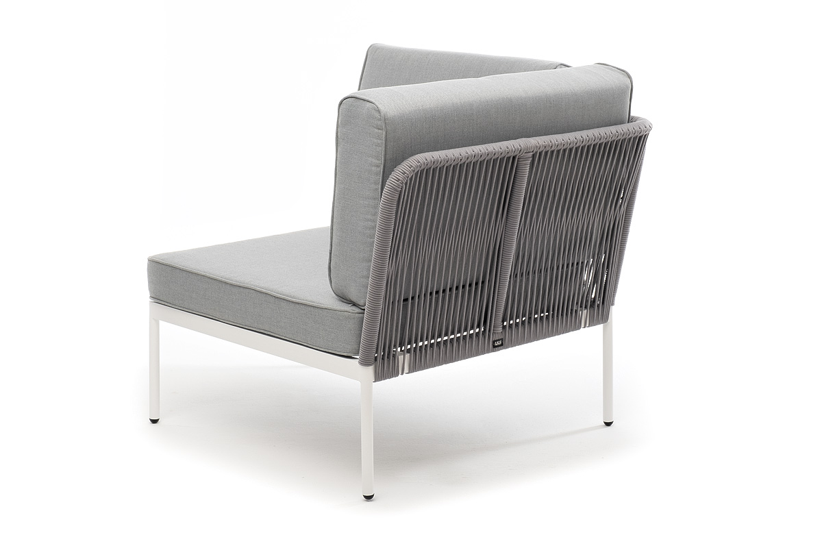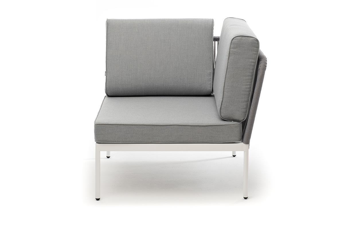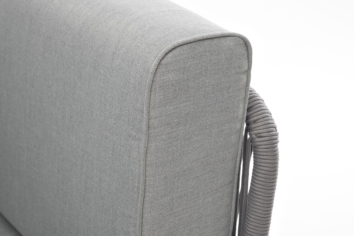 Плетеный модуль имеет алюминиевый каркас, окрашенный порошковой краской в белый цвет. Боковины каркаса вручную оплетены роупом - эластичными синтетическими лентами, изготовленными из высокопрочных полиэфирных волокон. Цвет оплетки - светло-серый.