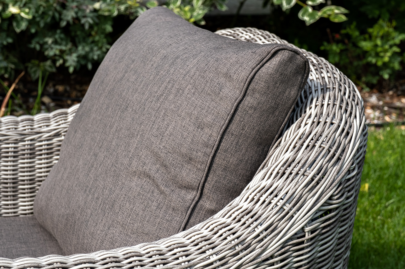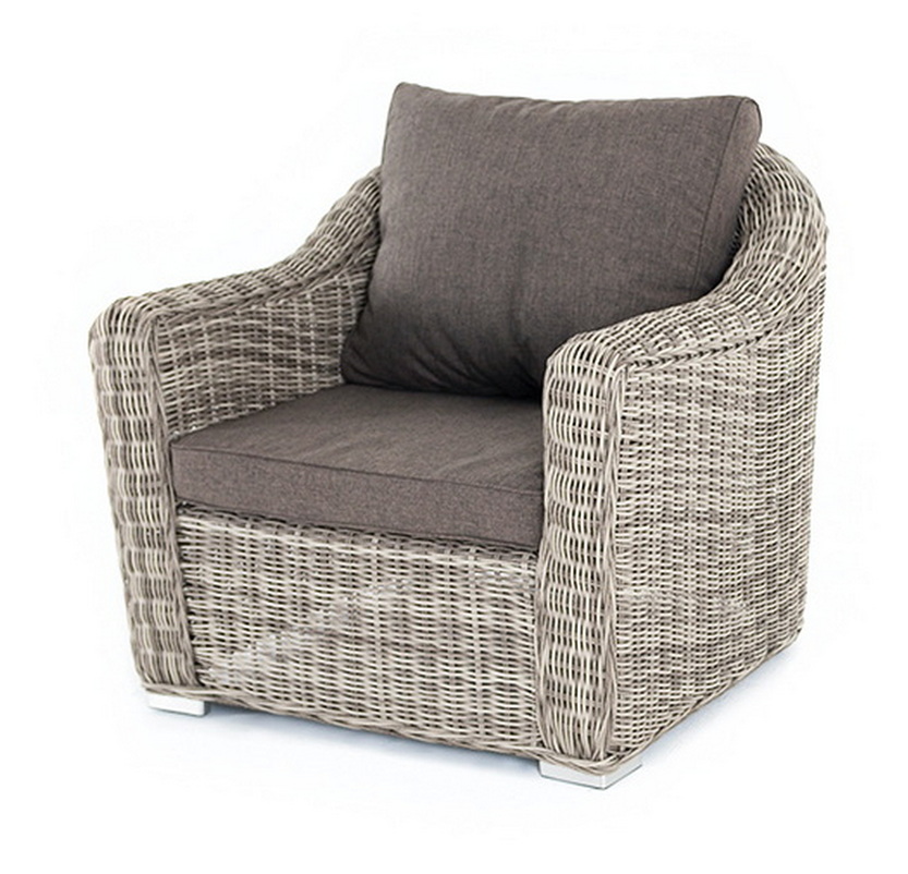 Кресло из круглого искусственного ротанга «Фабриция» произведено из прочного алюминиевого каркаса с ручным плетением серого цвета.