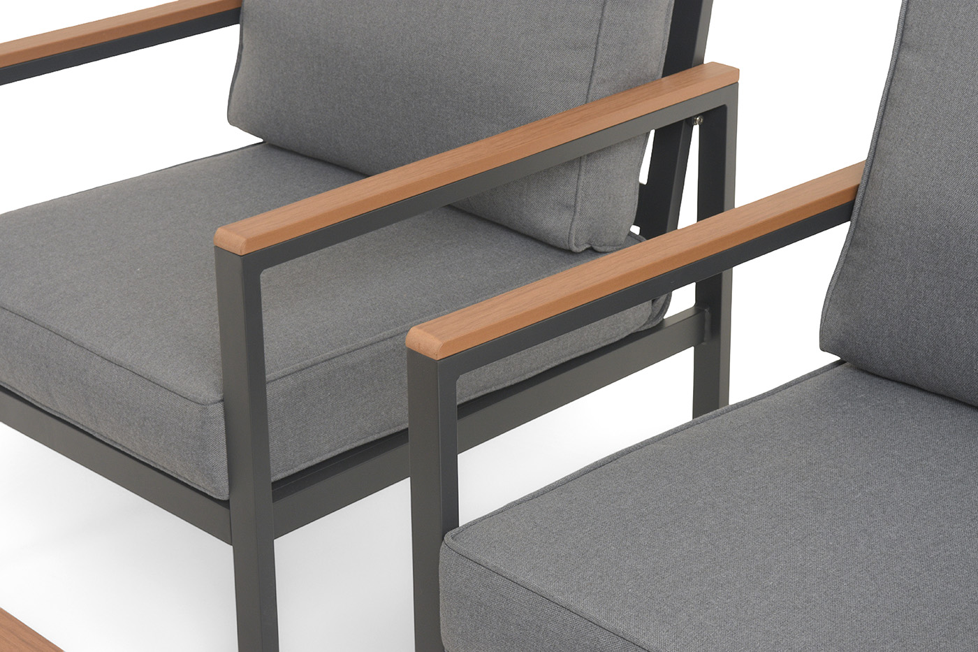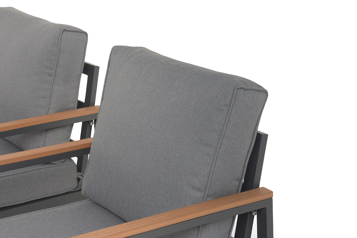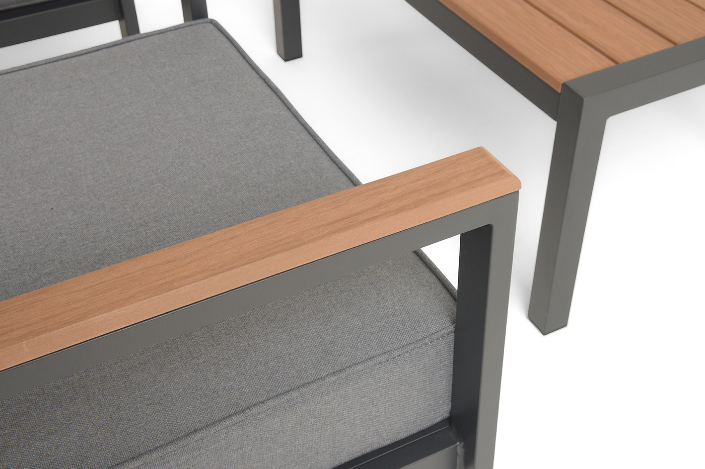 Каркас мебели выполнен из прочного алюминия темно-серого цвета. На подлокотниках дивана и двух кресел установлен облицовочный материал из древесно полимерного композита (ДПК) цвет «дерево». Крепление к каркасу осуществляется на болтах с пластиковыми заглушками темно-серого цвета, которые не ржавеют. Комплект дополняют подушки со съёмными чехлами. Материал чехлов - 100% полиэстер плотностью 190гр/м2.