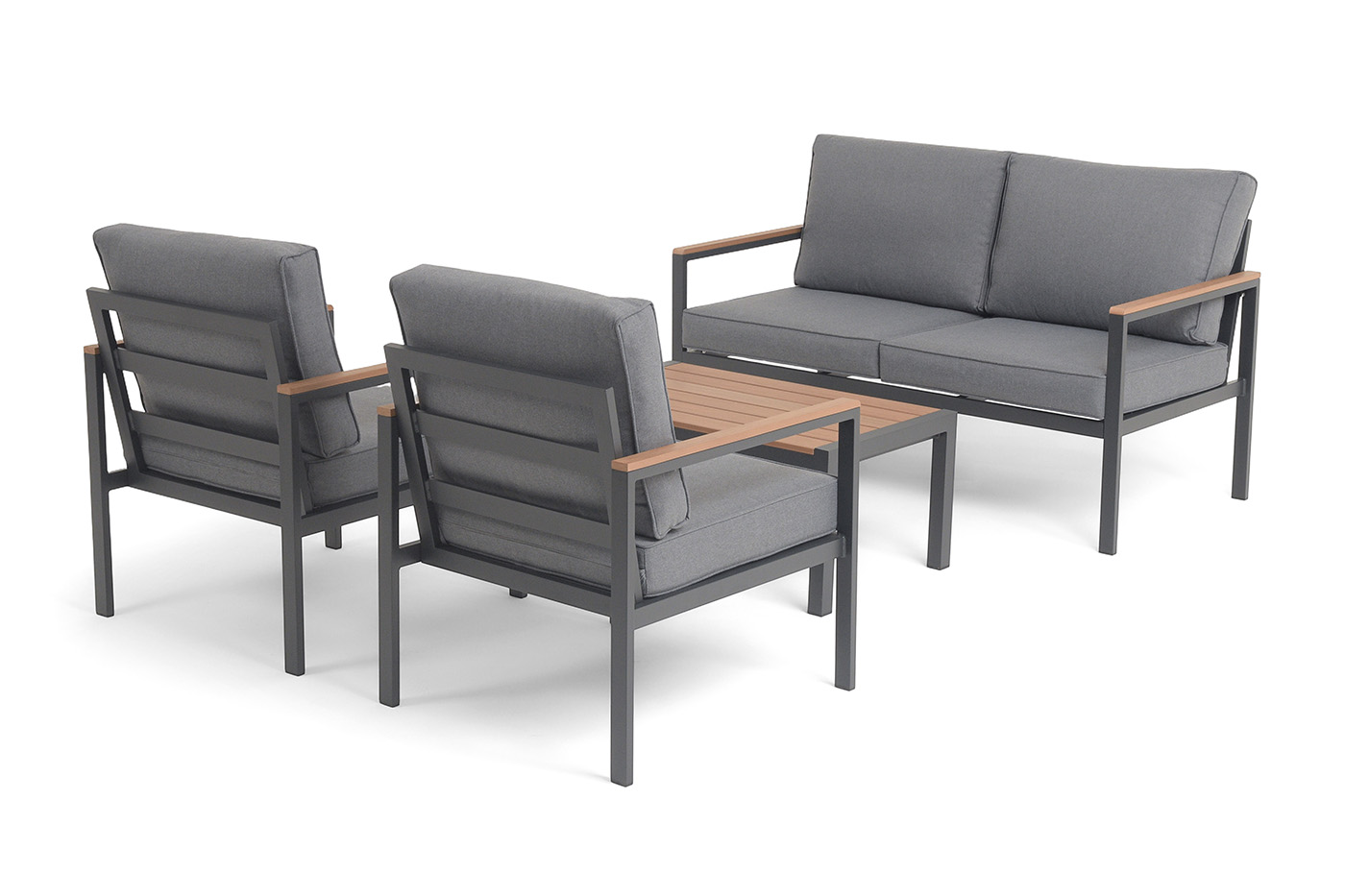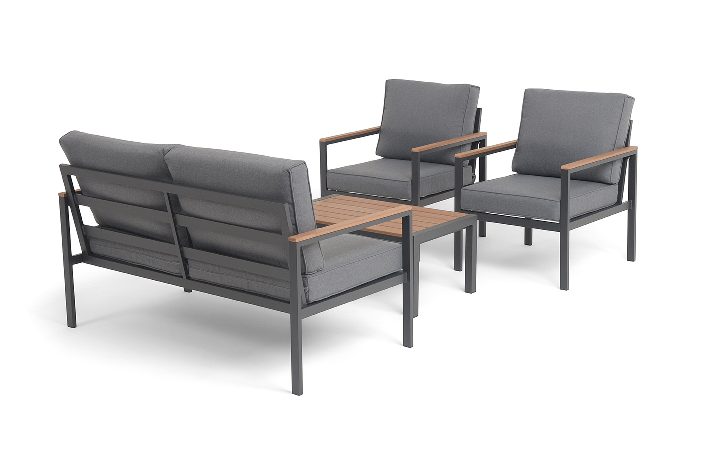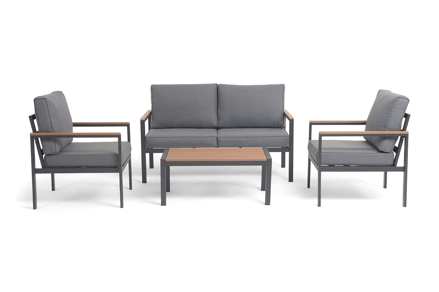 Каркас мебели выполнен из прочного алюминия темно-серого цвета. На подлокотниках дивана и двух кресел установлен облицовочный материал из древесно полимерного композита (ДПК) цвет «дерево». Крепление к каркасу осуществляется на болтах с пластиковыми заглушками темно-серого цвета, которые не ржавеют. Комплект дополняют подушки со съёмными чехлами. Материал чехлов - 100% полиэстер плотностью 190гр/м2.